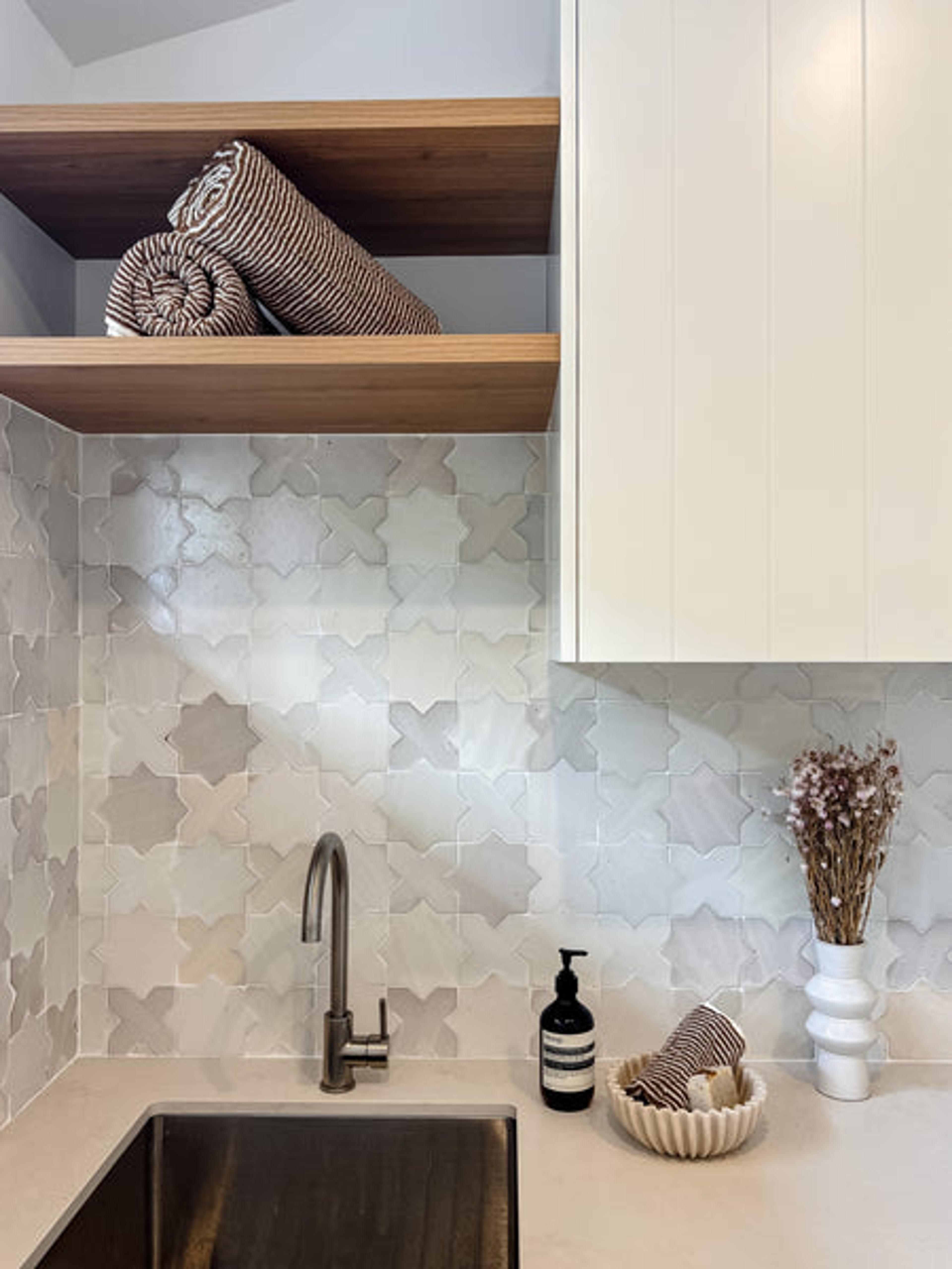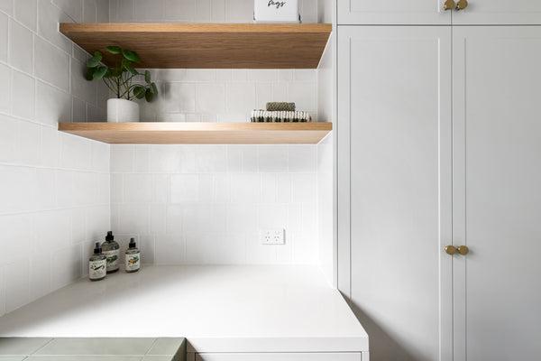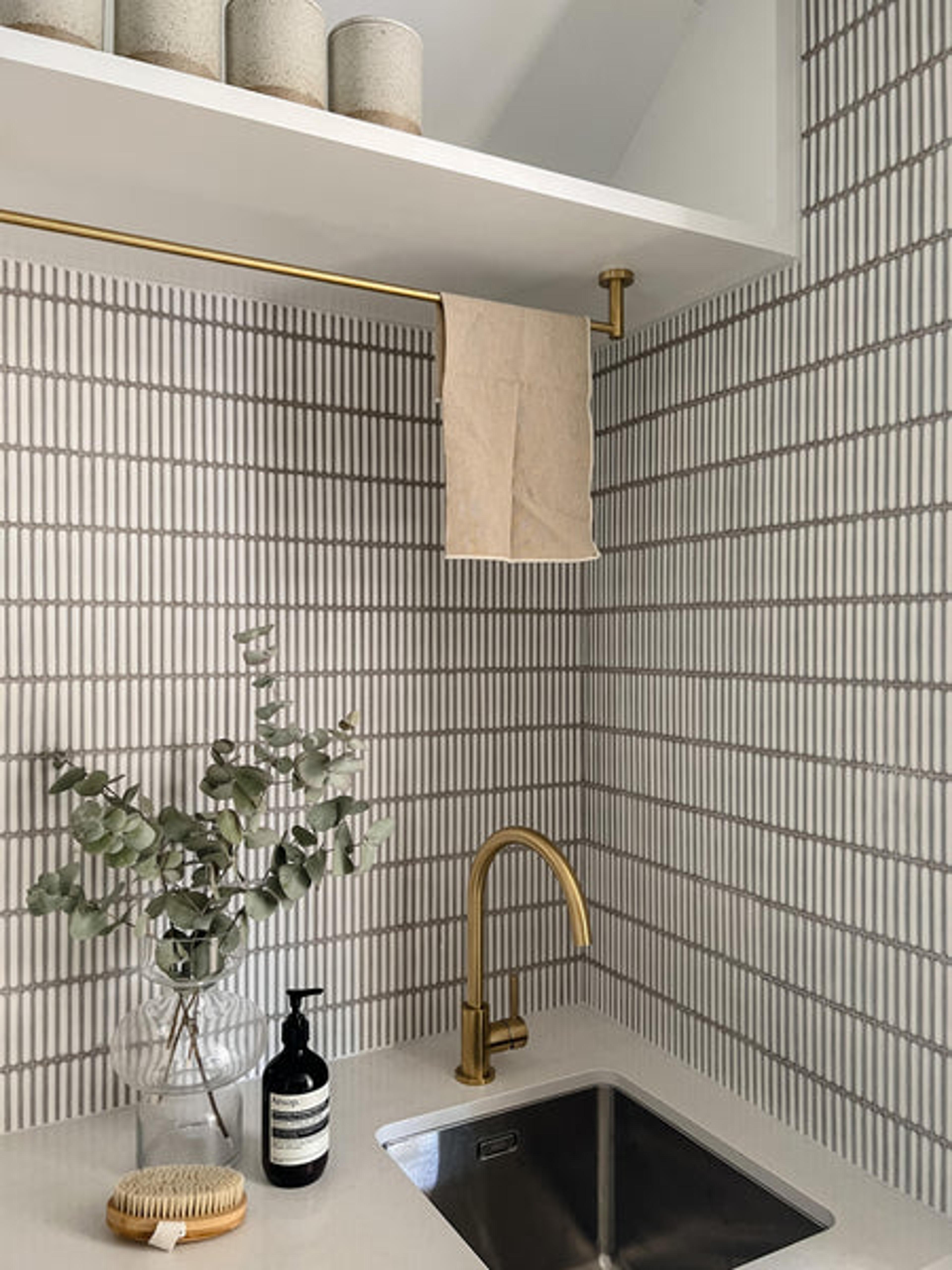 Tiles have a lot of pull when it comes to transforming a space. Coogee kit kats turn this laundry into something to look at. The white base really lets the tapware shine — a brushed brass tap and matching brass towel rail really pop in this space.