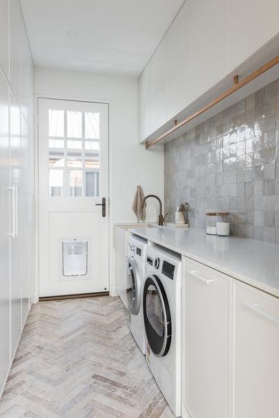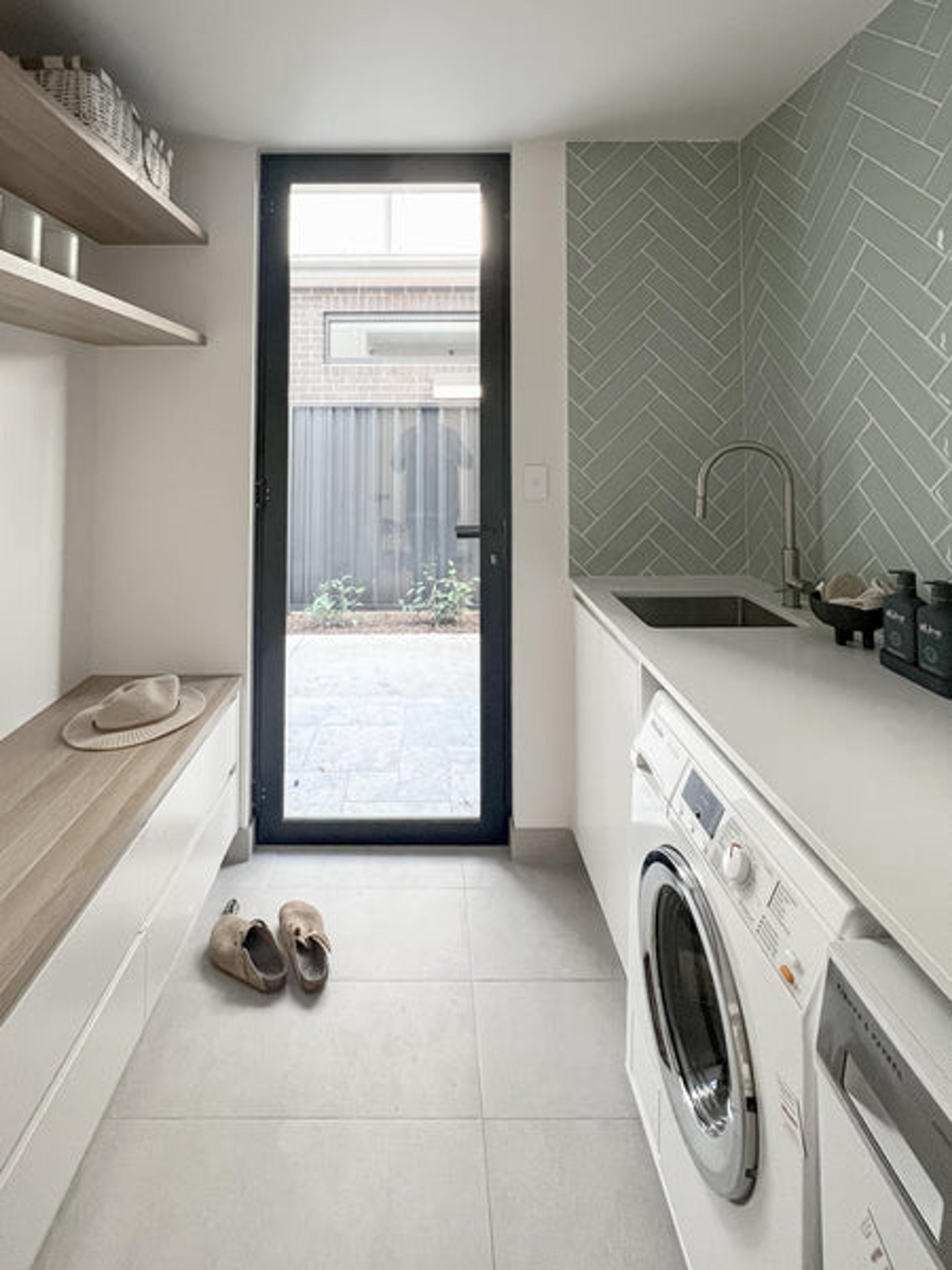 This home is making the most of its connecting room, transforming it into a mix of laundry and mudroom in the best way possible. The glass door, glossy Newport tiles, large floor tiles and chrome tapware work to create a light and harmonious space.