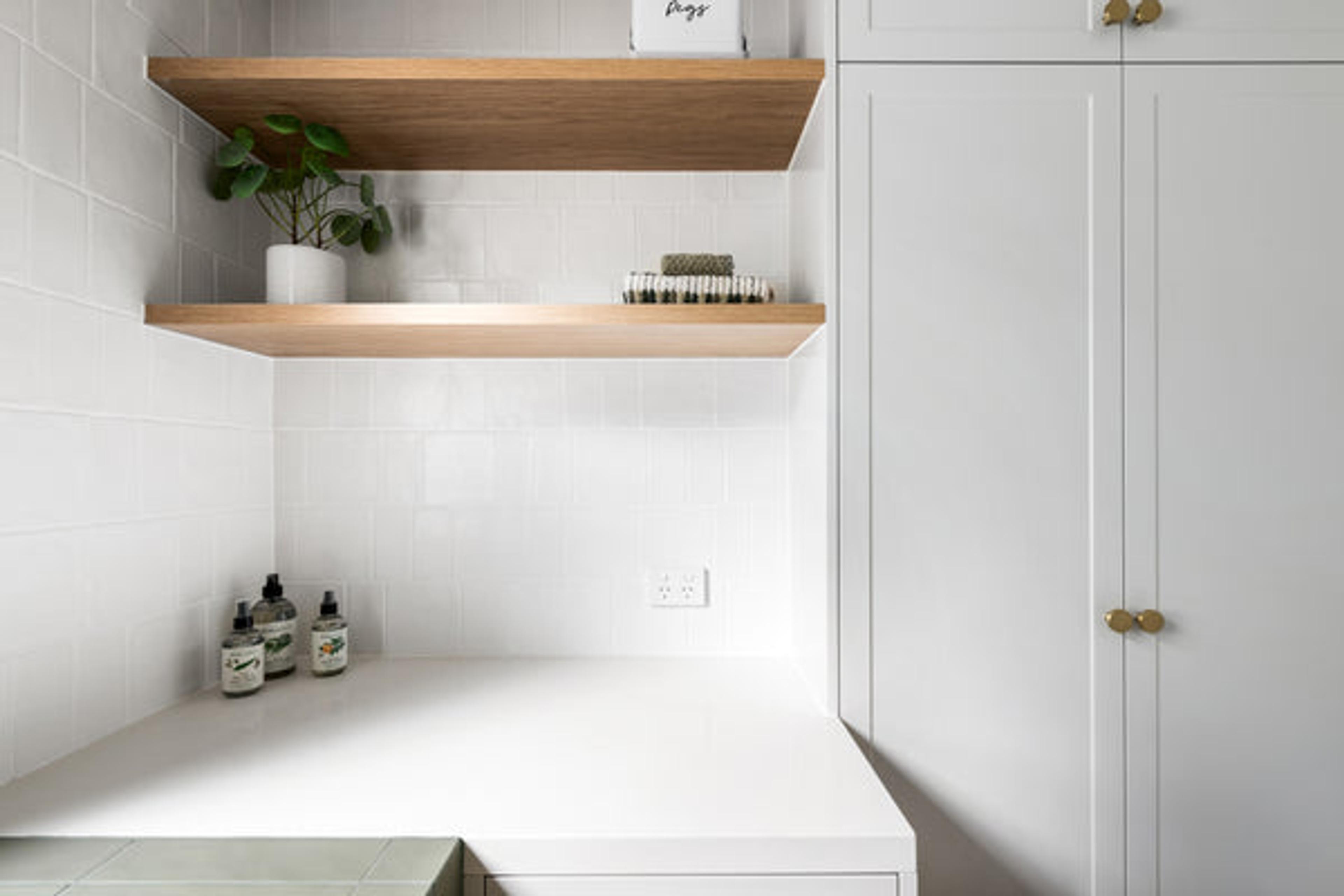 Looking for laundry storage ideas? This laundry room uses a creative combo of closed cabinets and open shelving to give plenty of storage with an airy feel. This leaves space on the bench for decorative items.