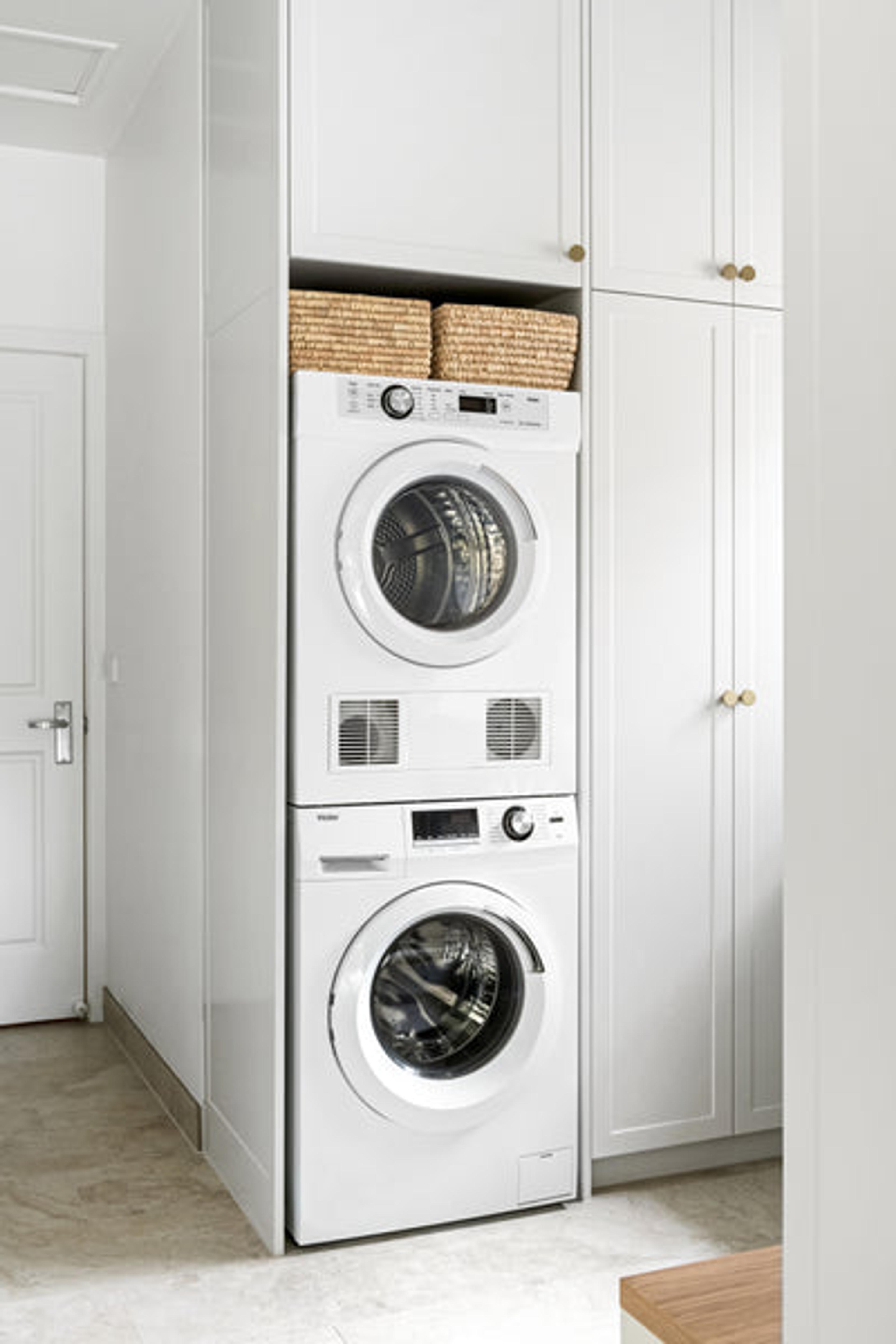 If your laundry is on the smaller side, a stacked washer/dryer combo will be your best friend. With tall cabinets and simple but statement-making brushed brass cabinet knobs, this laundry feels minimal, open and clean.