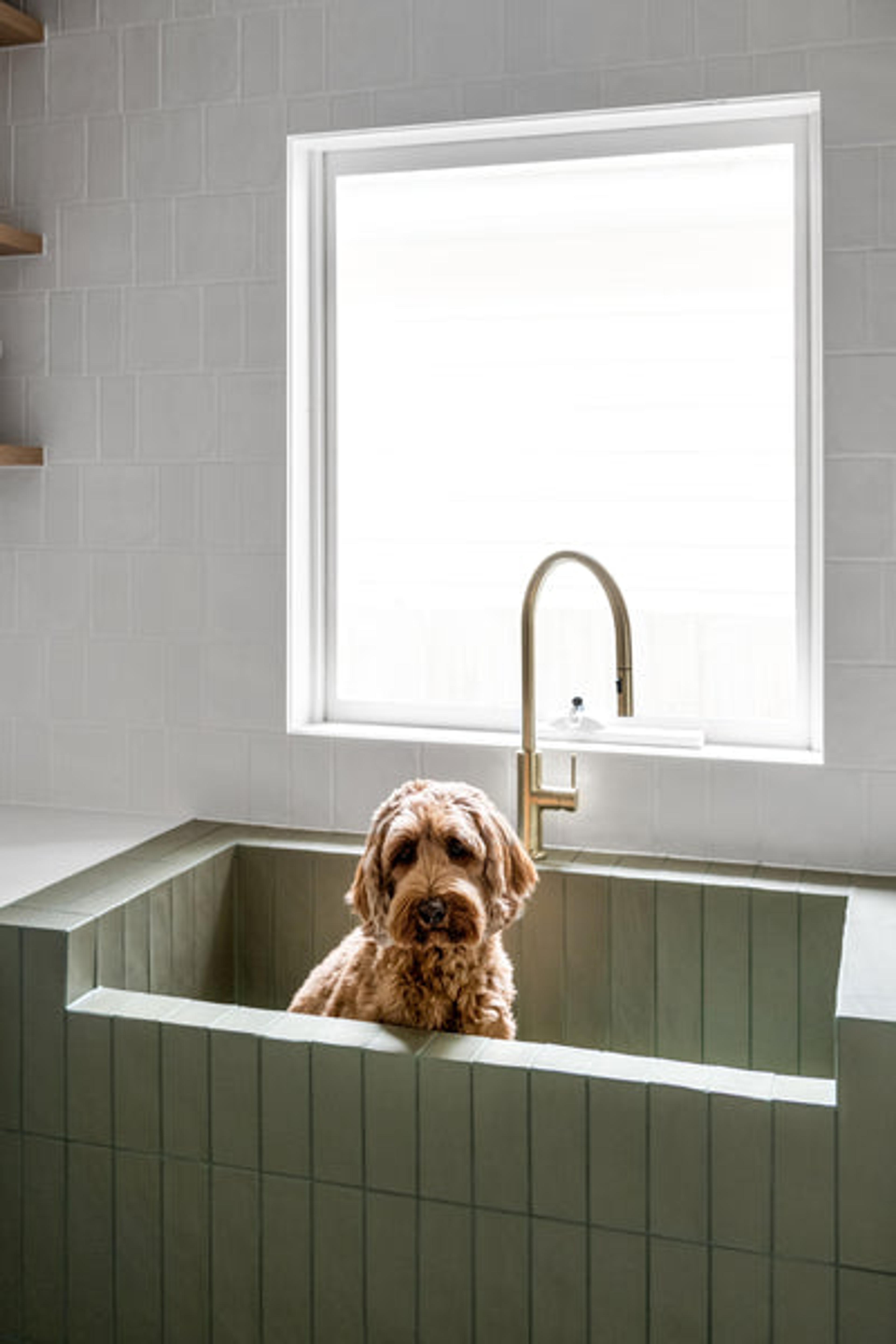 Talk about a statement sink — we are in awe. A green subway-tiled sink is not something you see every day, but it works beautifully against a backdrop of white square and subway tiles and brushed brass tapware.