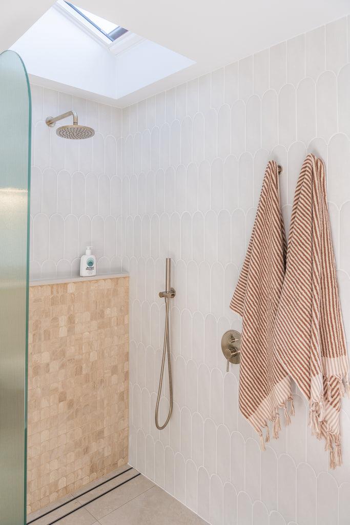 Good ventilation is key to a coastal feel. Opt for open shelving to maximise space and airflow, creating a light and breezy atmosphere reminiscent of the seaside. The best part about open shelving is that you can display towels, woven baskets and decorative elements for a laid-back feel.