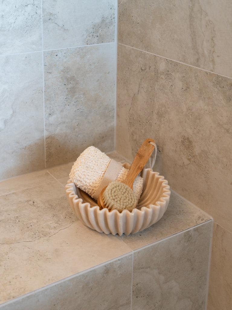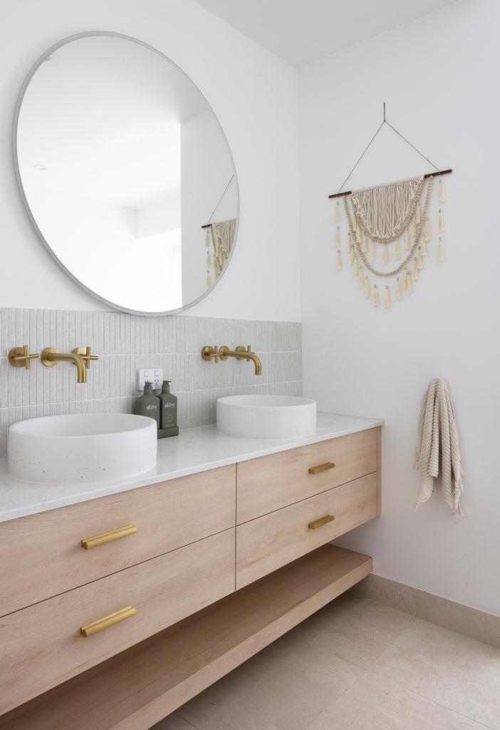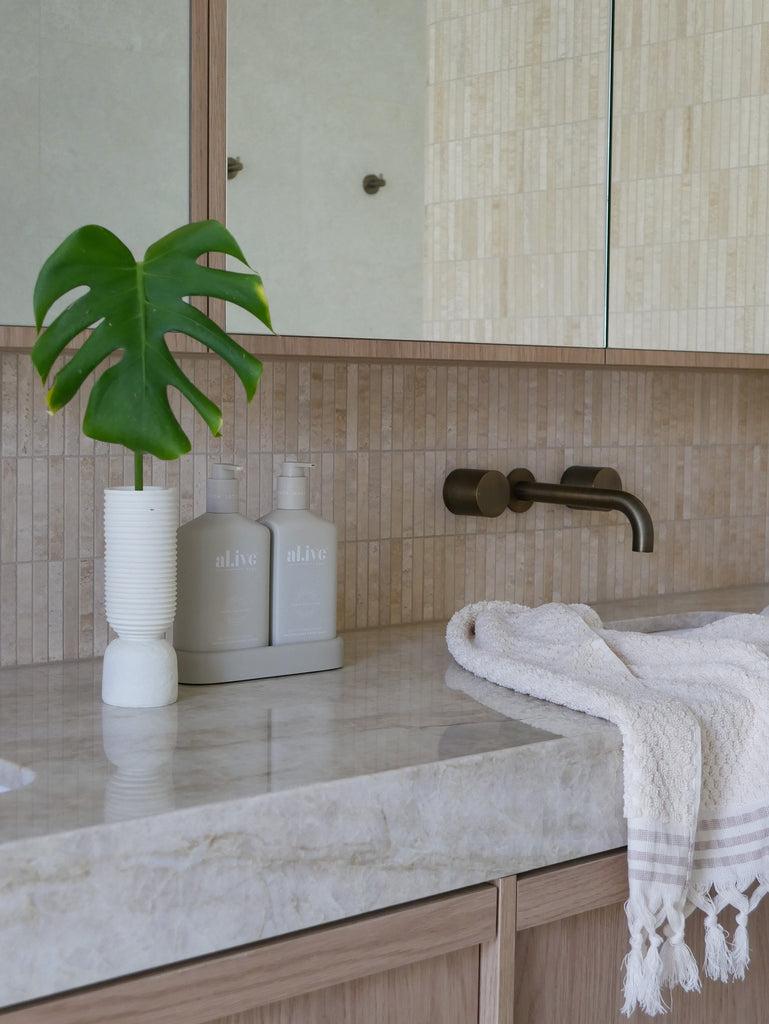 Breathe life into your bathroom with pops of greenery to add a touch of nature’s beauty. Suspend trailing plants from macrame hangers or ferns on open shelves. Timber accessories, such as a catchall or teak stool, also add organic warmth.