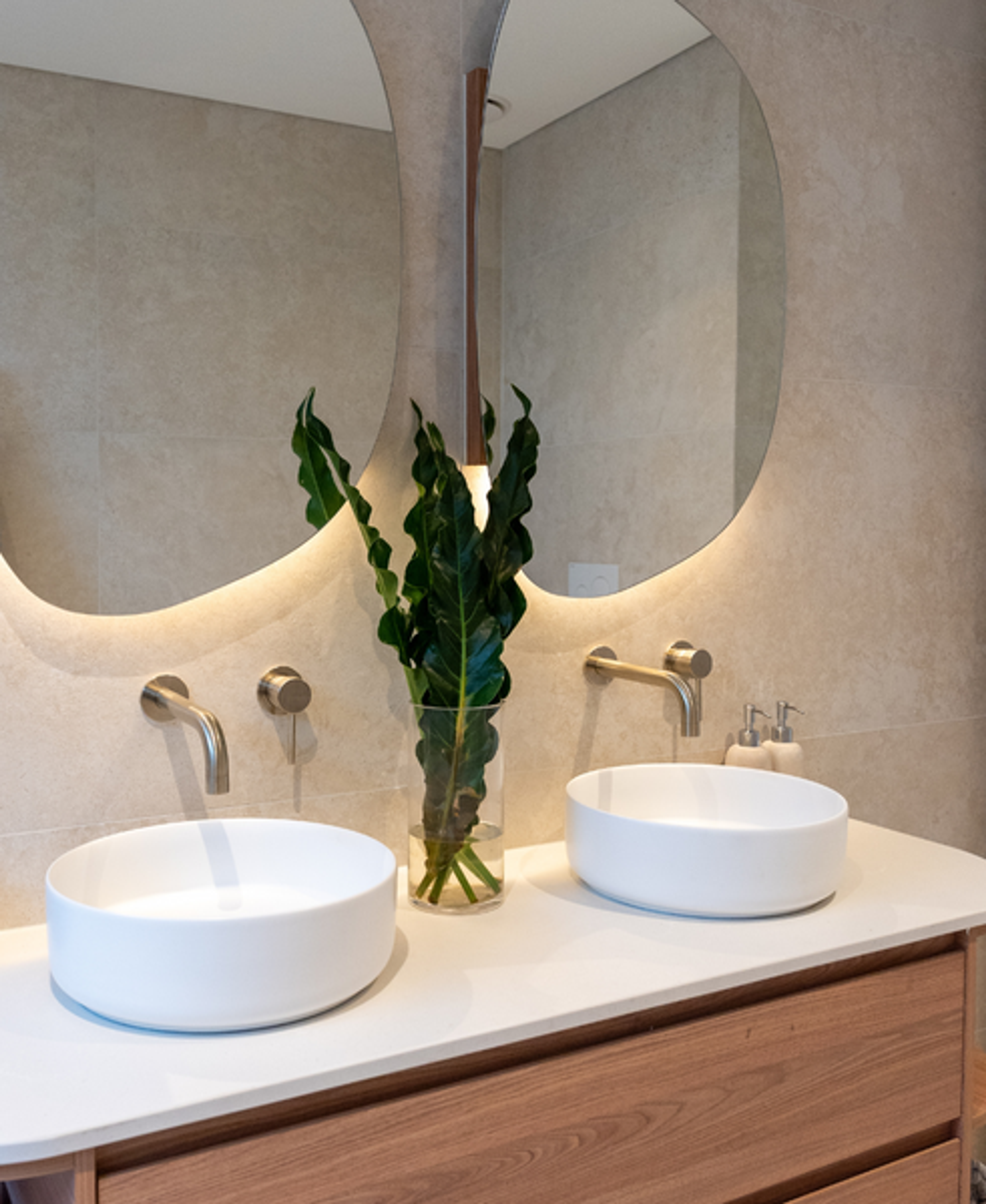 When incorporating downlights in your space it is important that you get the placement right, avoid downlighting directly over the mirror, as it can cast unflattering shadows on the face. You want your bathroom lighting to emulate natural lighting, especially for tasks like applying makeup and shaving.