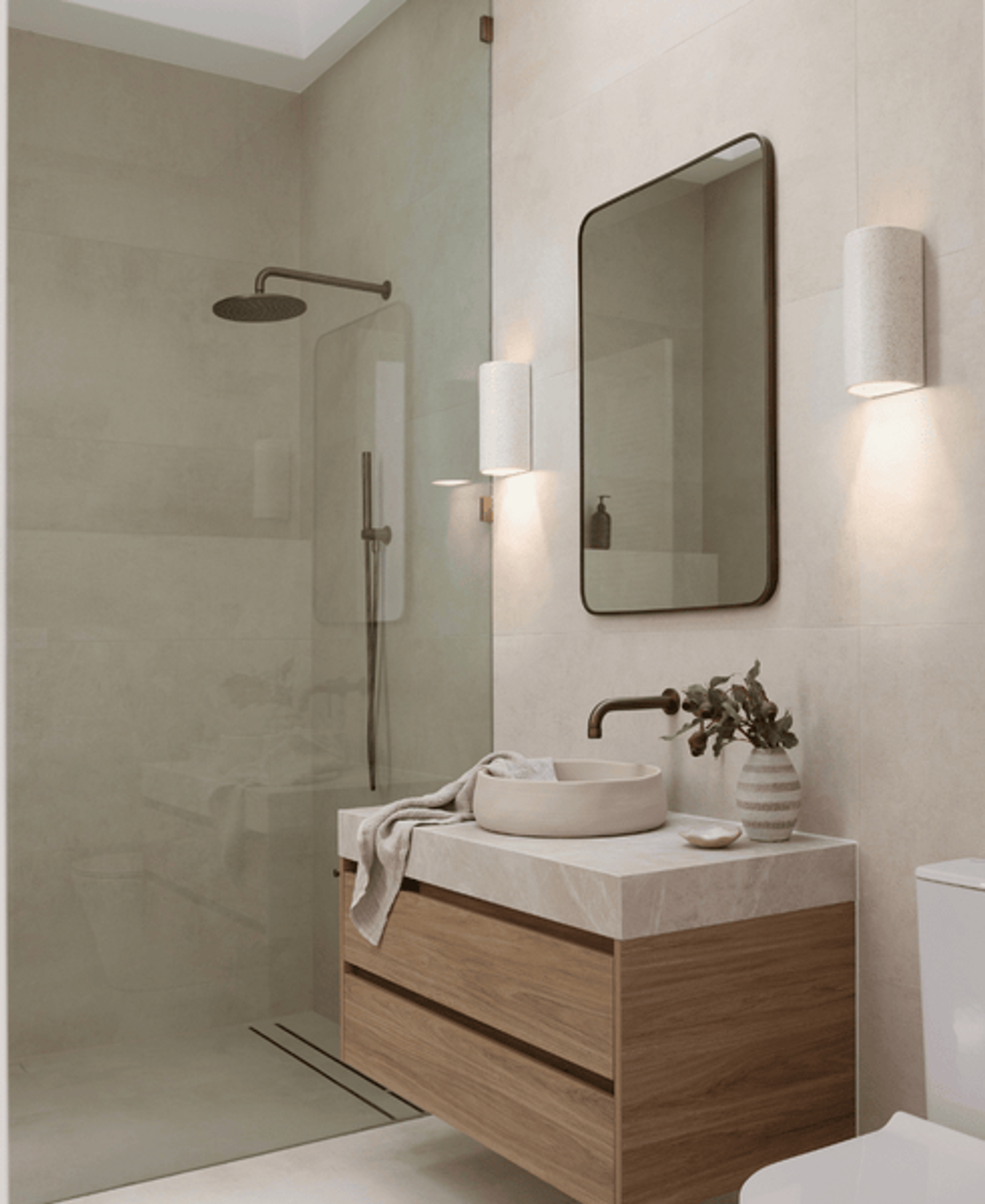 It can be easy to overwhelm the space with light fixtures that are simply too large. One way you can avoid this is by incorporating recessed ceiling lights into the bathroom design as they are a lot more seamless and subtle but keep the room well lit. These provide even illumination without cluttering the space.