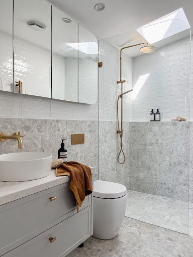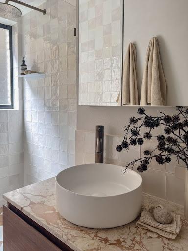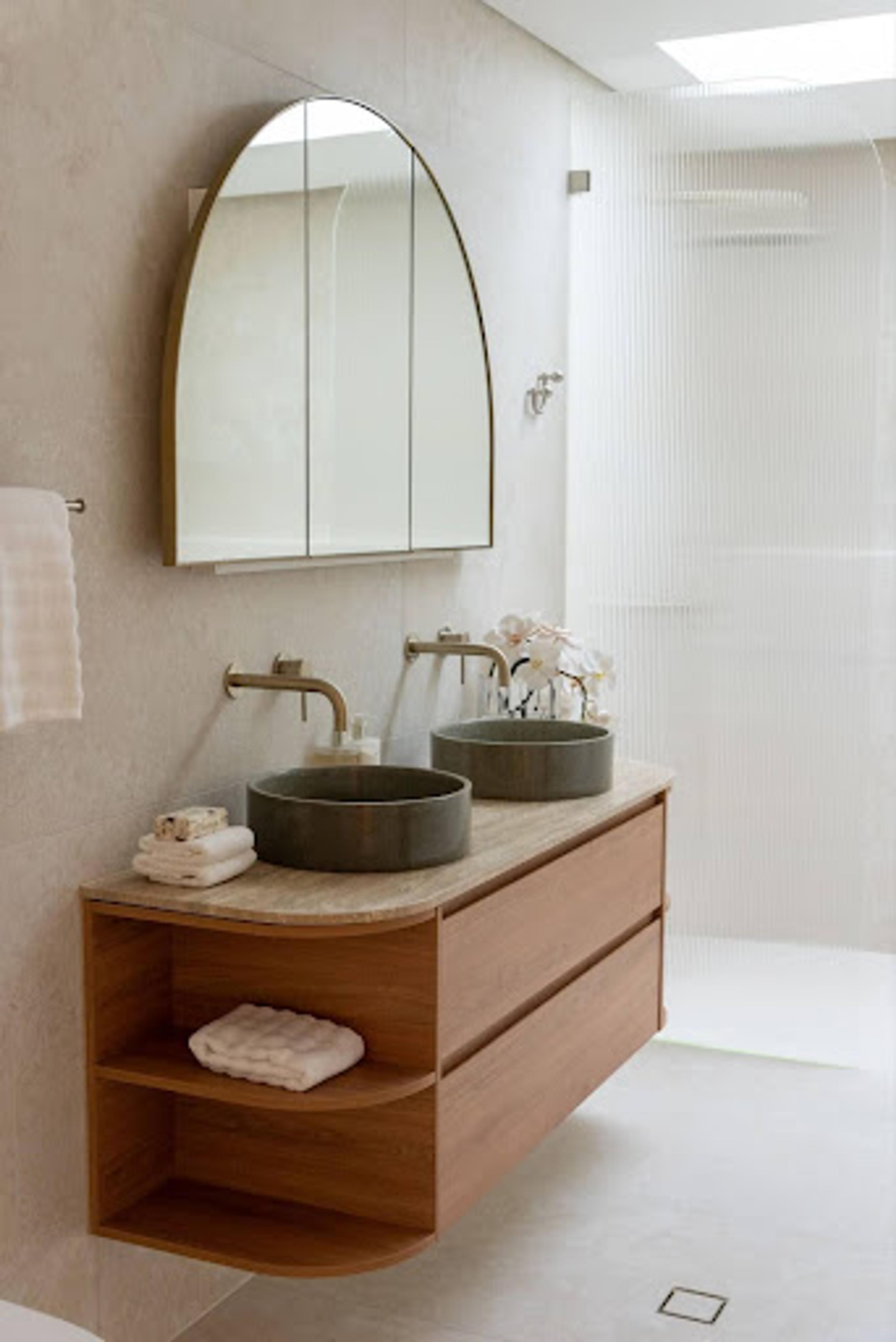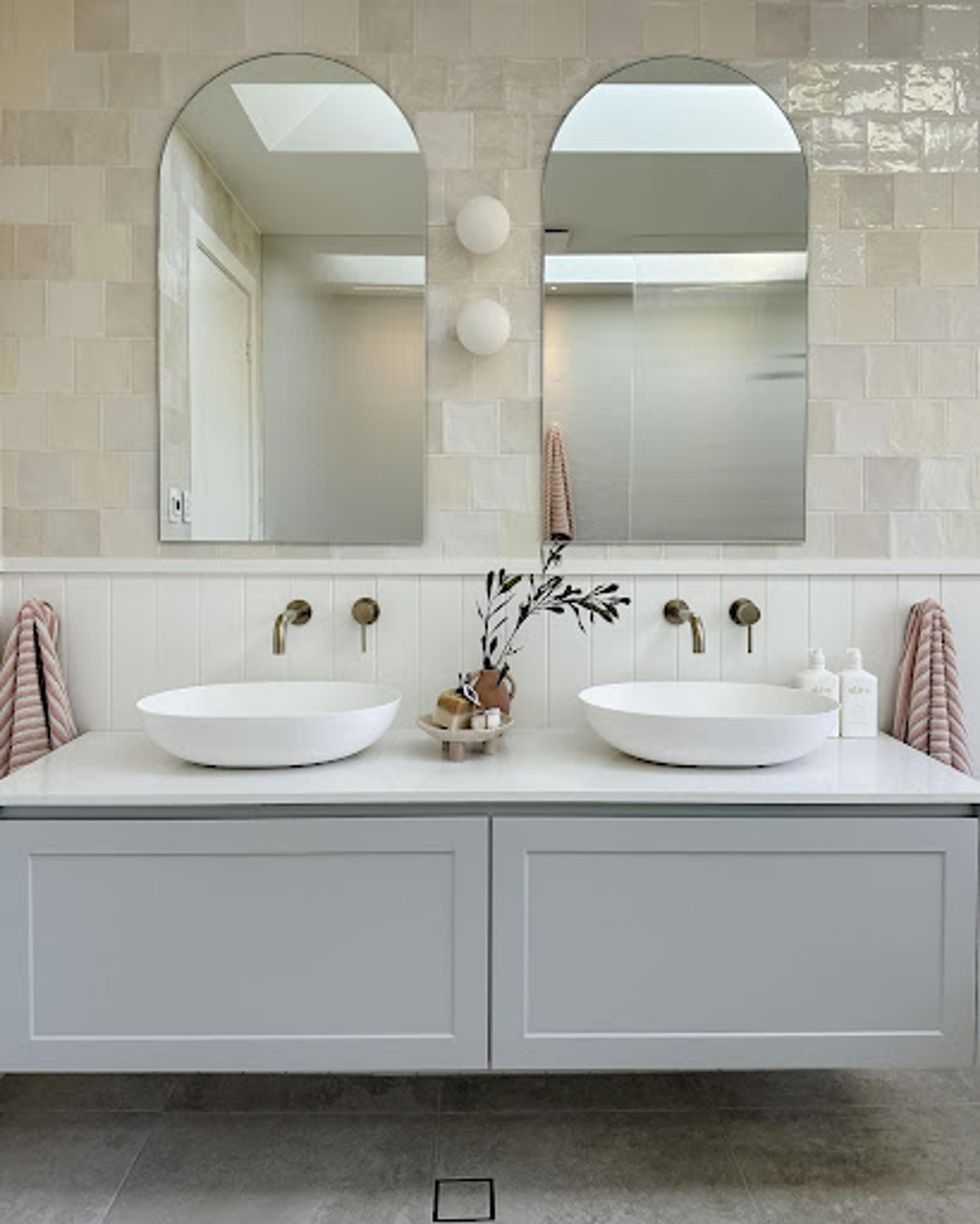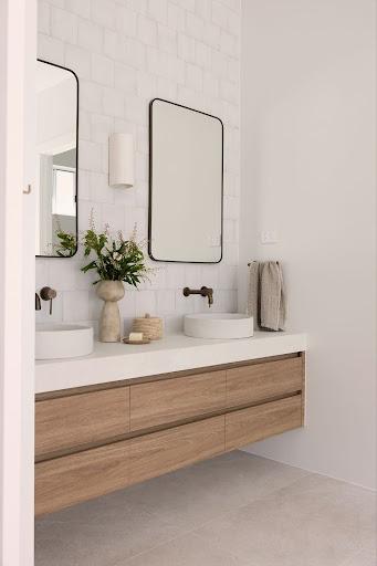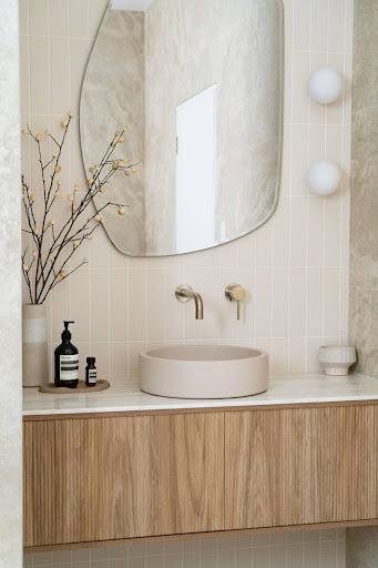 Keep your finishes consistent across your choices. If you’ve chosen brass tapware, consider a brass-framed mirror or incorporate brass details into your styling tray. Complementary textures work too, for example, timber with ceramic, glass with metal or stone with brass all create beautiful layers without competing.