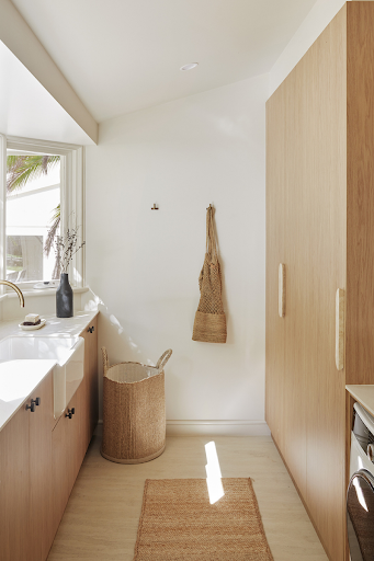Open shelving brings storage to any laundry space while creating opportunities for both function and style. Use timber shelving for warmth and natural texture, then incorporate neat baskets to hide less attractive necessities. Add a few plants or decorative items to make the space feel more welcoming and less utilitarian. Voila, the humble laundry has had a glow-up without a full-blown laundry renovation.