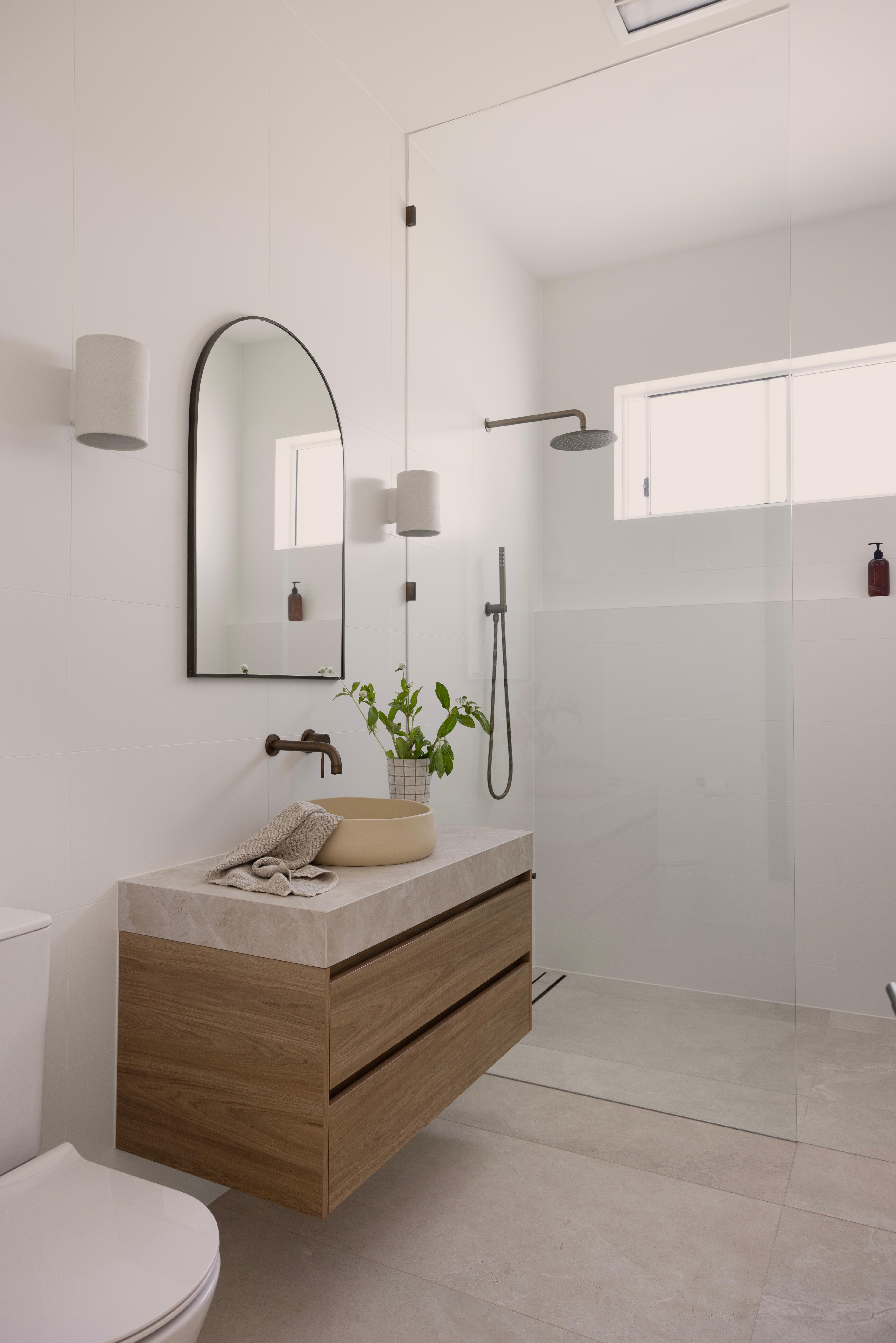 We don’t just mean stick to white; neutral, organic tones work too and can add warmth to your bathroom.