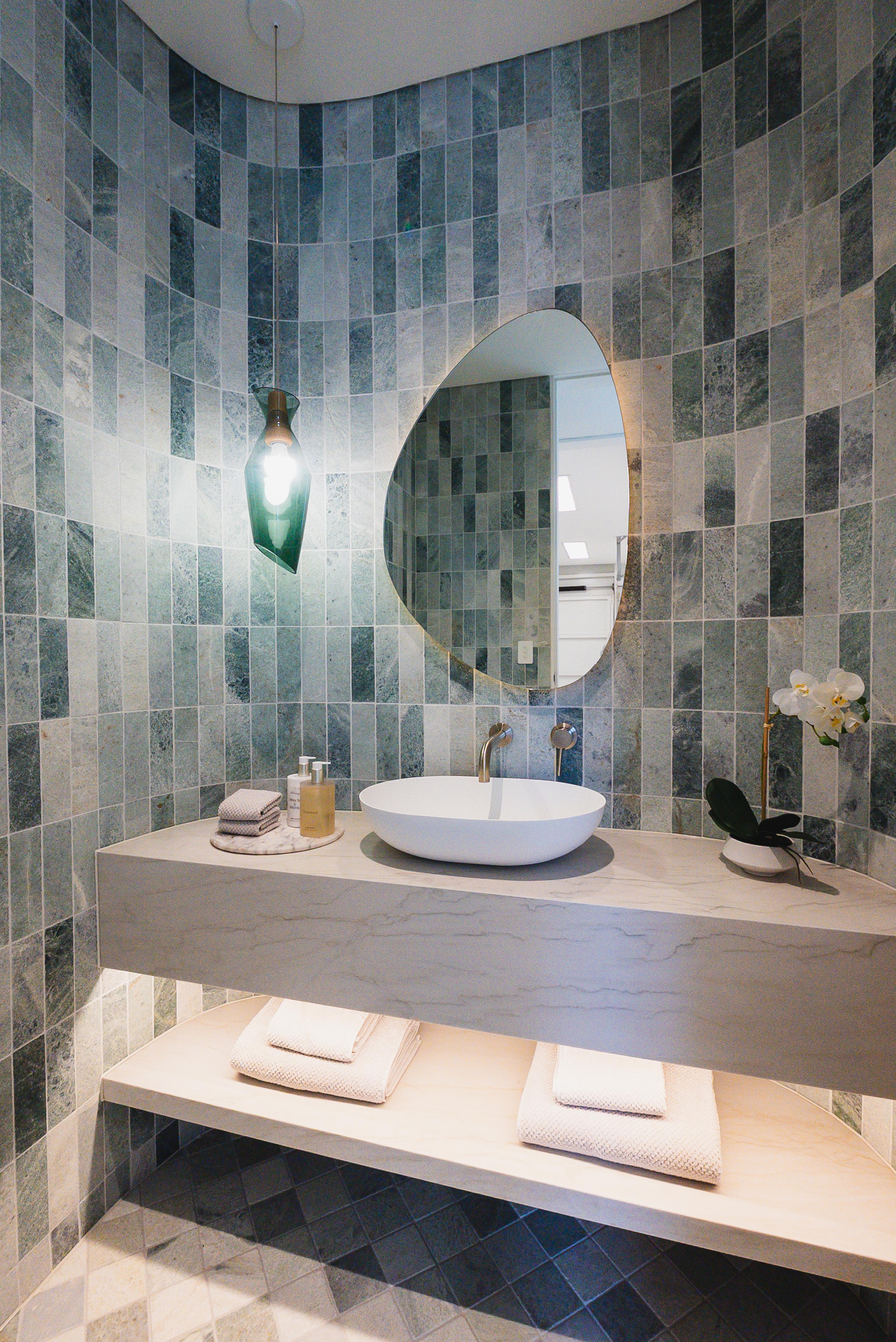 If you’re upgrading a pre-existing space, you need to start by looking at what you won’t be changing. Fixed features like floors, cabinets, vanities and furniture should guide your choices. Pull colours from these elements to create a considered style that suits your taste and the rest of your home.