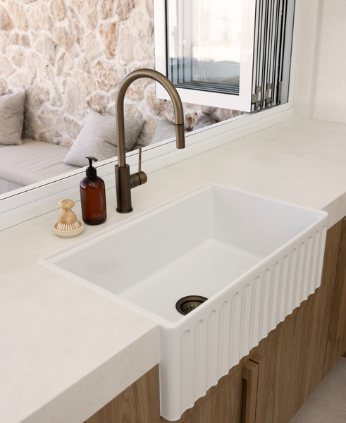 Swap plastic bottles for stylish soap dispensers filled with dish liquid or hand wash. Ceramic, amber glass, or matte black dispensers can look more appealing than standard bottles. Add a small tray to hold these items along with a scrubber or sponge in a complementary colour for a kitchen bench styling idea that's practical but put-together.