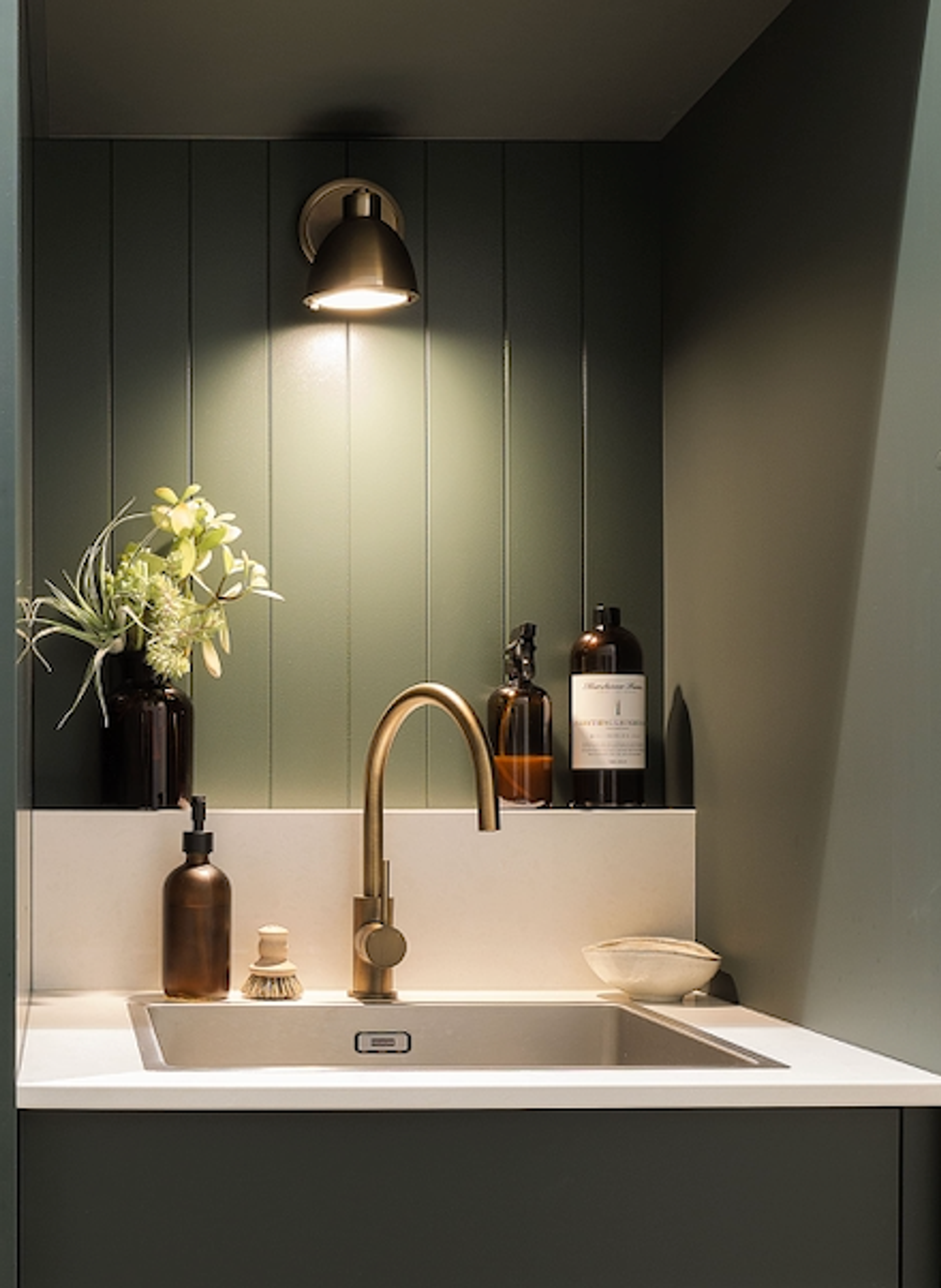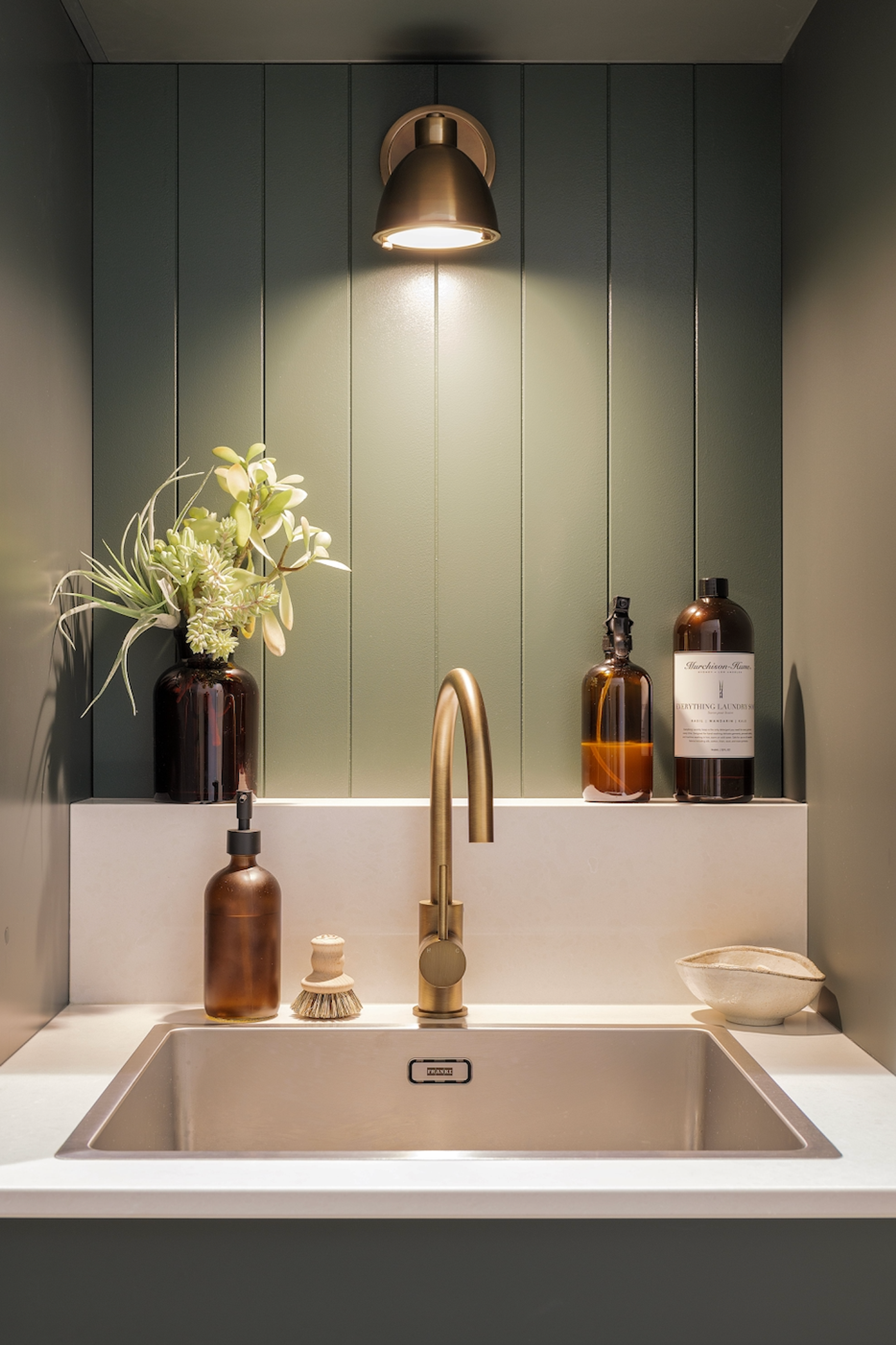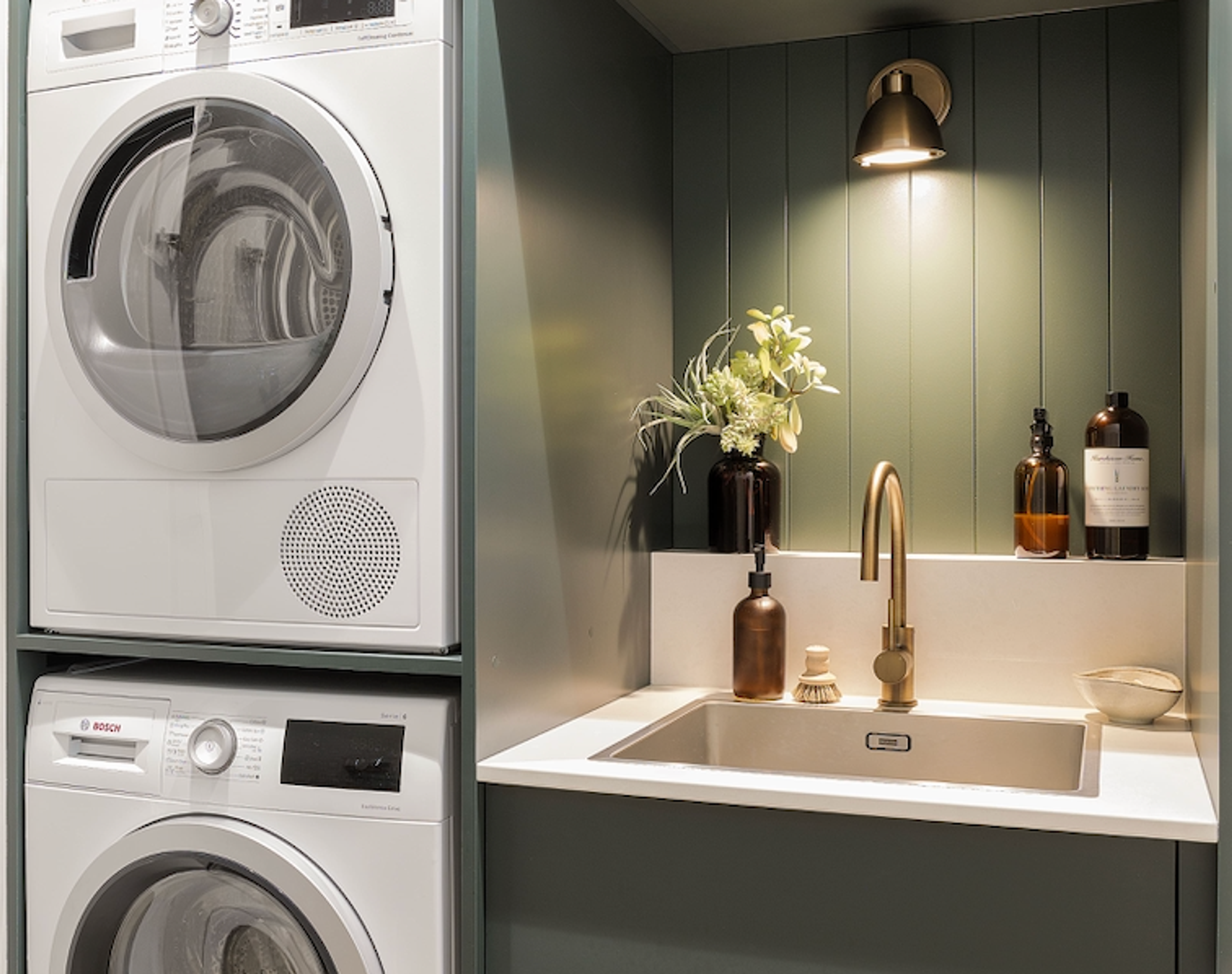 The star of the show, in our humble opinion (ahem), is the Yabby Antique Brass Round Kitchen Mixer, which adds a touch of vintage appeal to the laundry. The warm hue of the mixer perfectly complements the green cabinetry, creating a cohesive look.