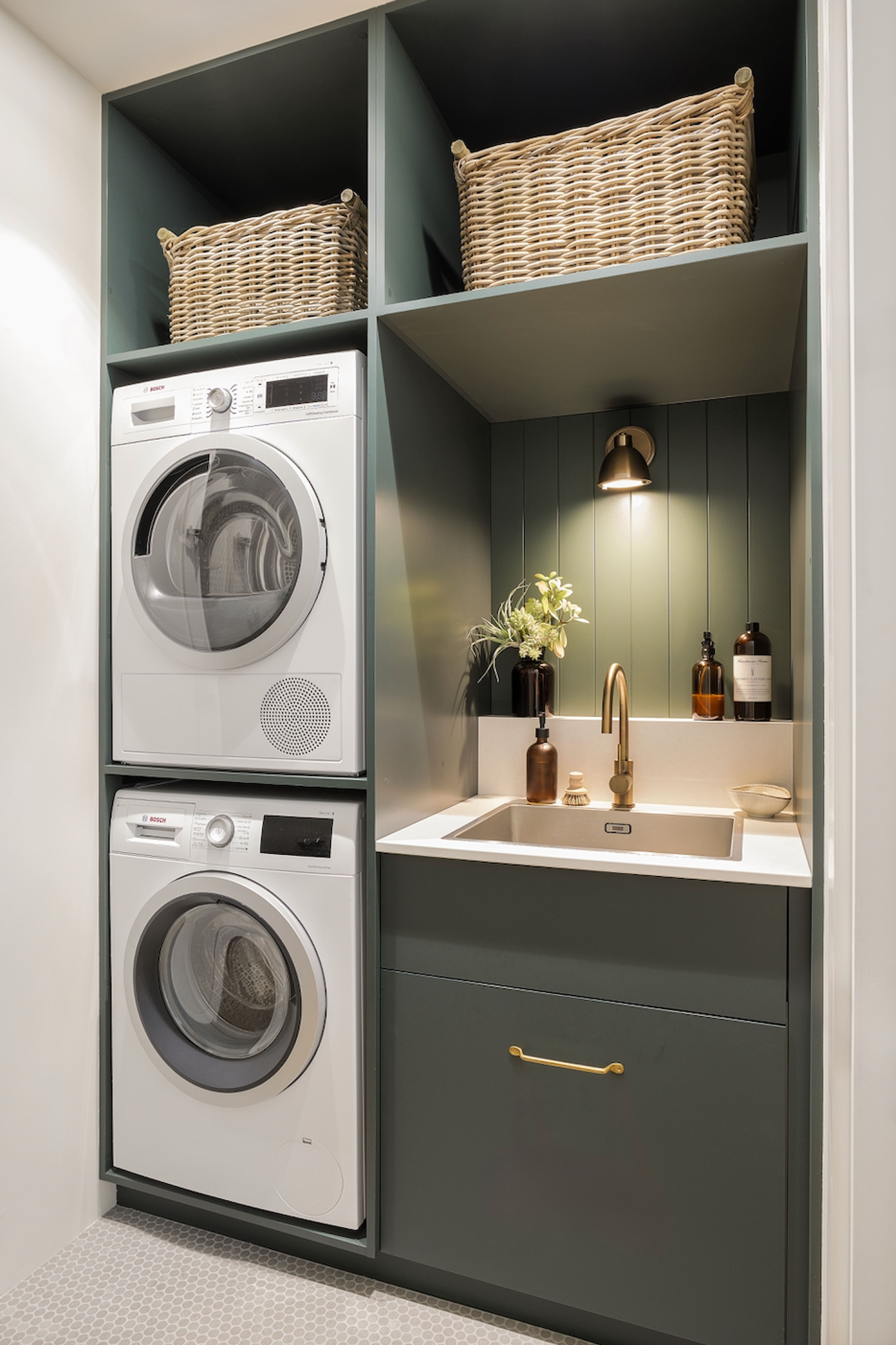 The deep forest green cabinetry creates an eye-catching contrast against the crisp white walls, creating a clean and inviting atmosphere — perfect for a laundry room. The use of woven baskets on the open shelves adds a touch of warmth and texture to the space while also offering practical storage solutions for laundry essentials.