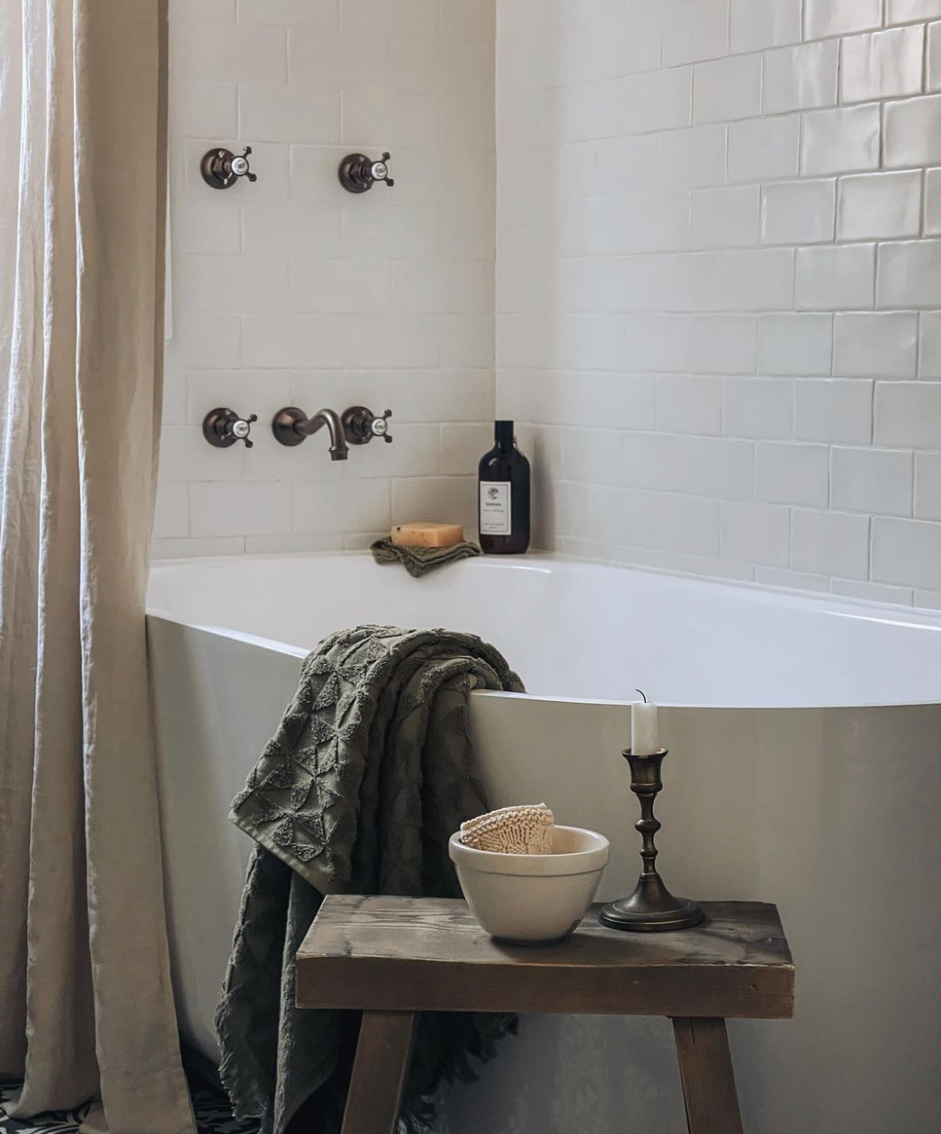 Don’t be afraid to use cosy textiles to add softness and comfort to your rustic farmhouse bathroom and make the room as inviting as possible. Cosy textiles like cotton or linen curtains, which match the natural colour palette, are highly encouraged for this space.