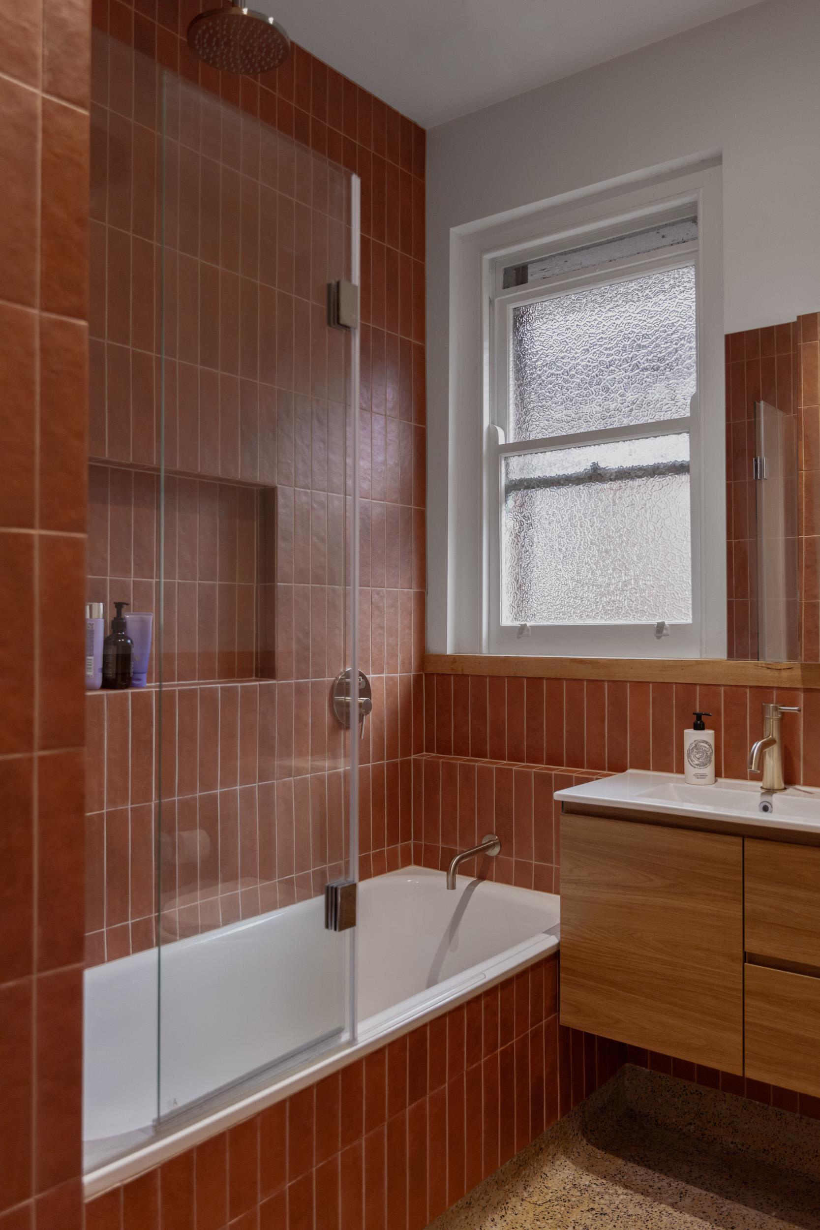 Earthy shades like muted browns, terracotta and warm beige give a bathroom a welcoming, grounded feel. Even small touches of yellow or brass-toned fixtures can make the space feel uplifting and more inviting.