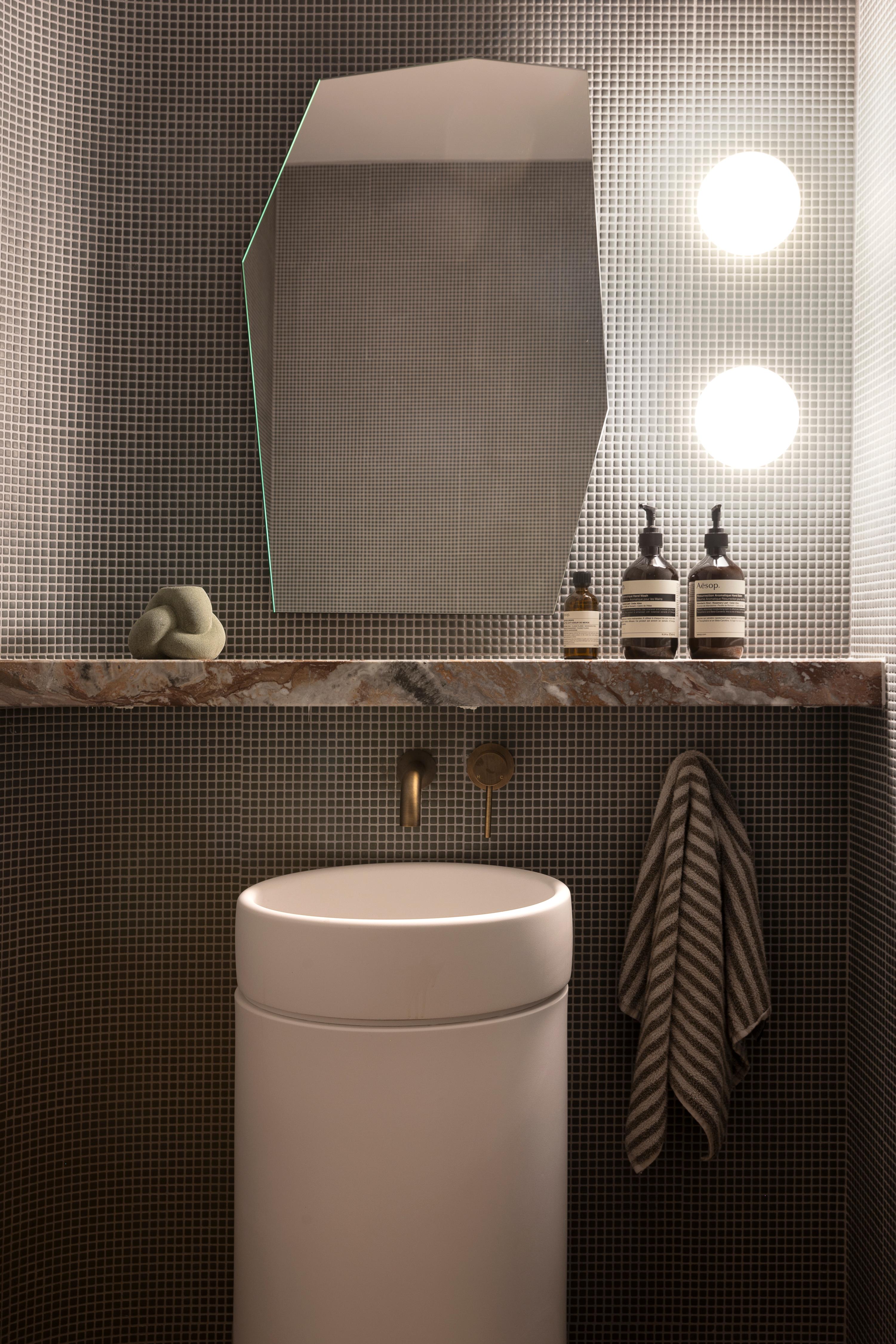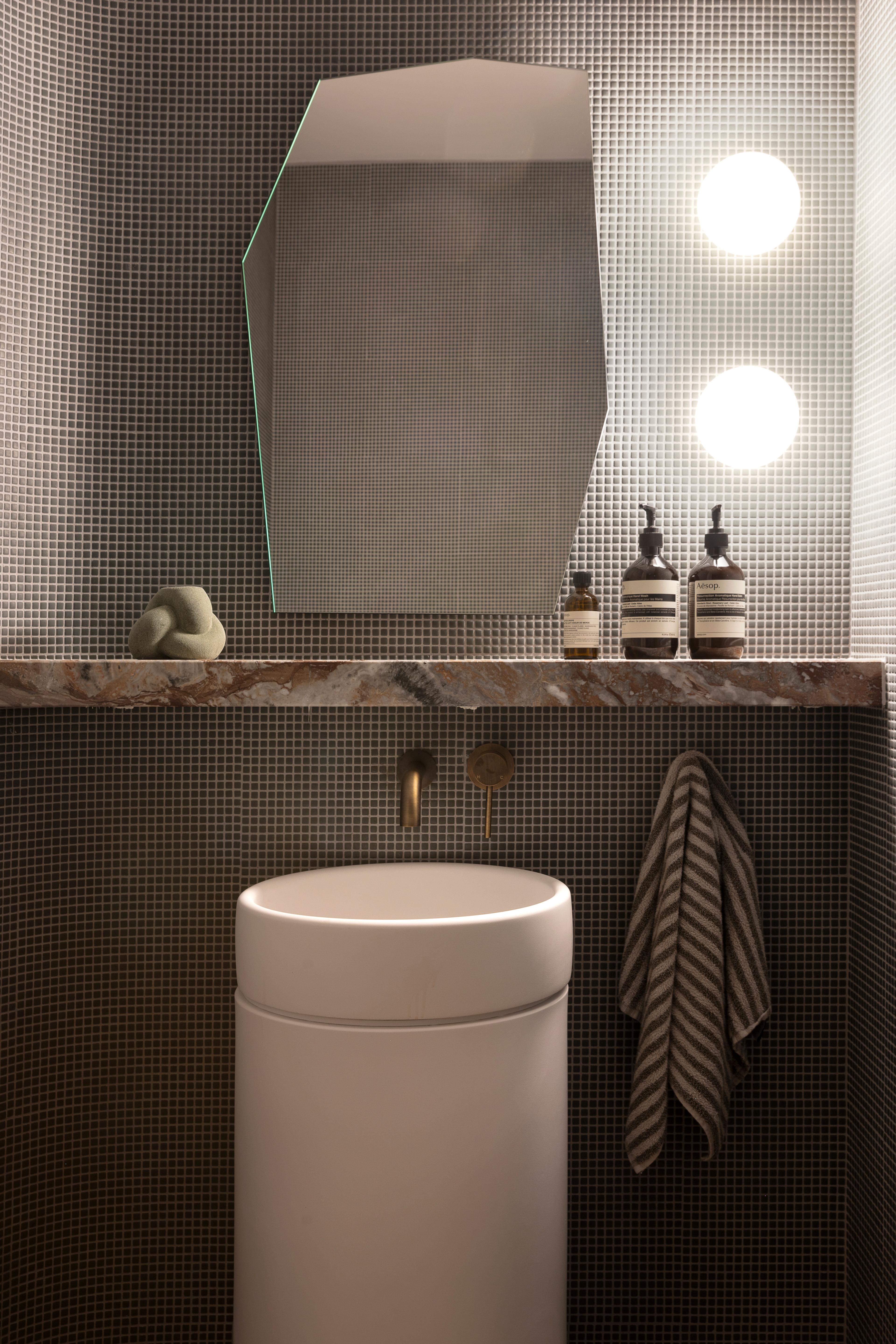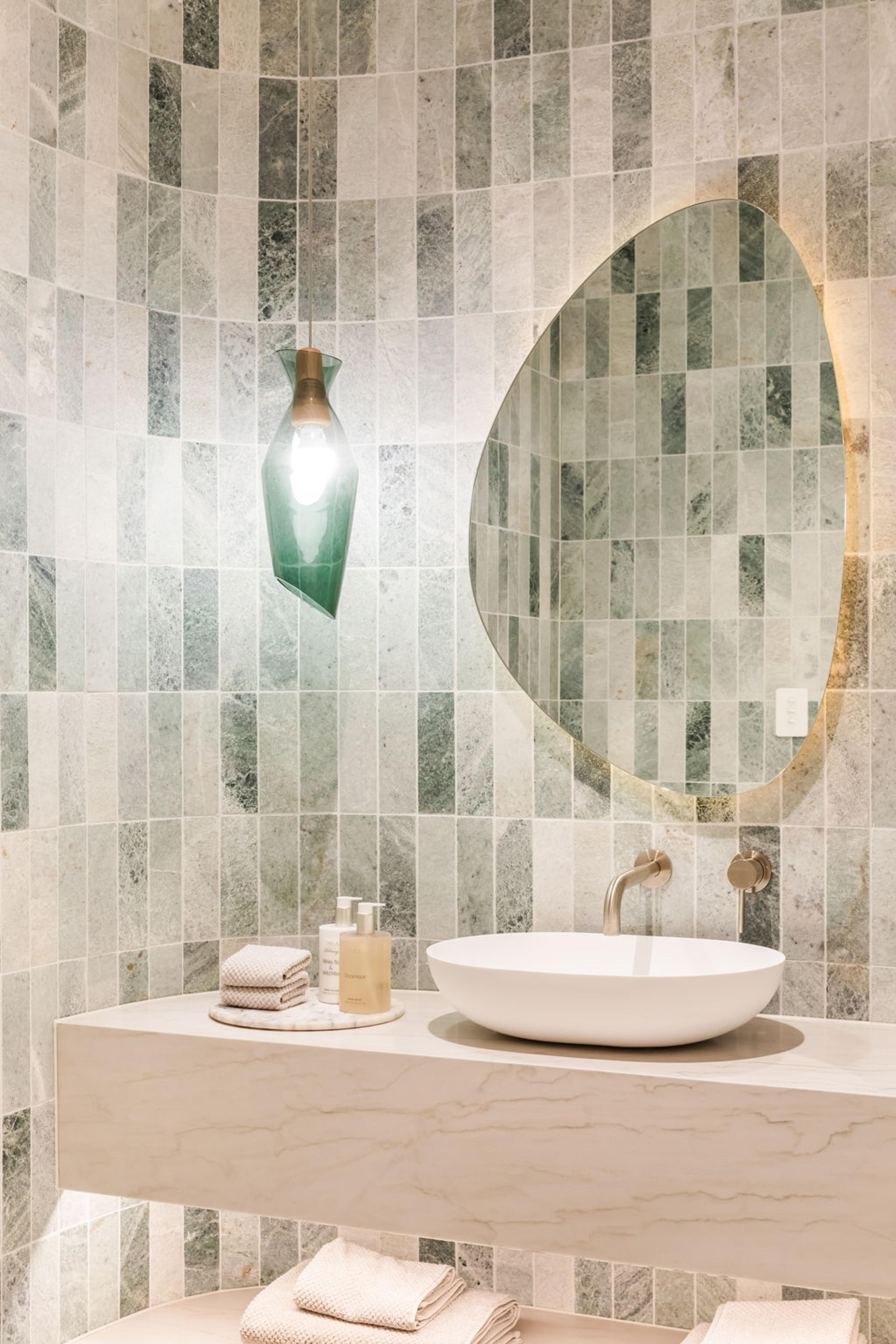 Don’t be afraid to add small pops of colour or patterns for some contrast. Sprinkle some accent shades across the room, rather than throwing in too many colours. Think towels, artwork and soap dispensers. These smaller elements are also easy to swap out when you want a refresh.