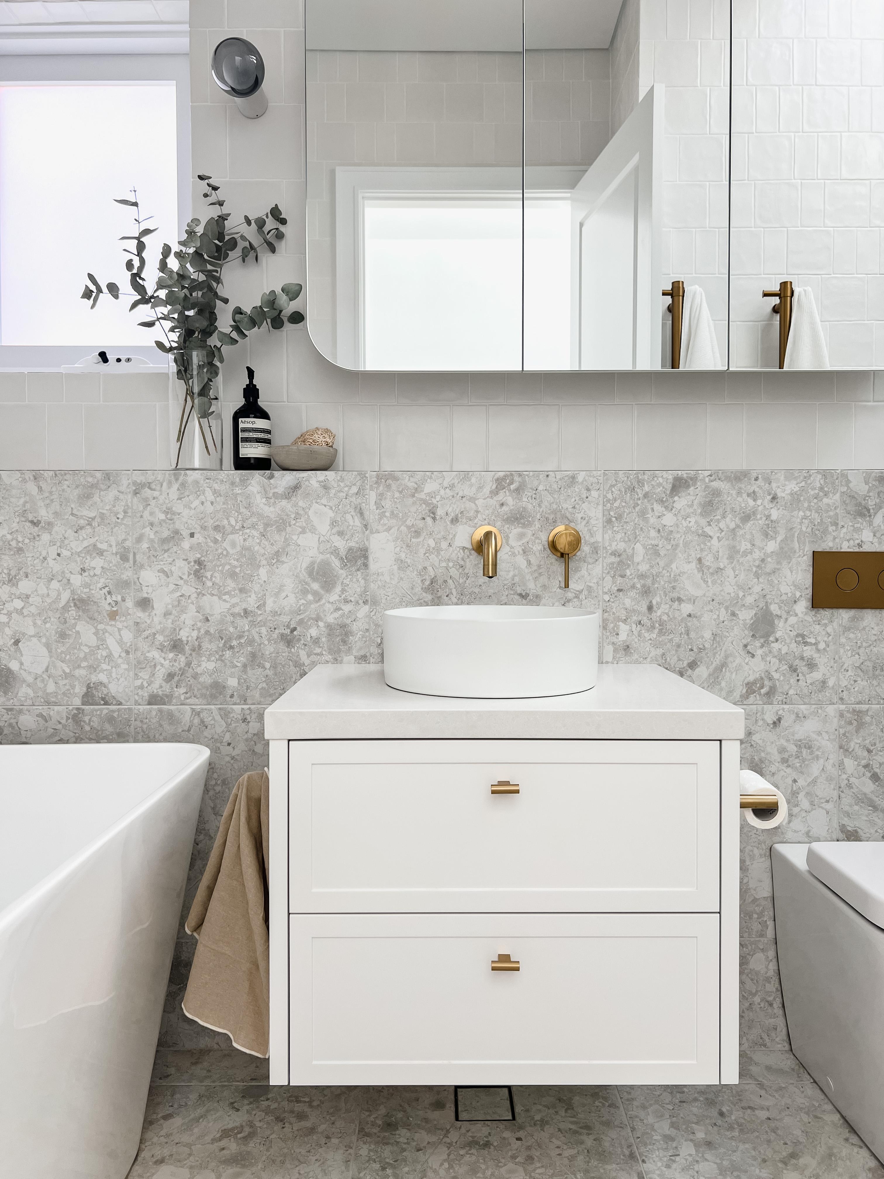 - 30%: secondary colour (feature tiling, vanity, shelving or mirror frame)
