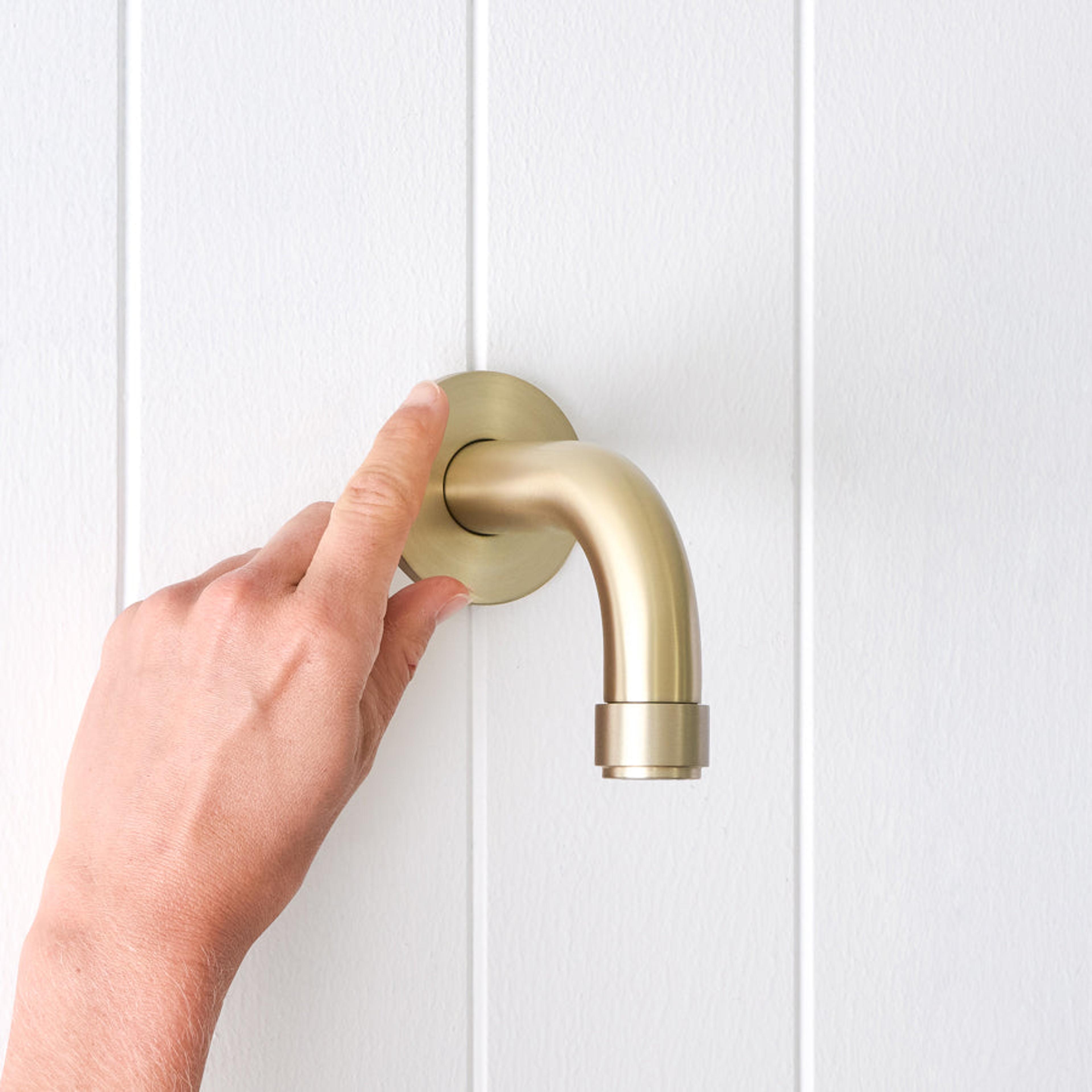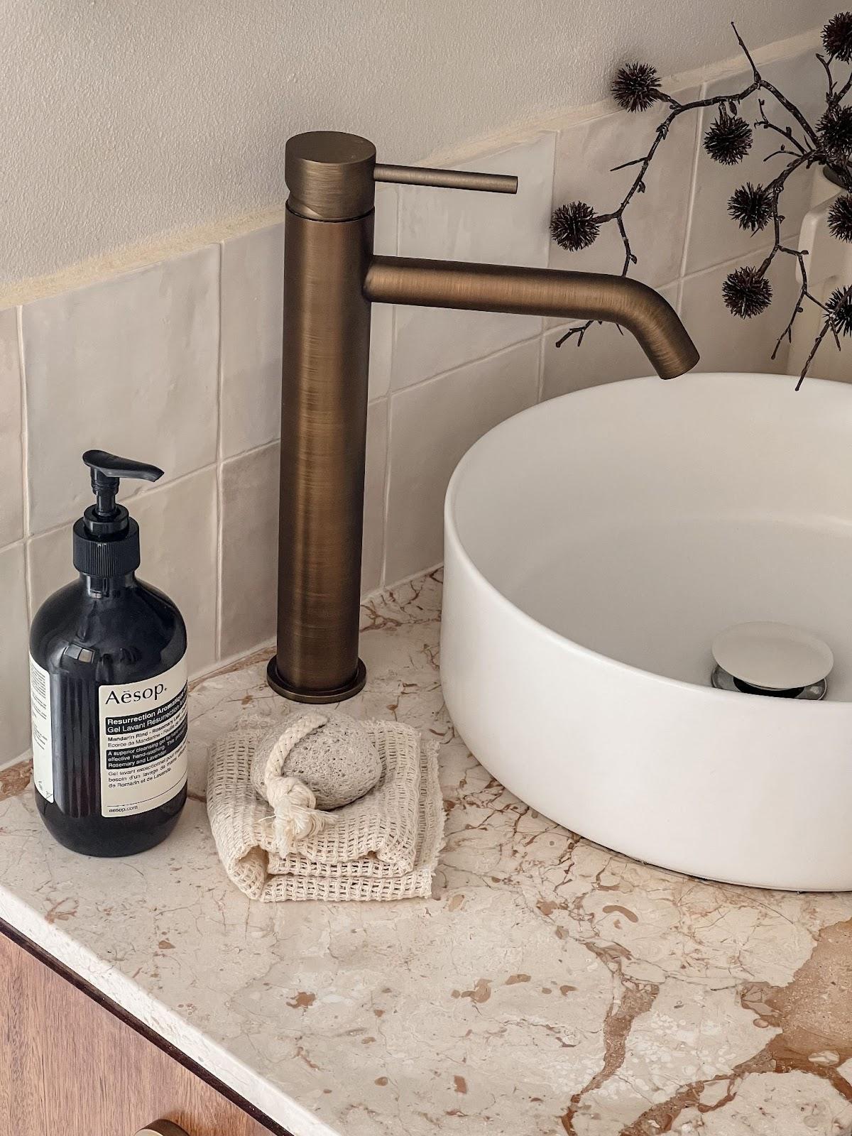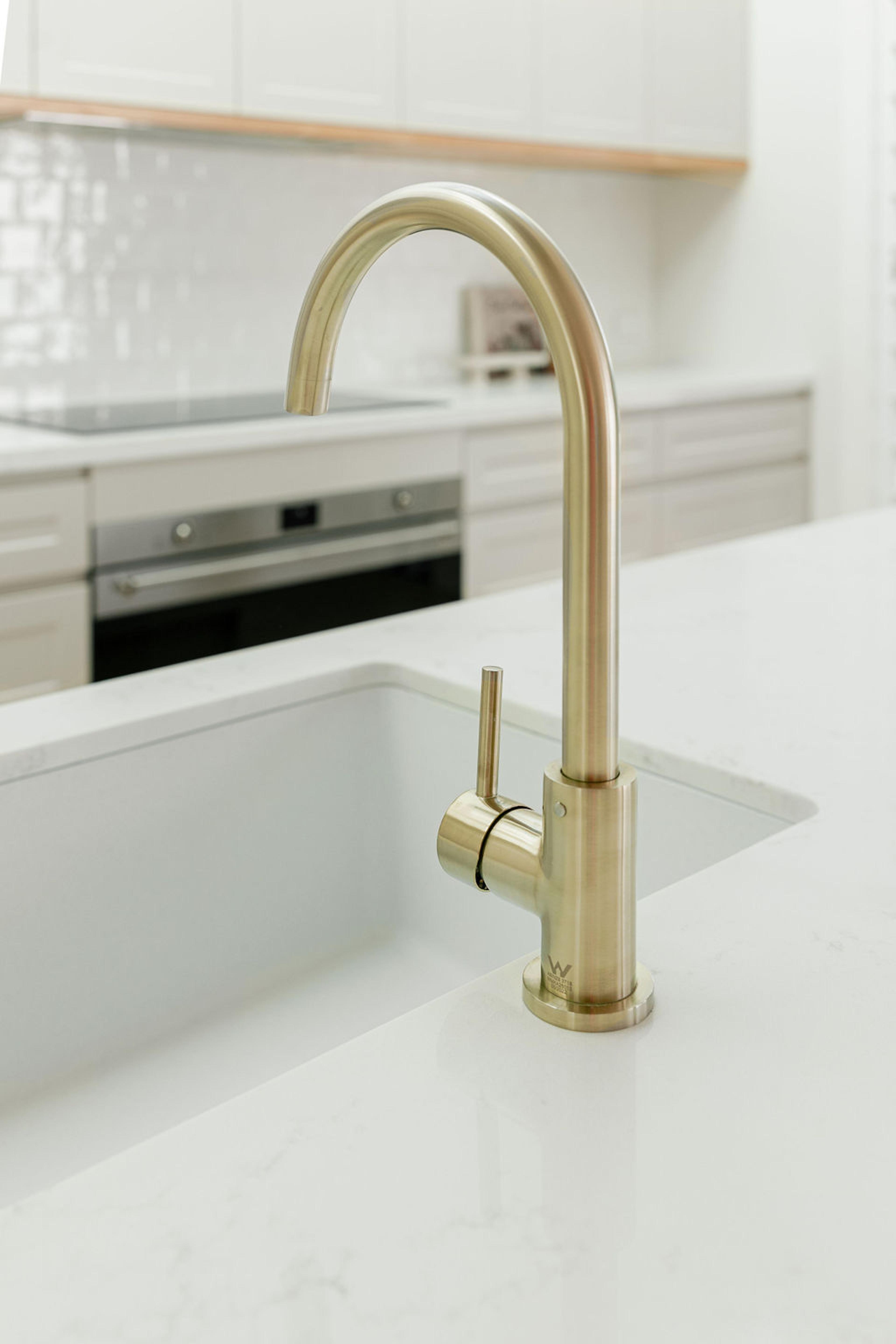Sink mixers, such as our pullout mixer or round mixer, aren’t limited to kitchens and laundries — they look great in bathrooms, too. In this bathroom, our Round Kitchen Mixer in Brushed Brass is a beautiful complement to this pink basin.
