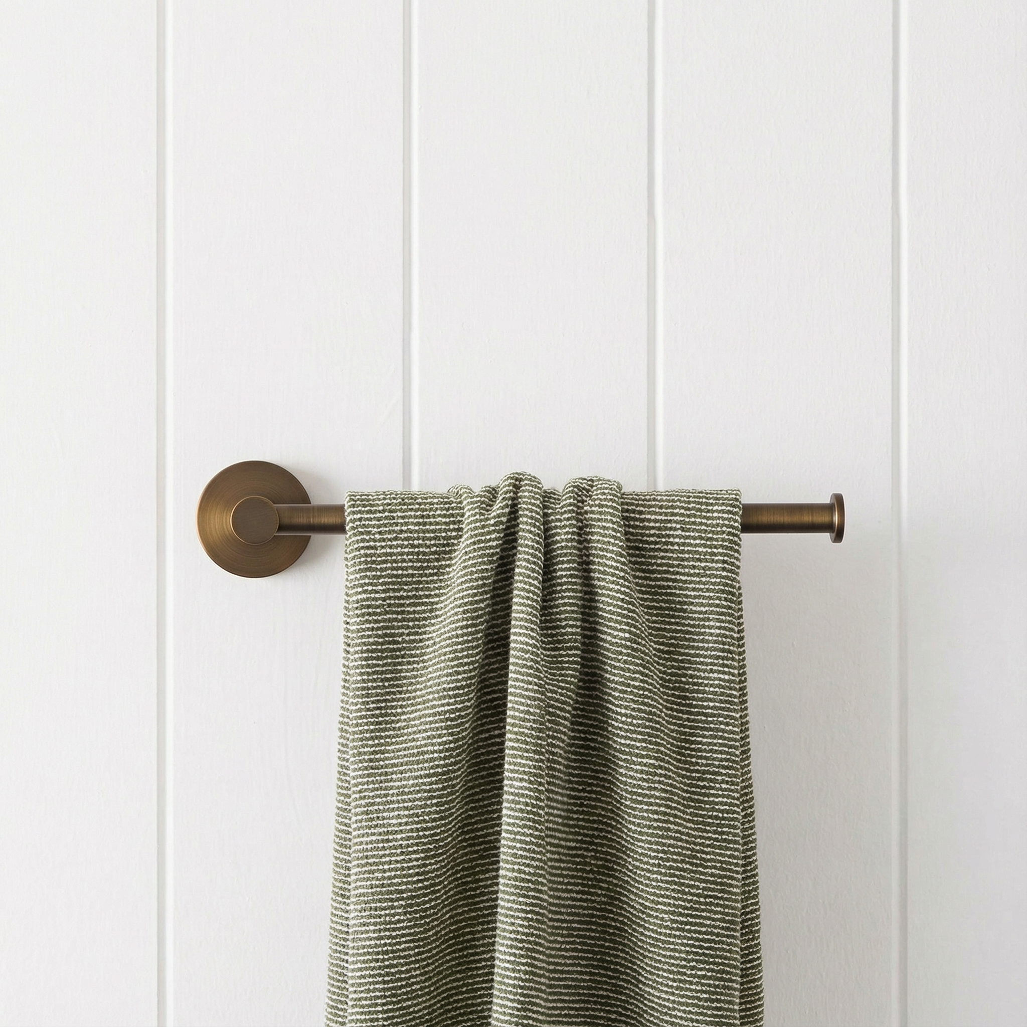 The Sydney Hand Towel Holder in Antique Brass keeps everyday towels off the vanity and easy to grab. Made from stainless steel, it is sturdy, rust resistant and simple to wipe clean. A practical choice when you want handy storage with a softer brass look.