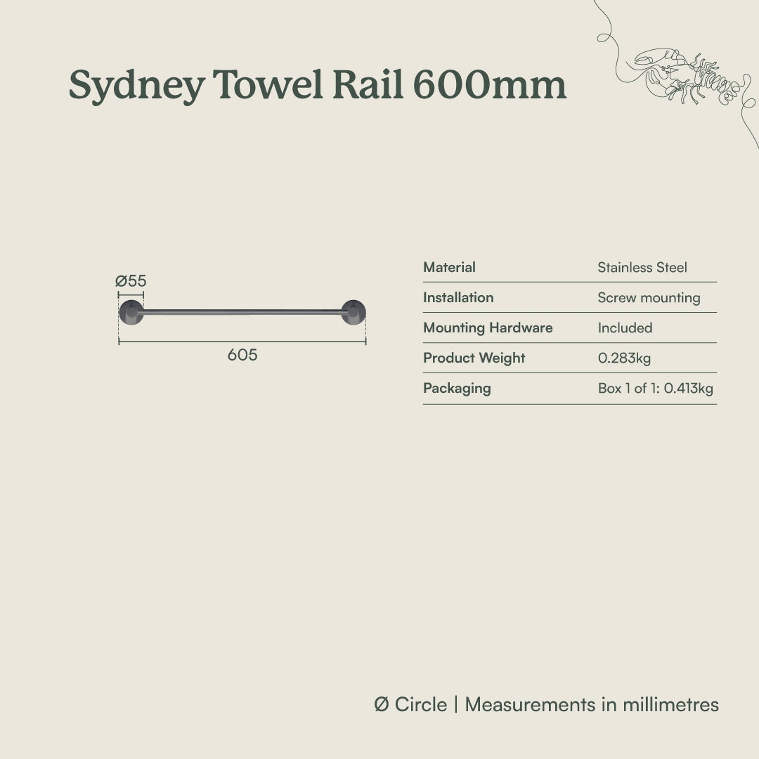 The Sydney Towel Rail in Antique Brass (600mm) is a sturdy everyday towel rail that fits most main bathrooms and ensuites. The stainless steel body and Antique Brass finish are durable and easy to clean, while the 600mm length provides ample space for hand or bath towels. It keeps the bathroom organised and functional.