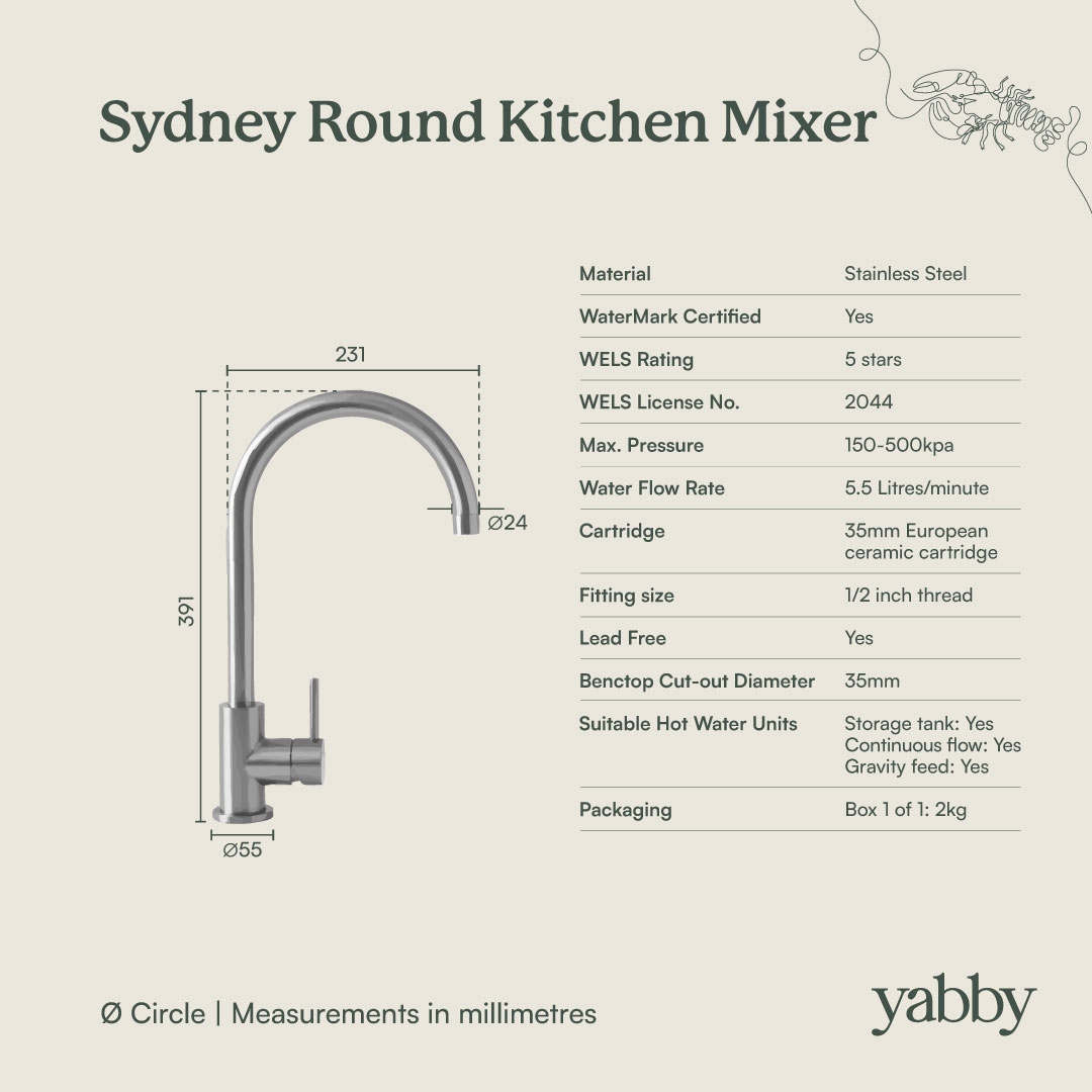 The Sydney Round Kitchen Mixer in Warm Brushed Nickel suits renovators who want a gentle metal colour with solid performance. The warm brushed finish is forgiving on fingerprints, while the high swivel spout gives better reach for rinsing dishes and produce. It is a practical round kitchen mixer that still feels special.