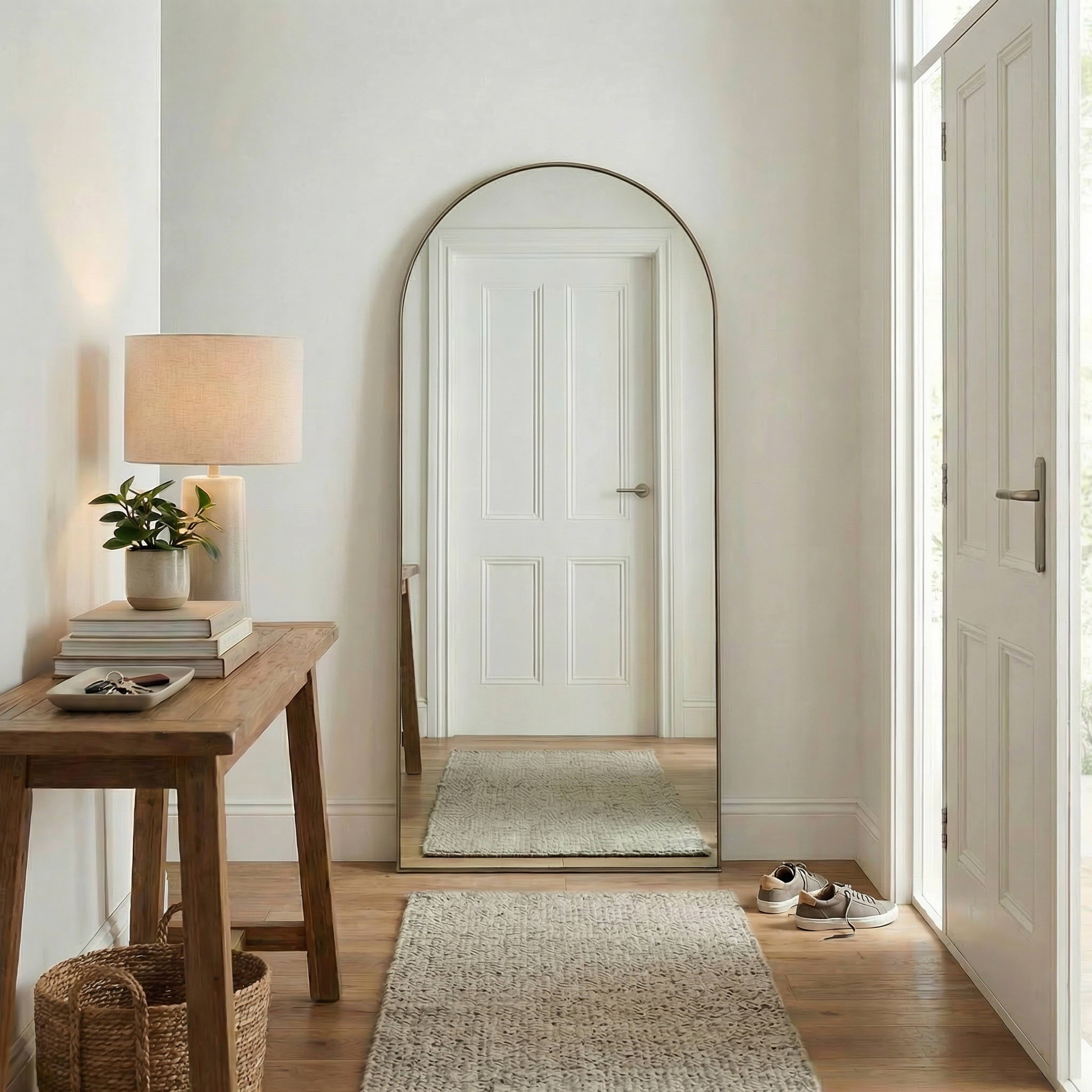 The Arch Full Length Mirror in Antique Brass is a practical addition to any room in your home, offering both style and functionality. Its floor mirror design ensures easy placement and reliable use, making it a dependable choice. Crafted with premium materials, this mirror promises long-term durability and is also suitable for use in bathrooms.