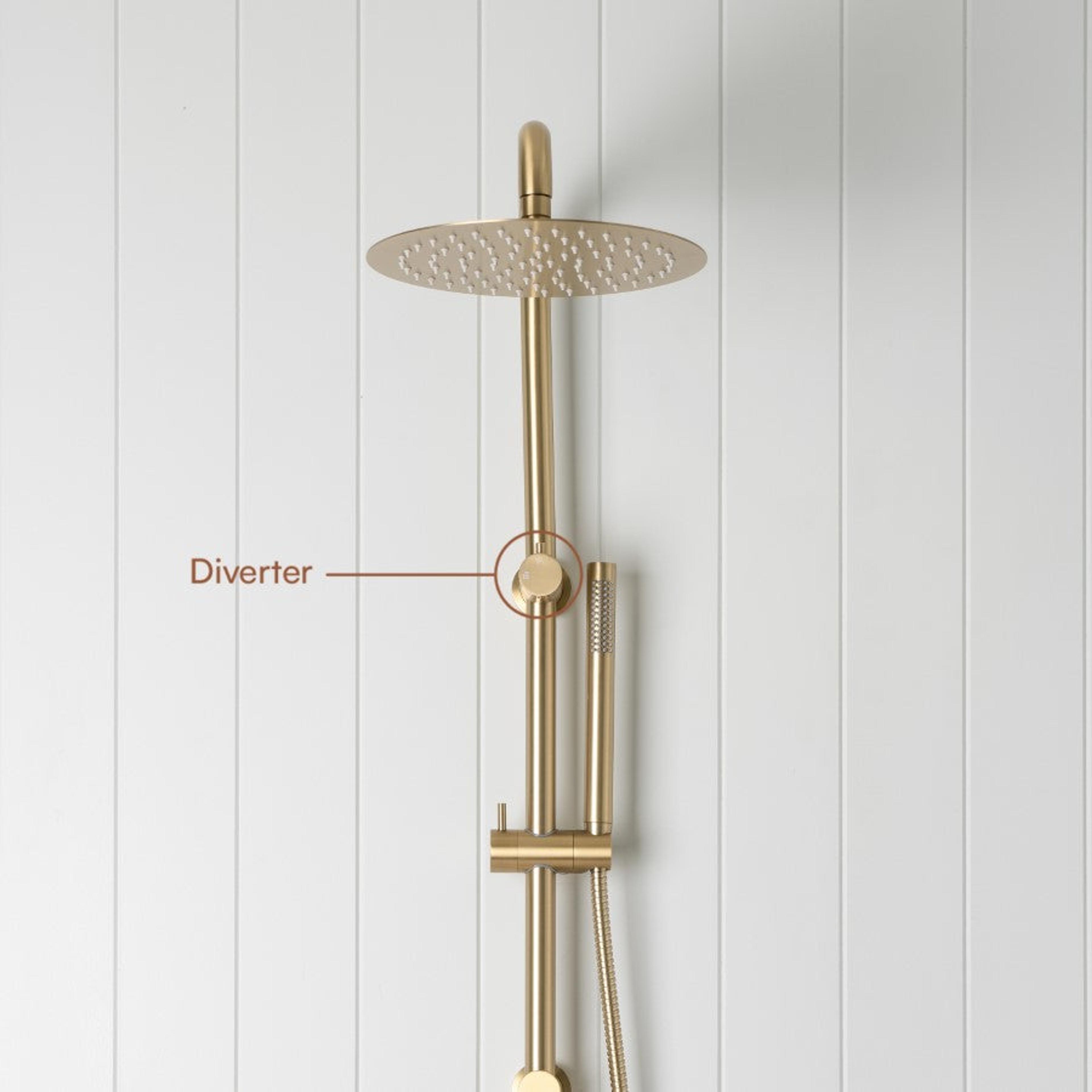 The combination shower has a diverter that is located on the shower rail.The combination shower requires taps or mixer to be purchased separately. Options linked below.