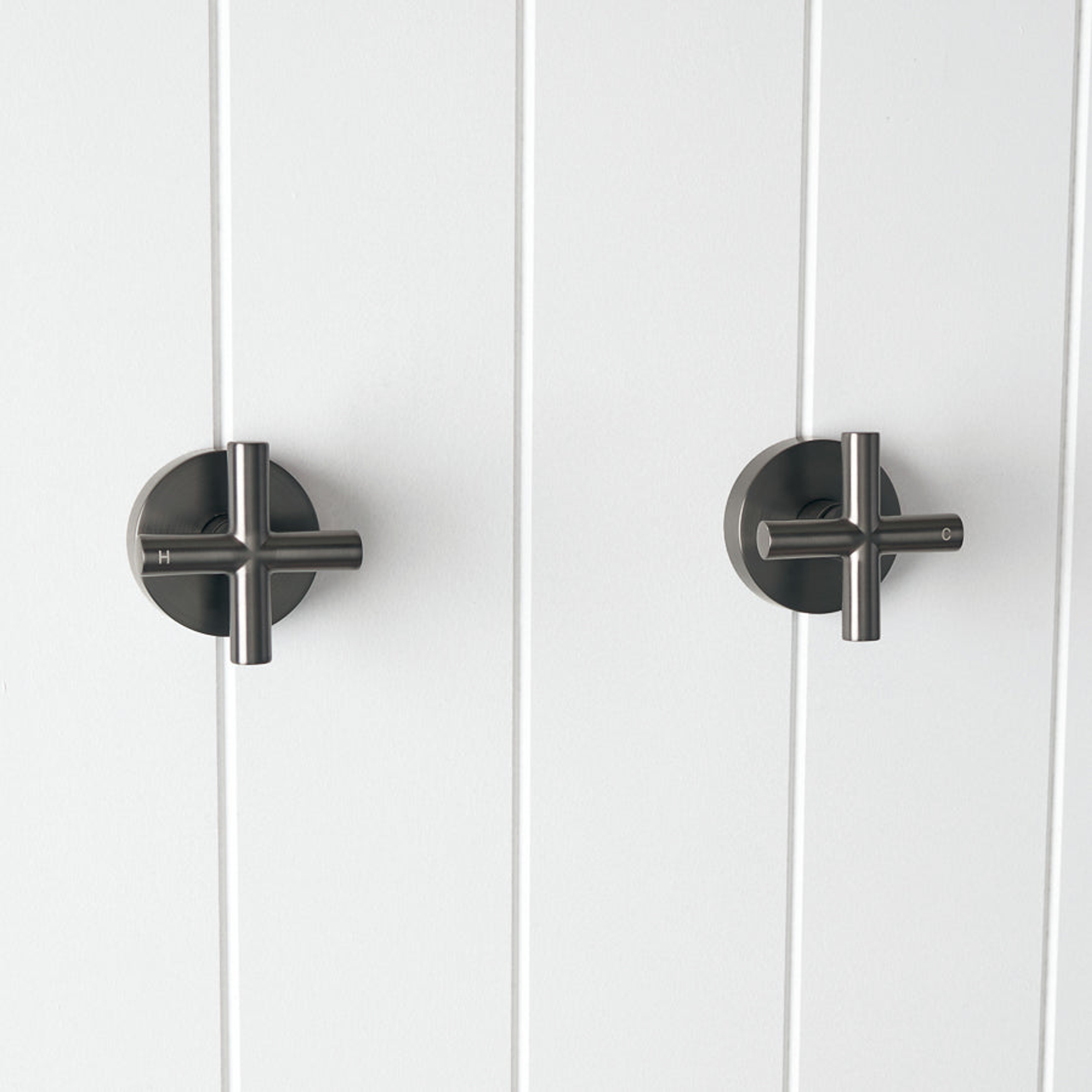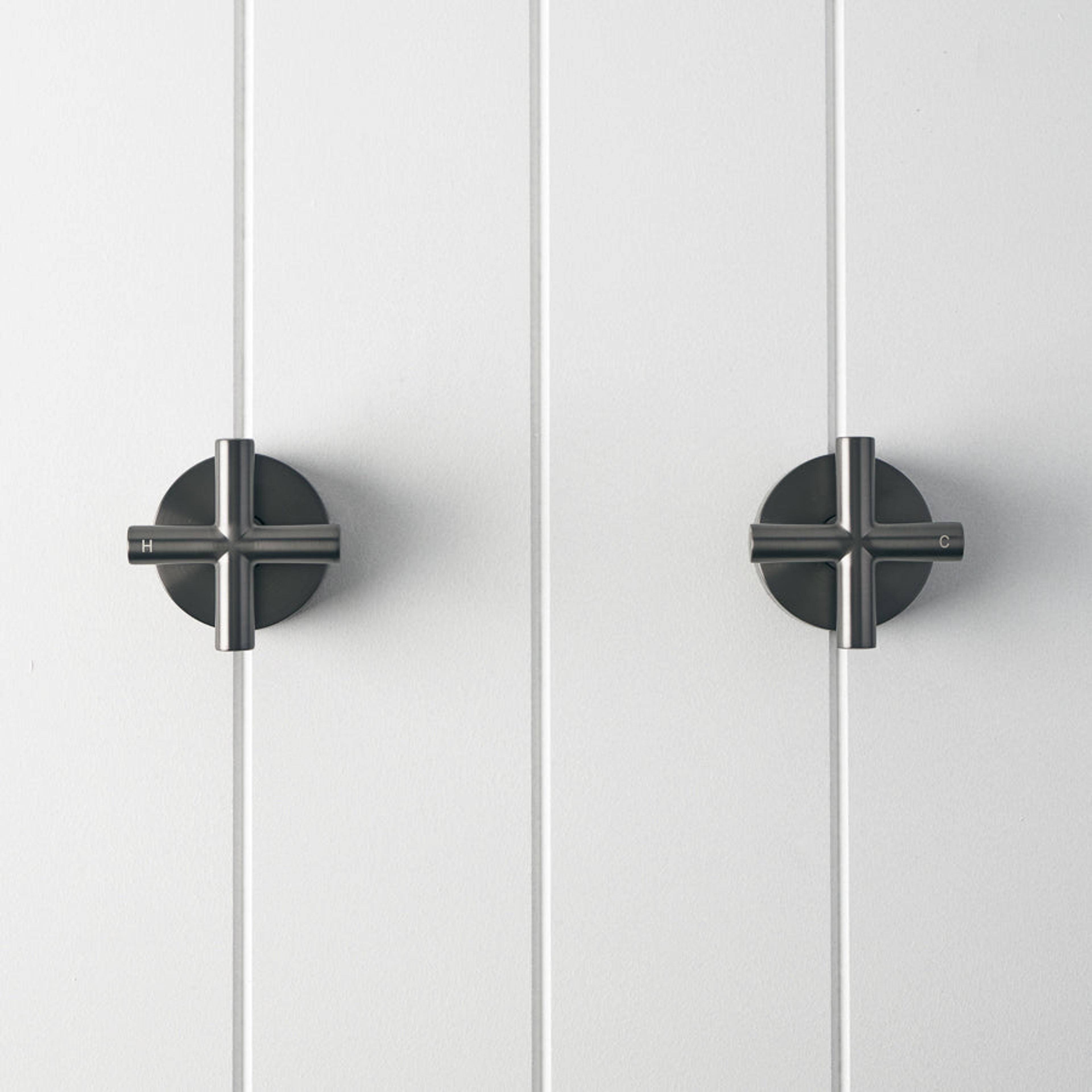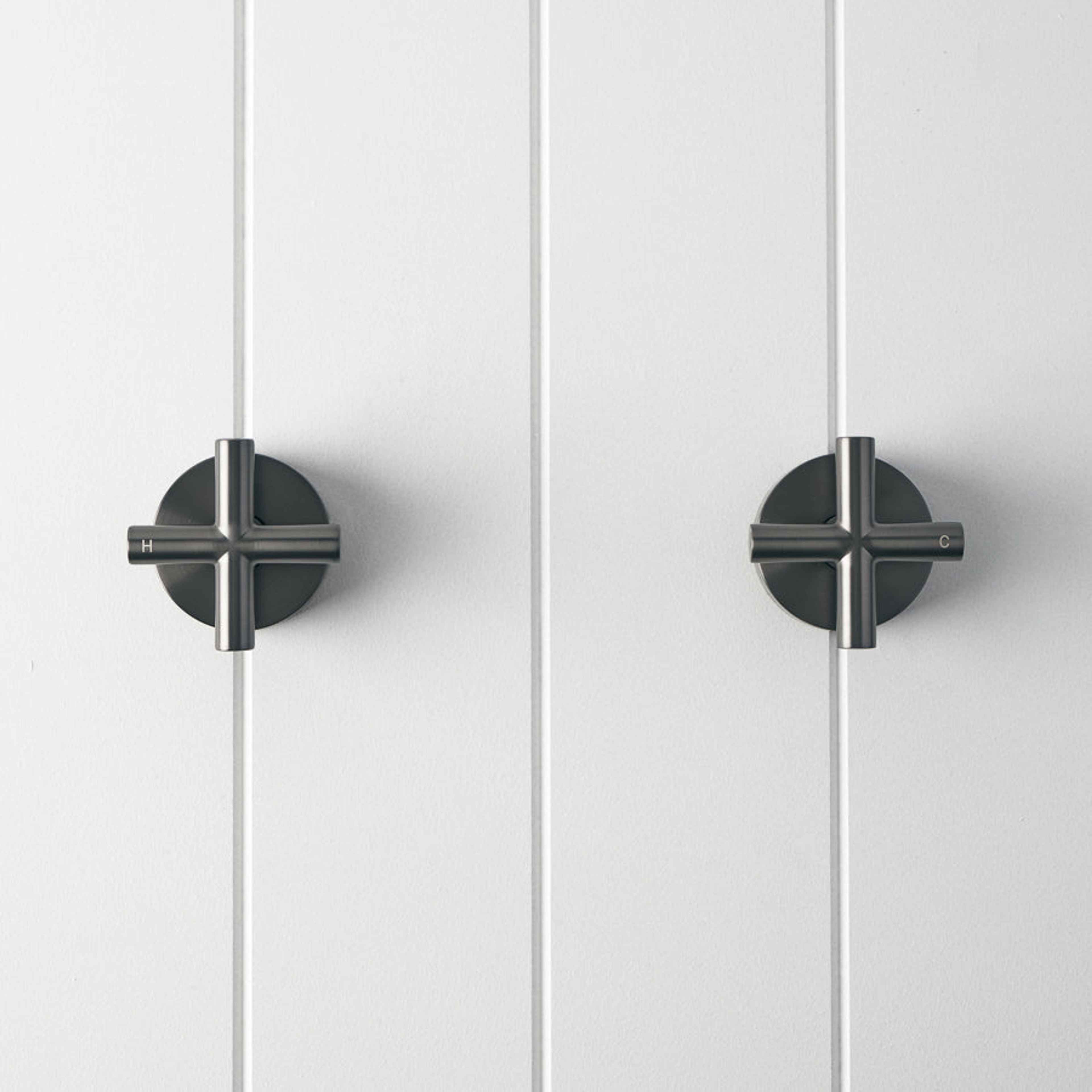 The Cross Taps in Gunmetal brings a refined touch to your bathroom or kitchen. This sleek tapware in a gunmetal finish adds a modern edge, enhancing the textural interplay of light and shadow in your space. Perfect for creating a calm, contemporary atmosphere.