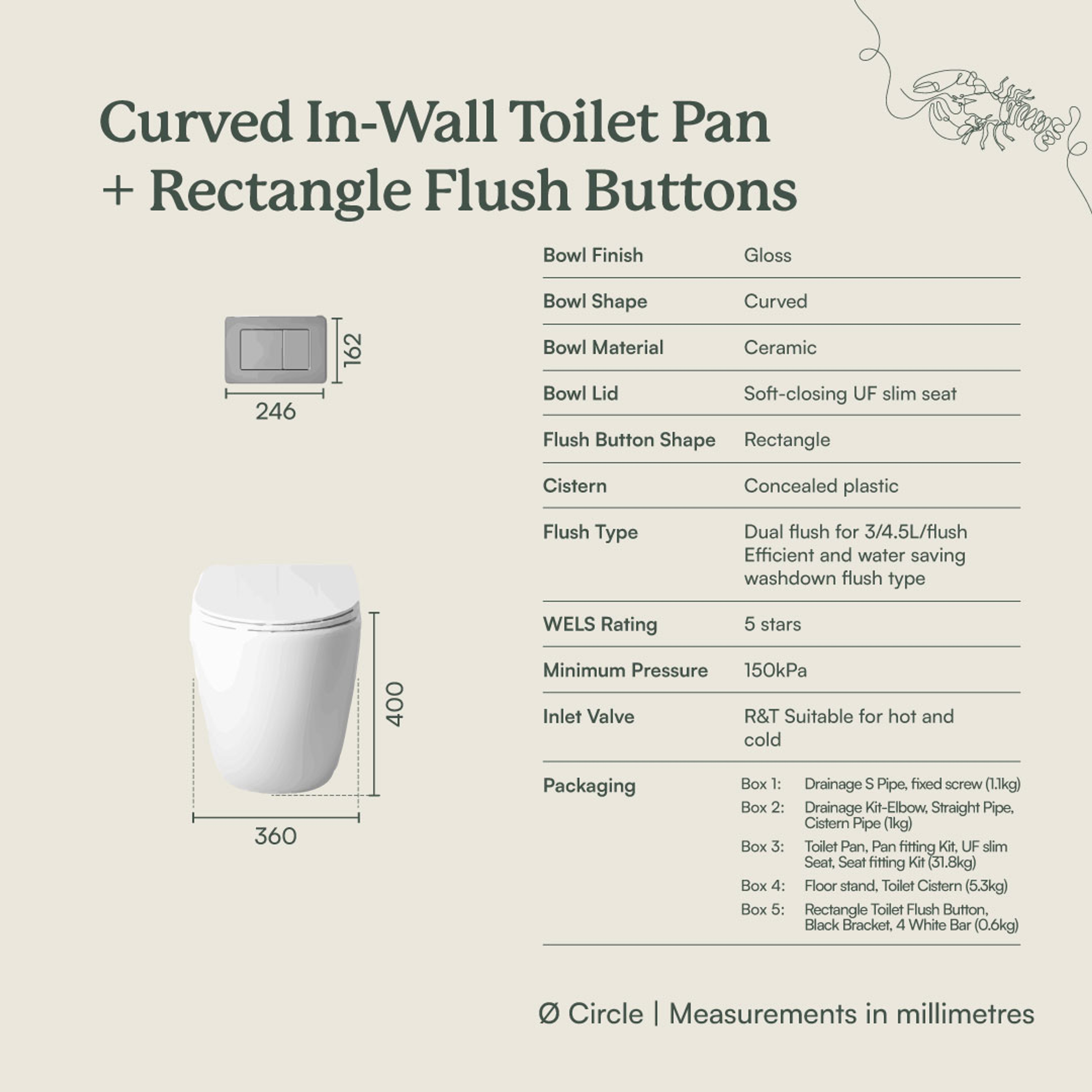| Flush Buttons | Flush Buttons only compatible with Yabby toilet cistern and are not sold separately. Dual flush |