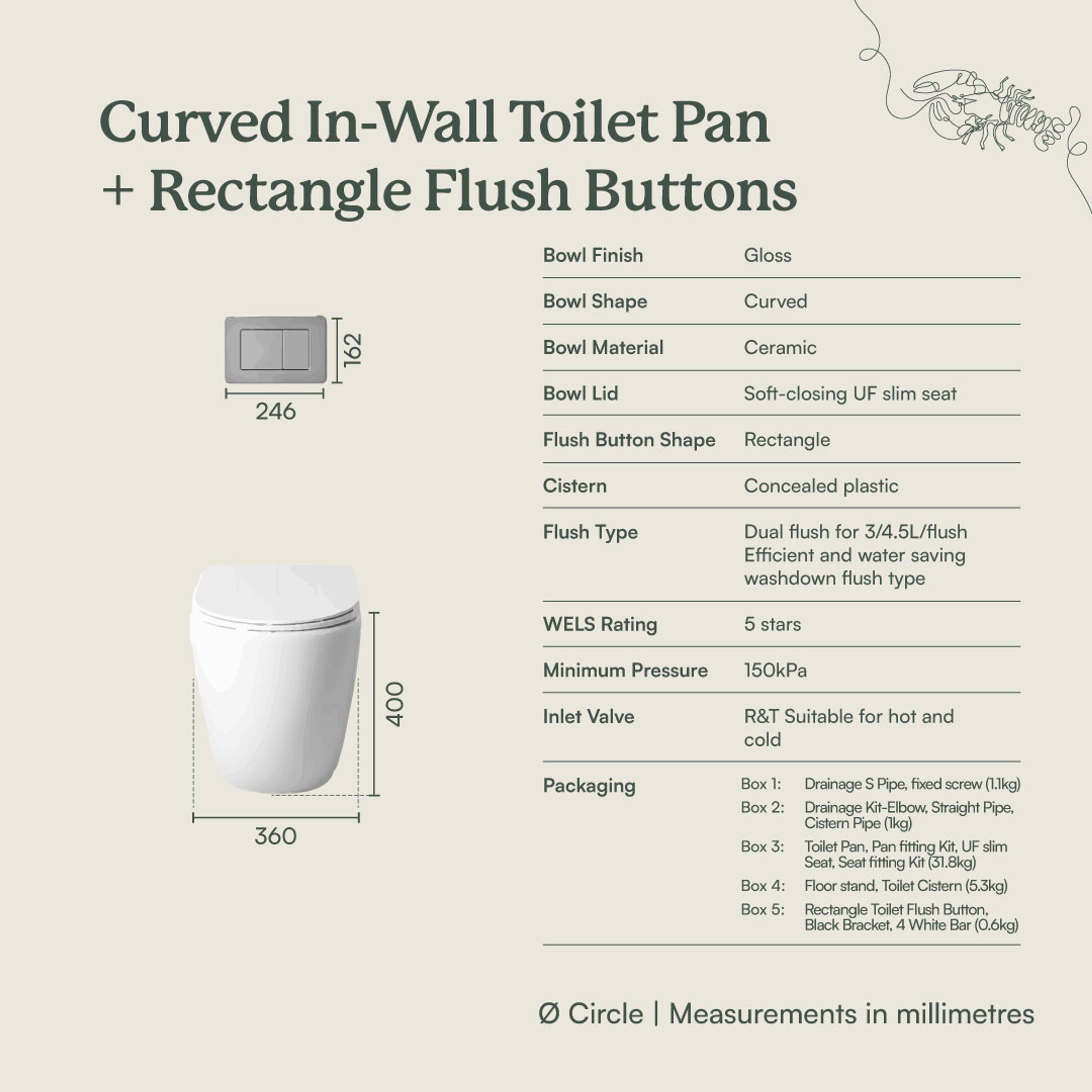 | Construction | Ceramic toilet body In-wall cistern compatible with Yabby flush buttons only |