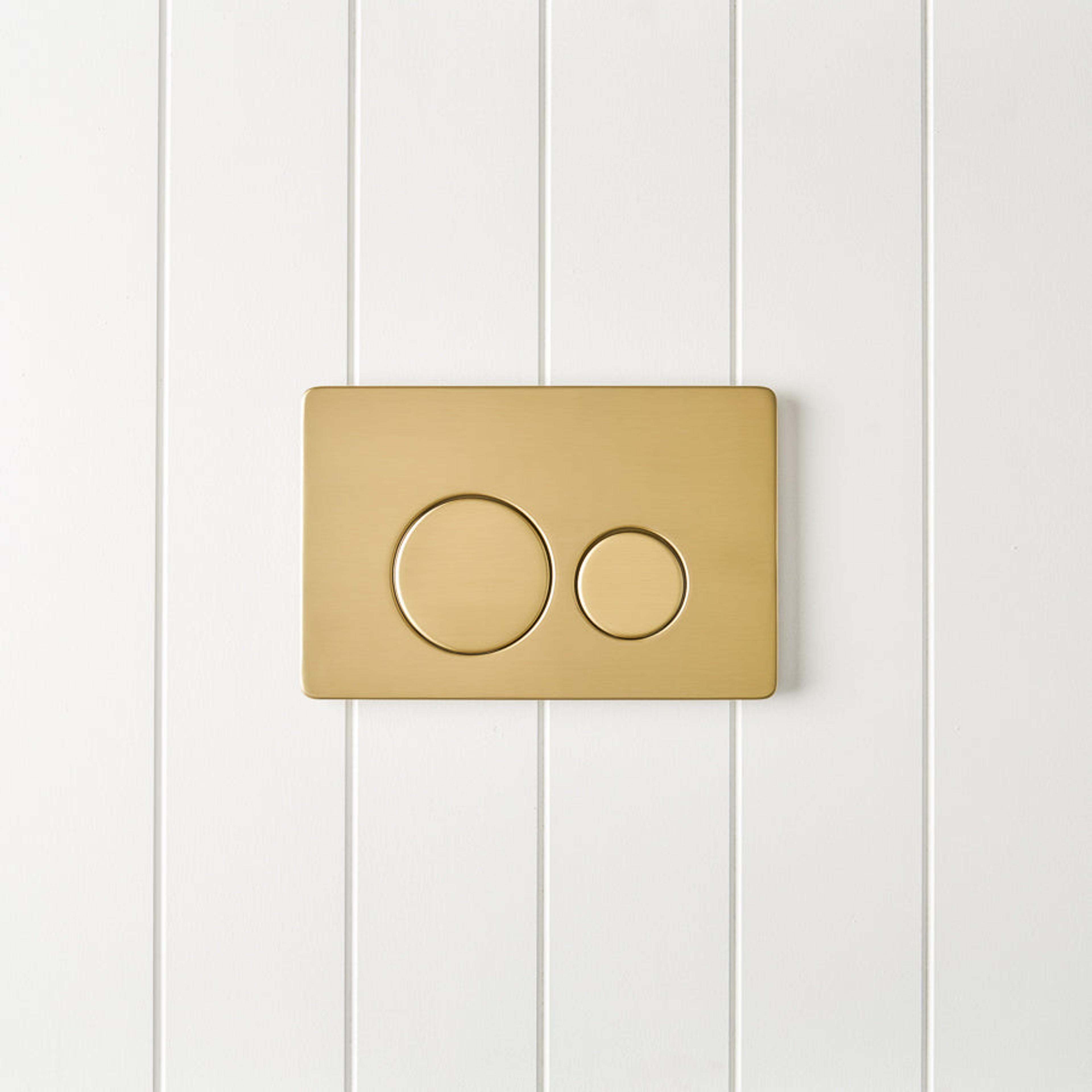 Curved In-Wall Toilet With Round Brushed Brass Buttons