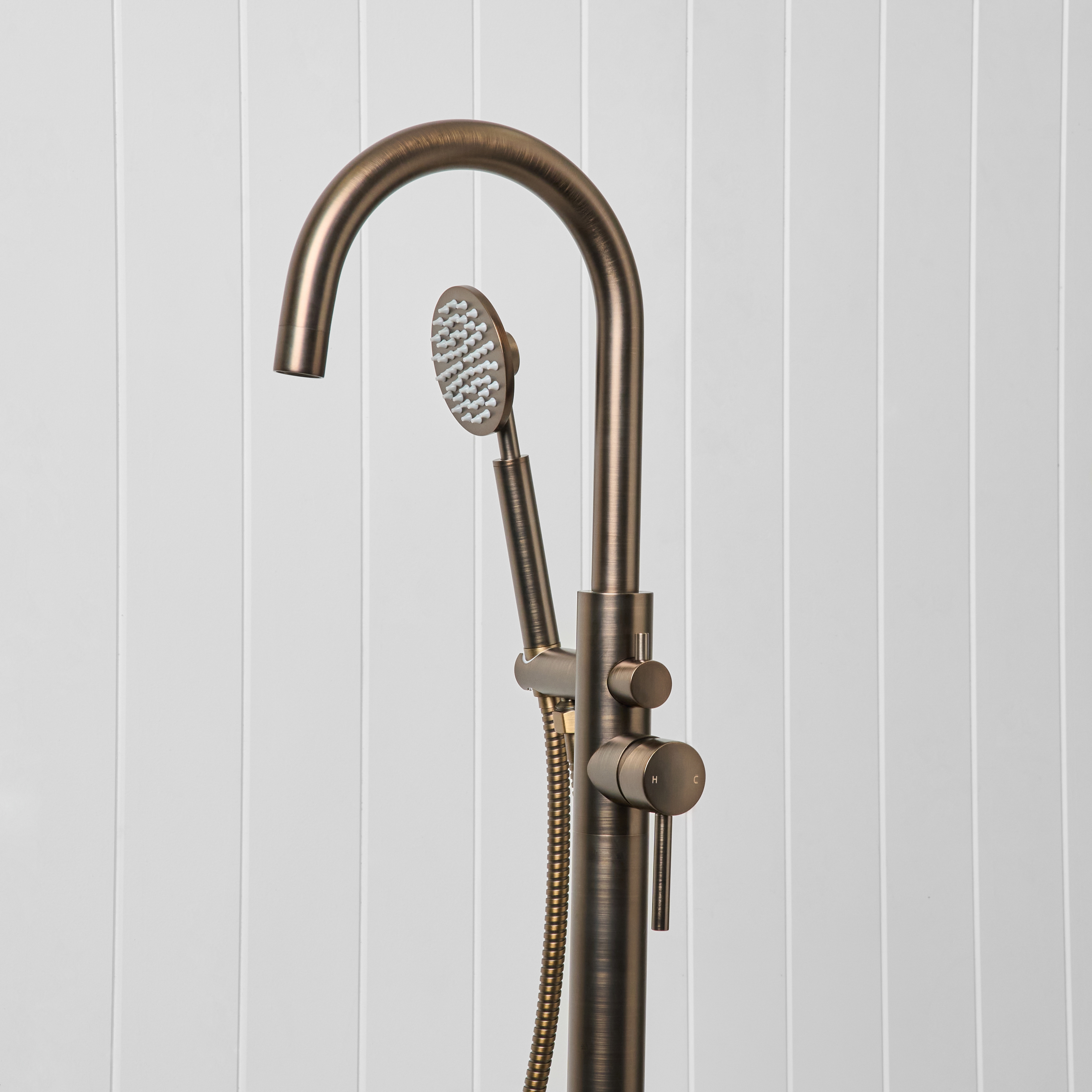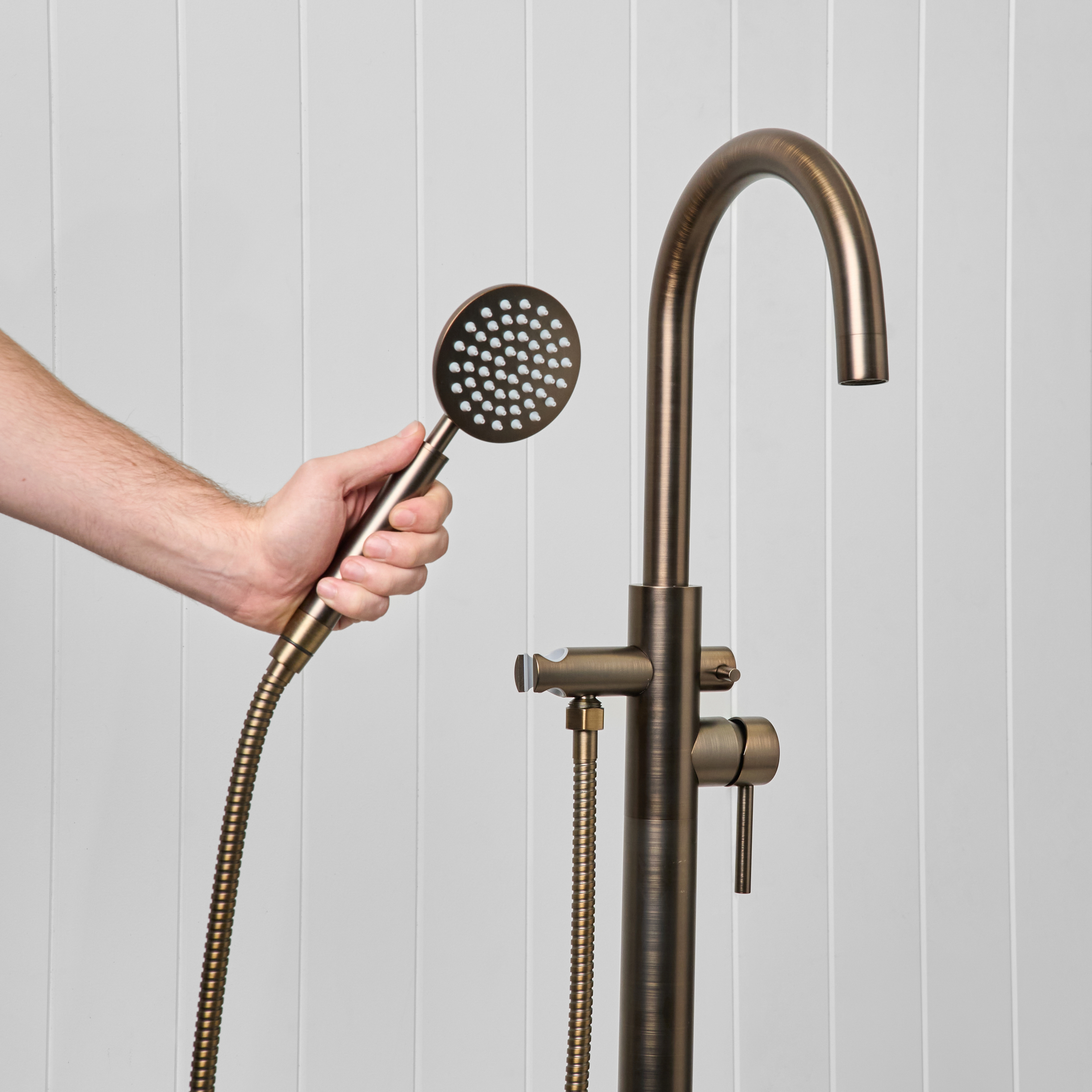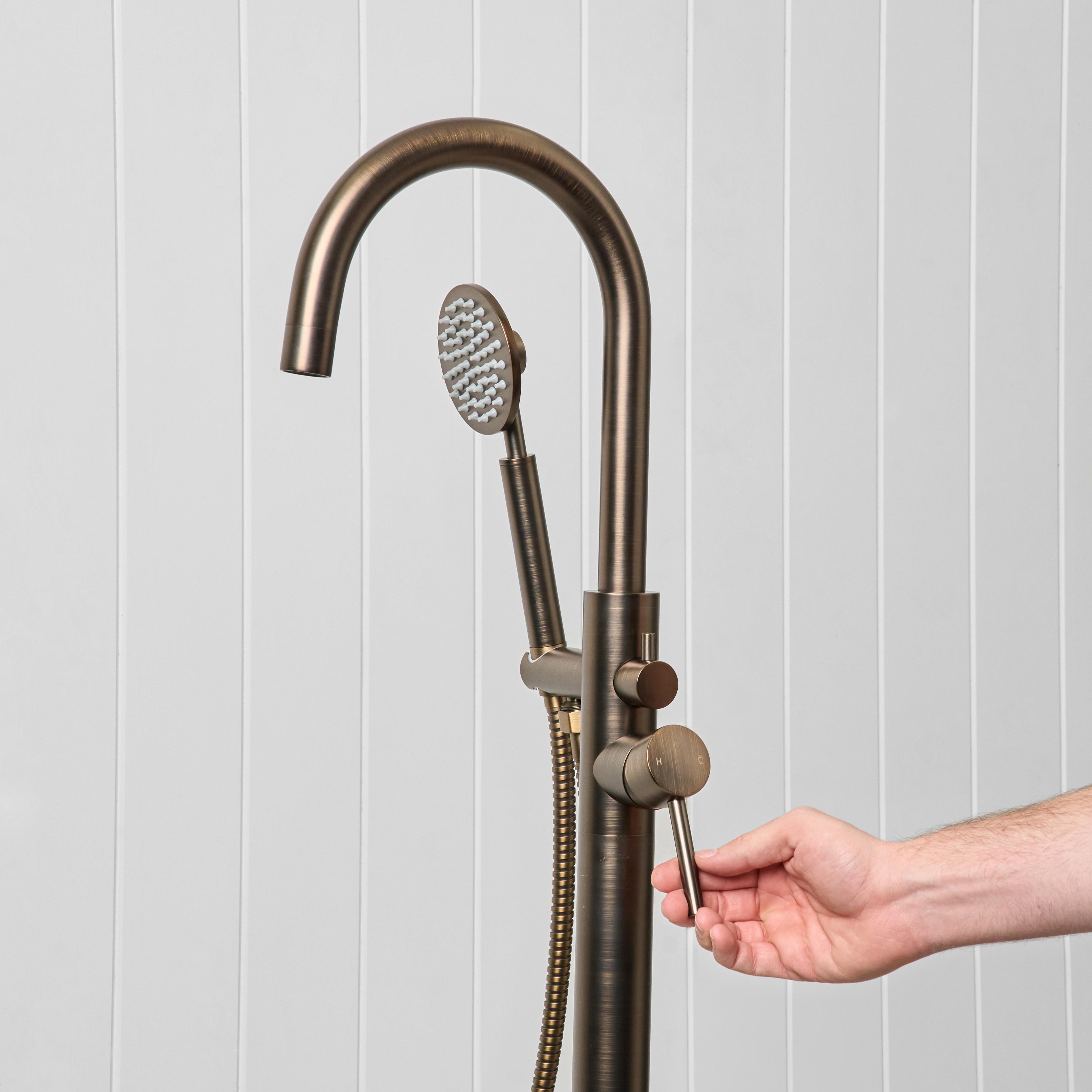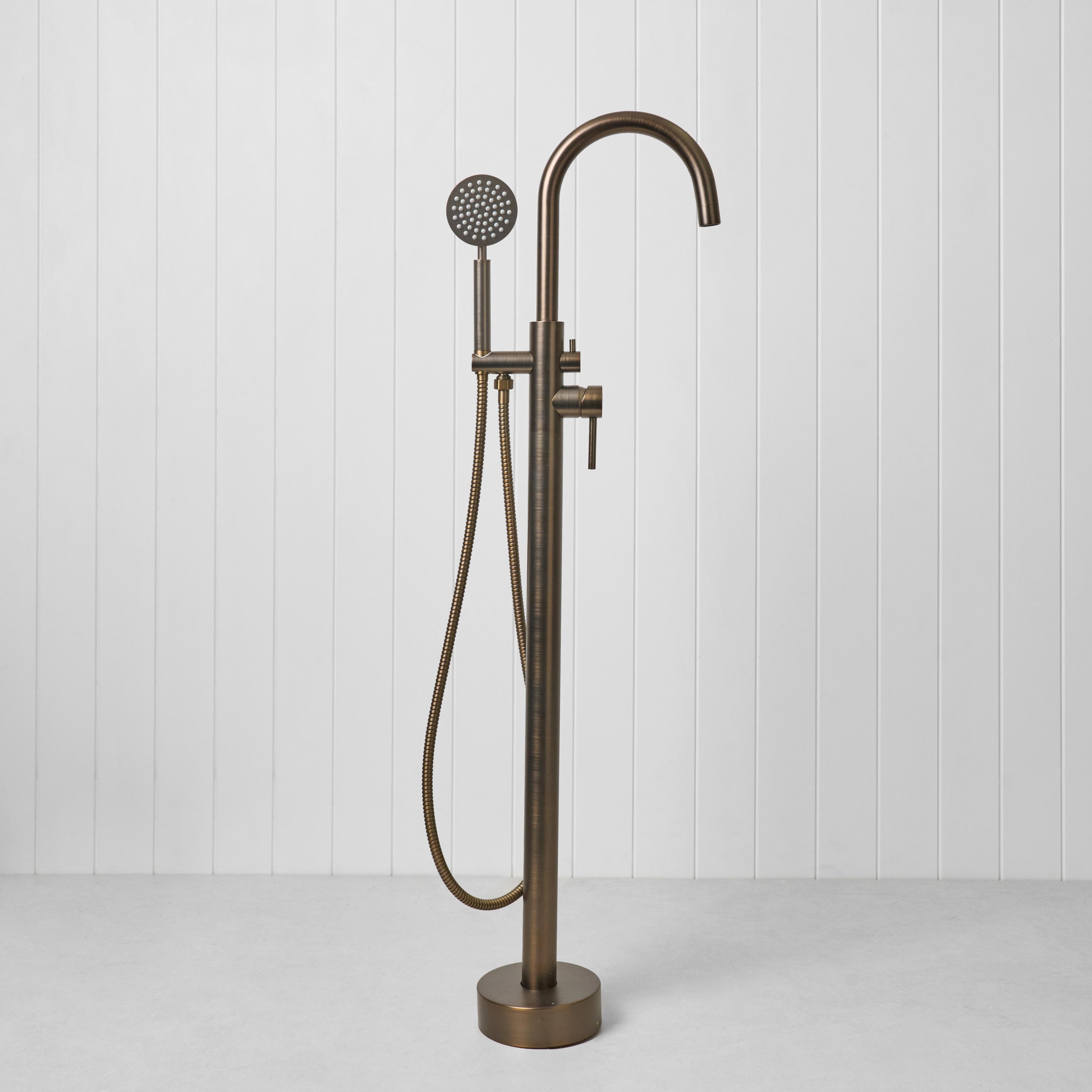 The Freestanding Bath Spout + Round Hand Shower in Antique Brass combines a freestanding bath filler with the added flexibility of a handheld shower. Designed for both comfort and everyday use, it gives you everything you need in one simple setup.