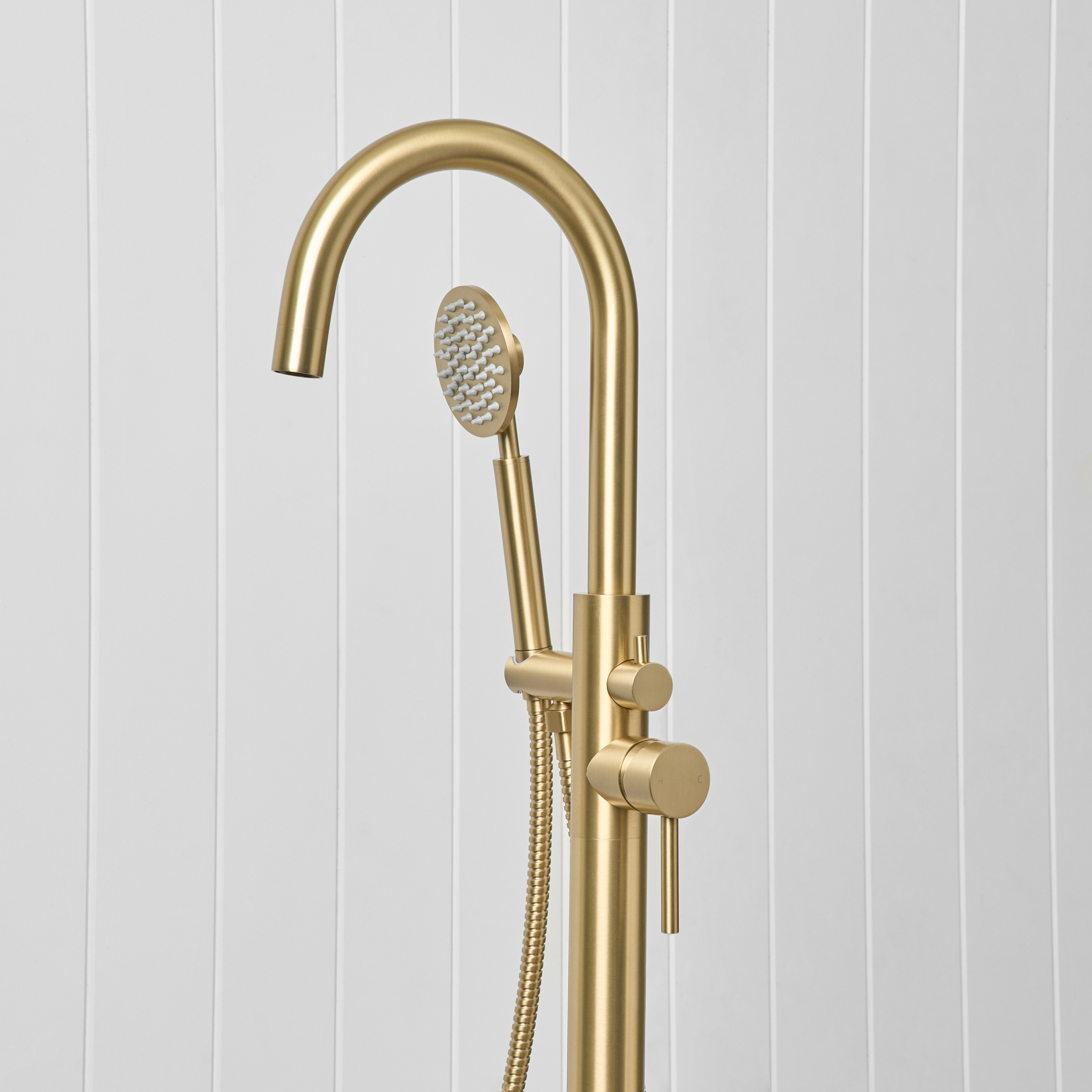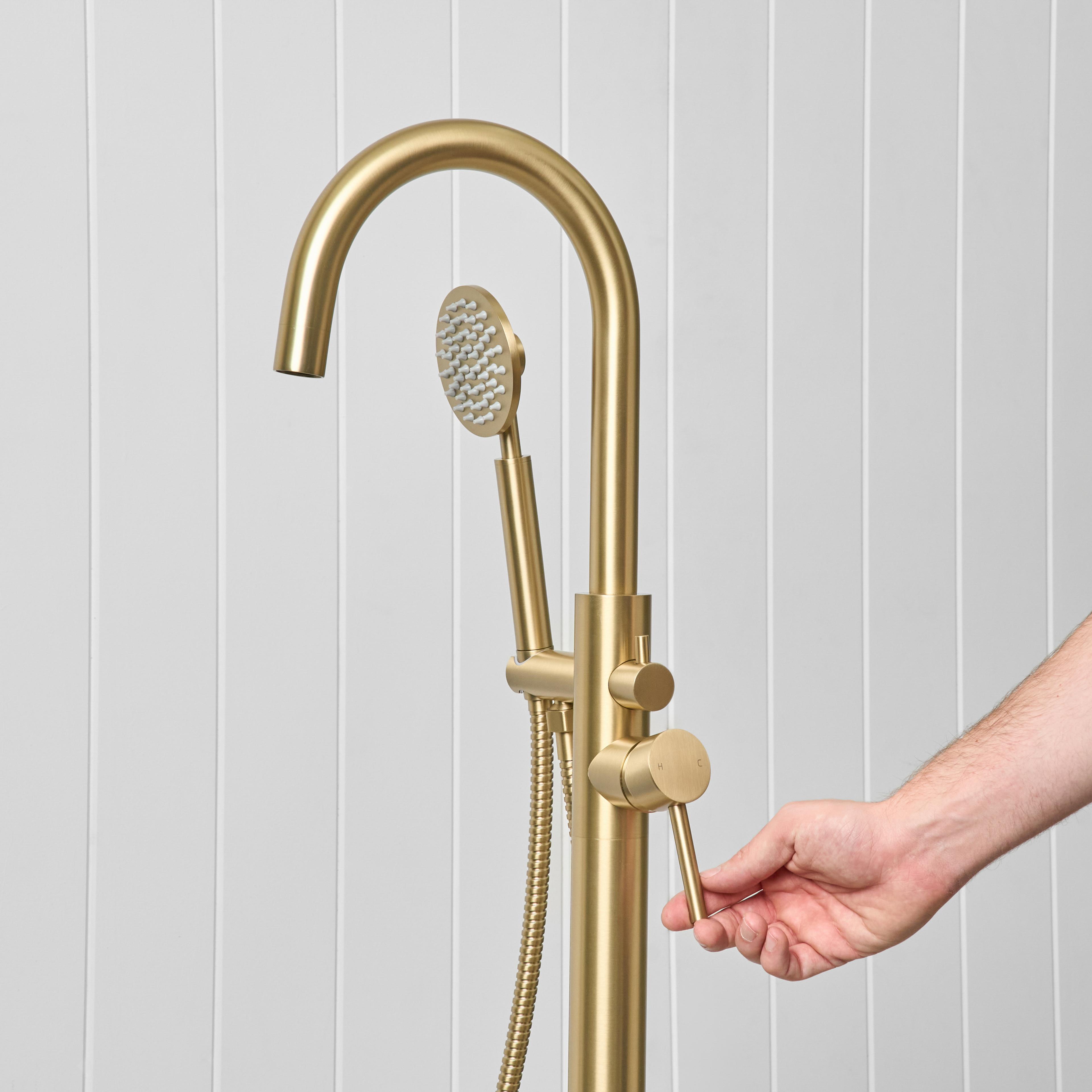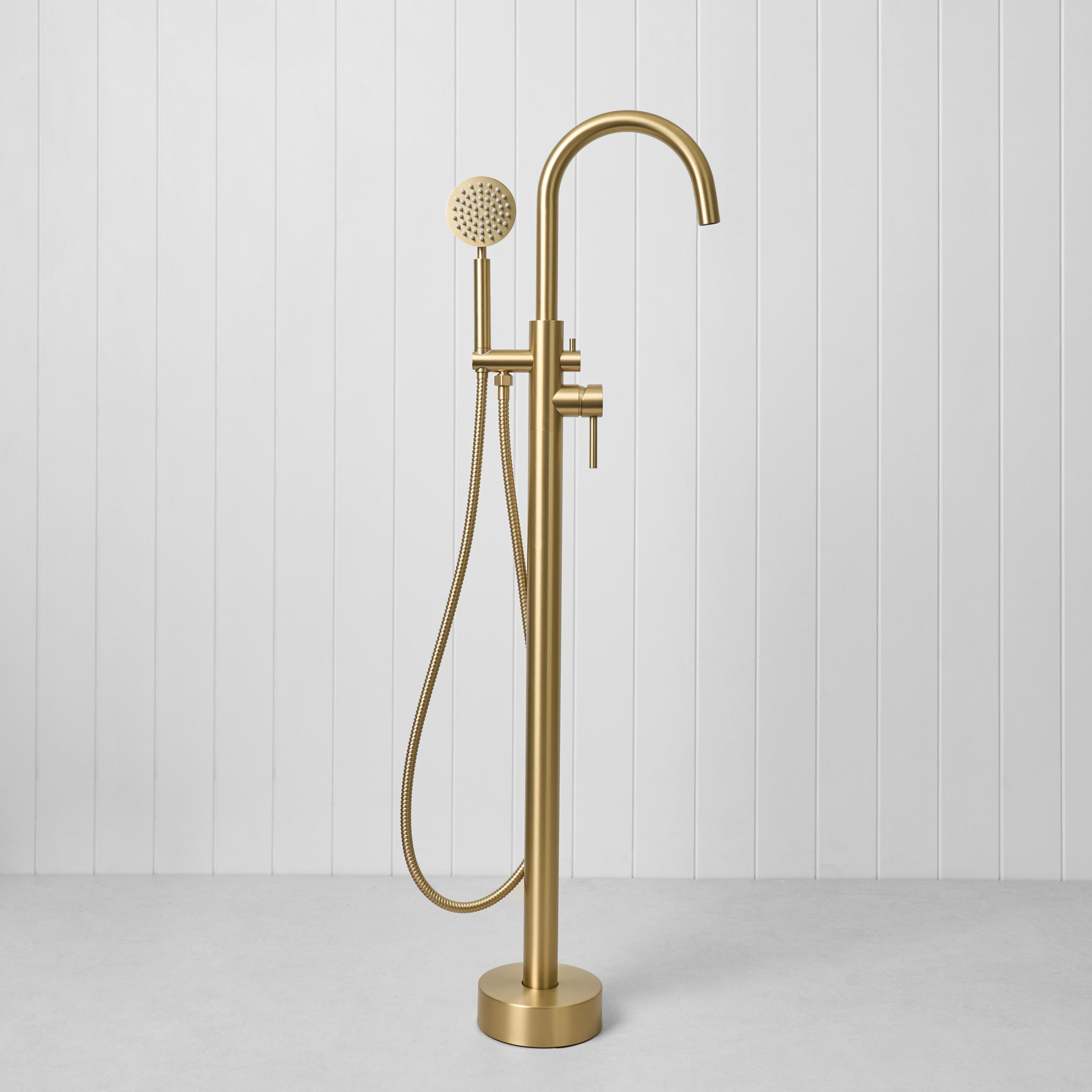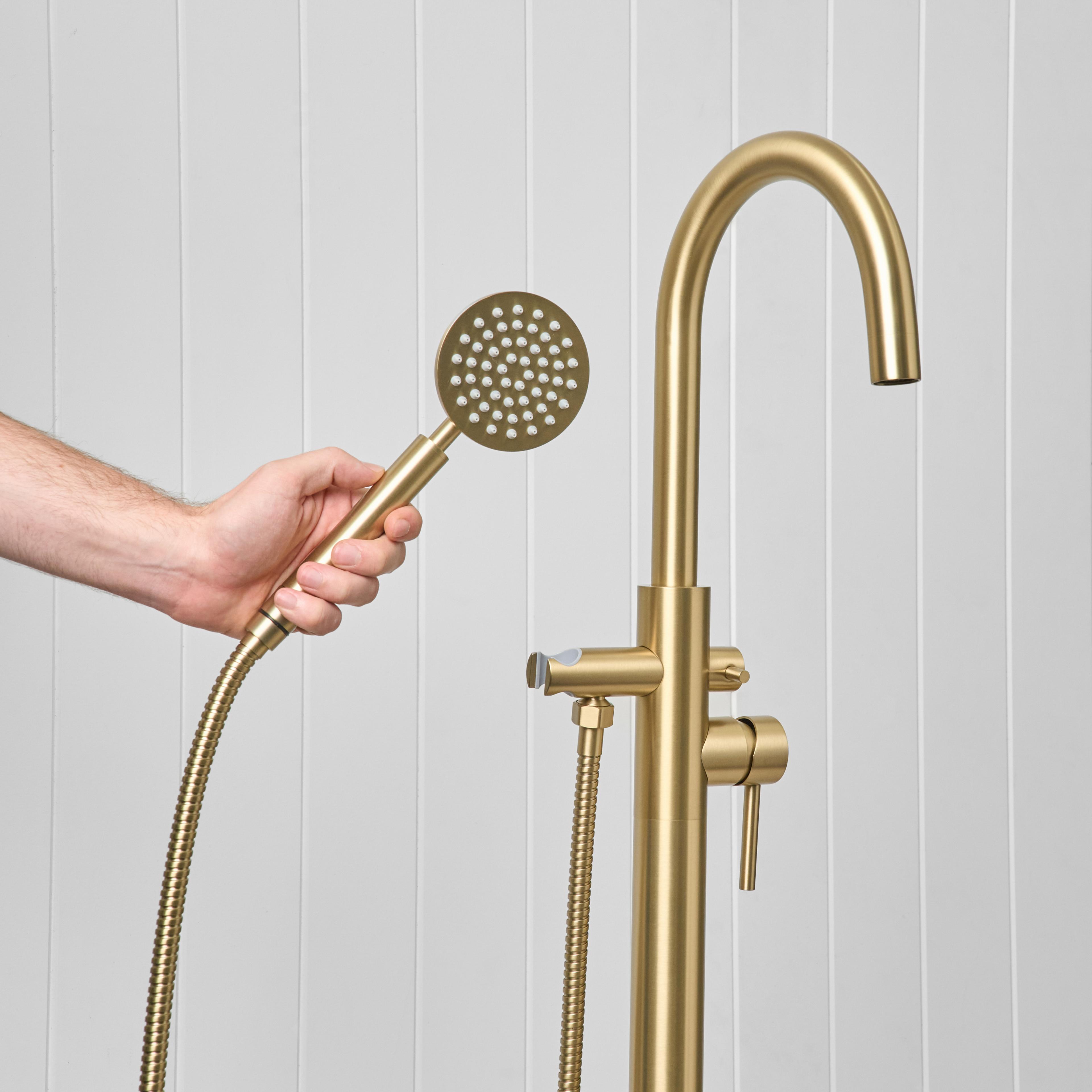 Freestanding Bath Spout + Round Hand Shower Brushed Brass