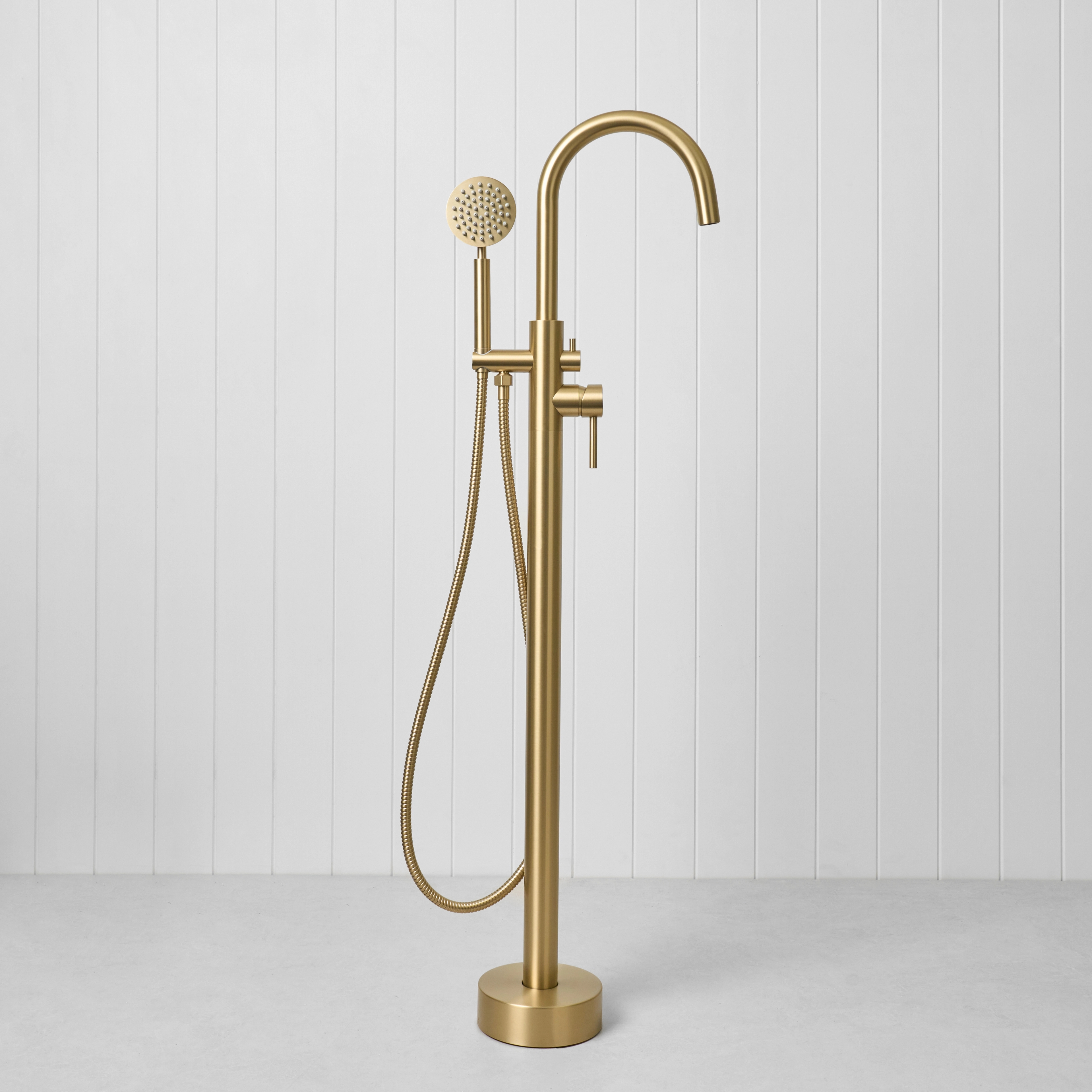 The Freestanding Bath Spout + Round Hand Shower in Brushed Brass combines a freestanding bath filler with the added flexibility of a handheld shower. Designed for both comfort and everyday use, it gives you everything you need in one simple setup.