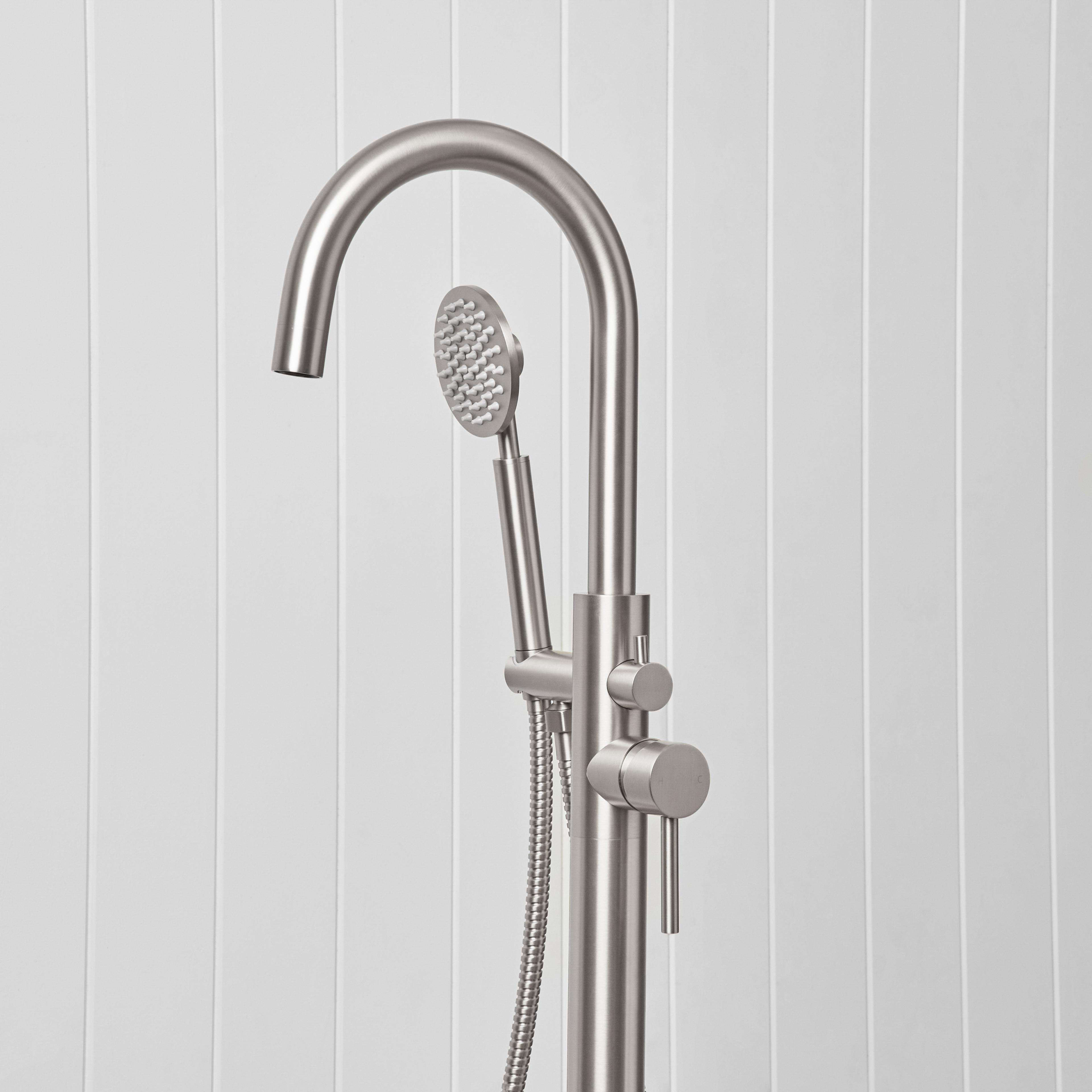 Freestanding Bath Spout + Round Hand Shower Stainless Steel
