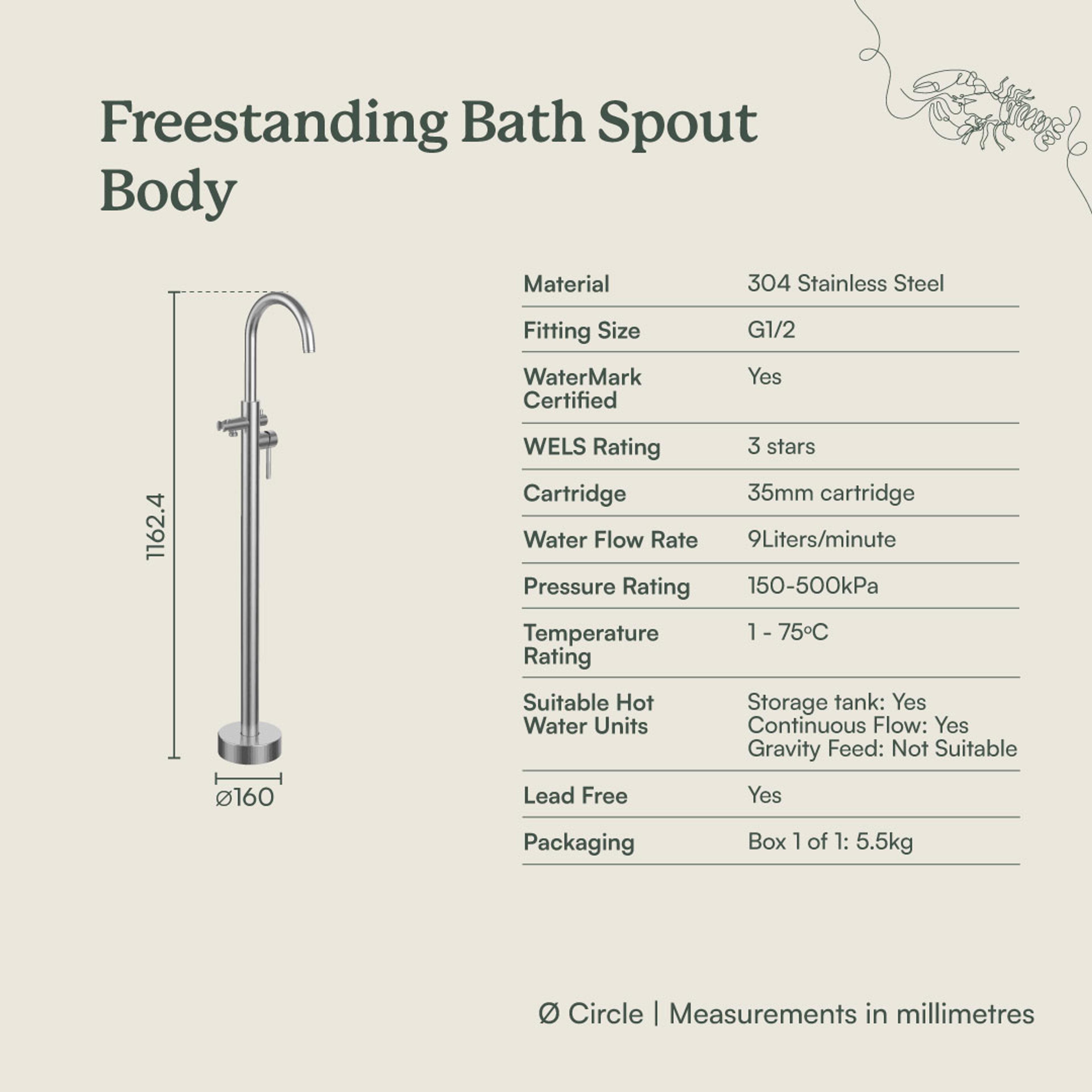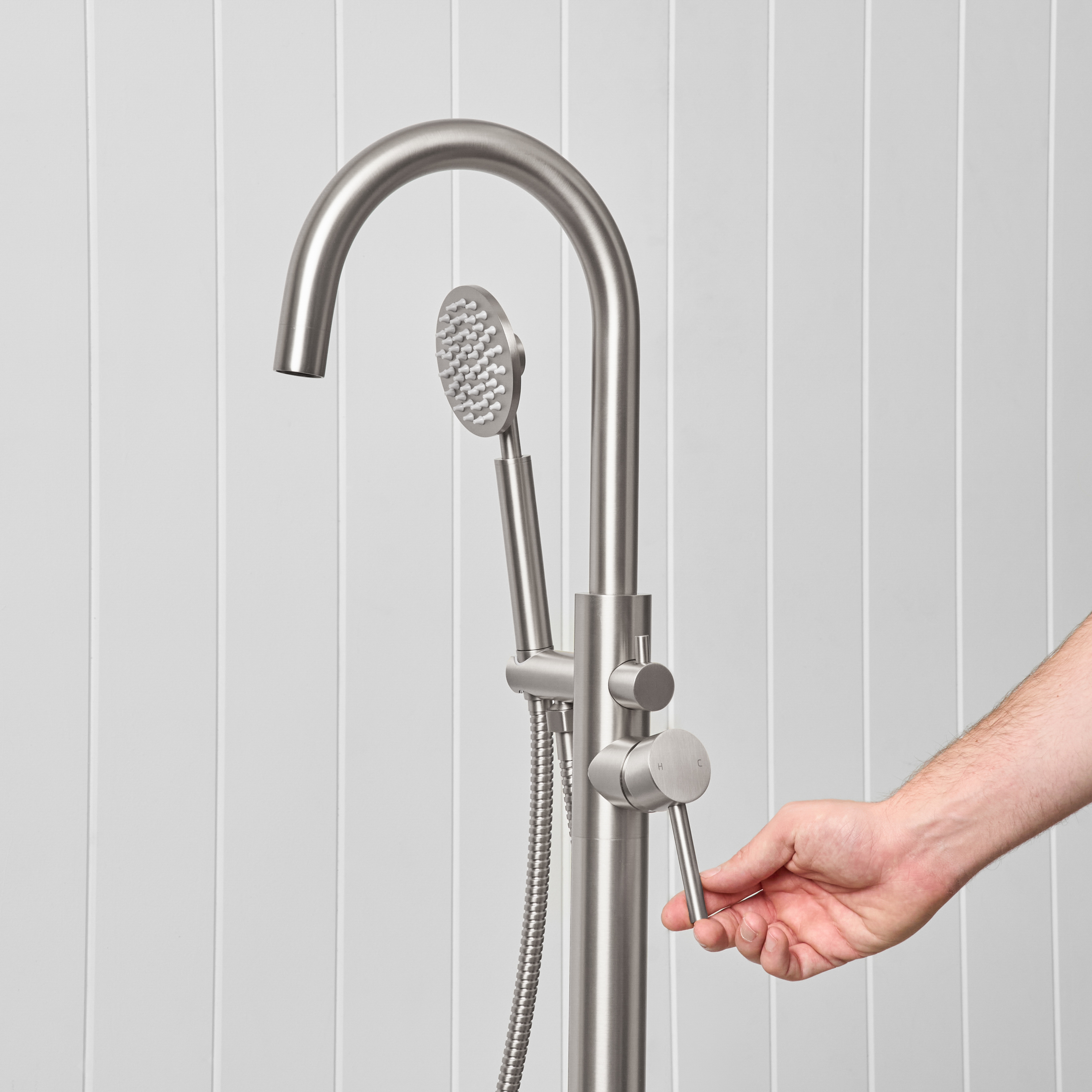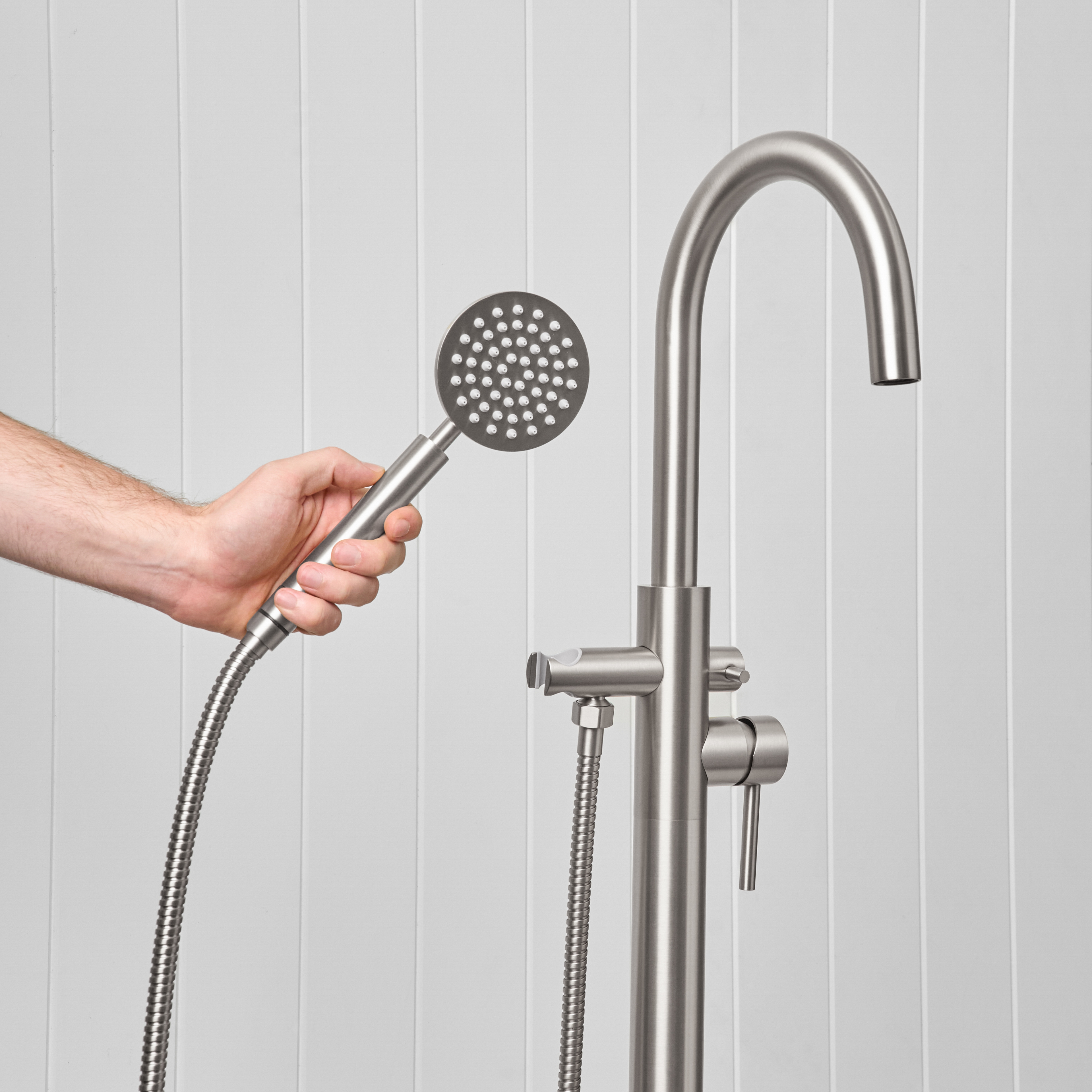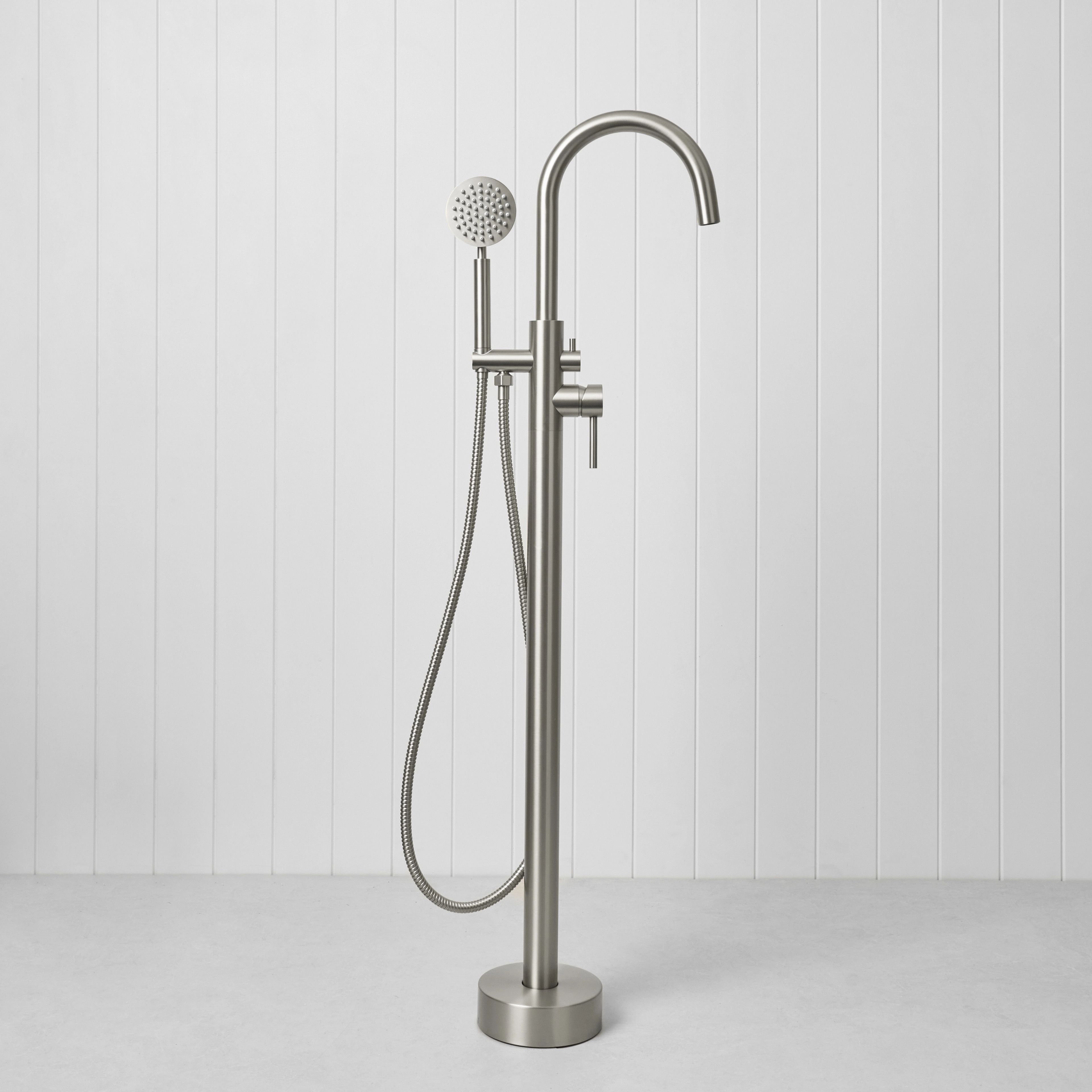 The Freestanding Bath Spout + Round Hand Shower in Stainless Steel combines a freestanding bath filler with the added flexibility of a handheld shower. Designed for both comfort and everyday use, it gives you everything you need in one simple setup.
