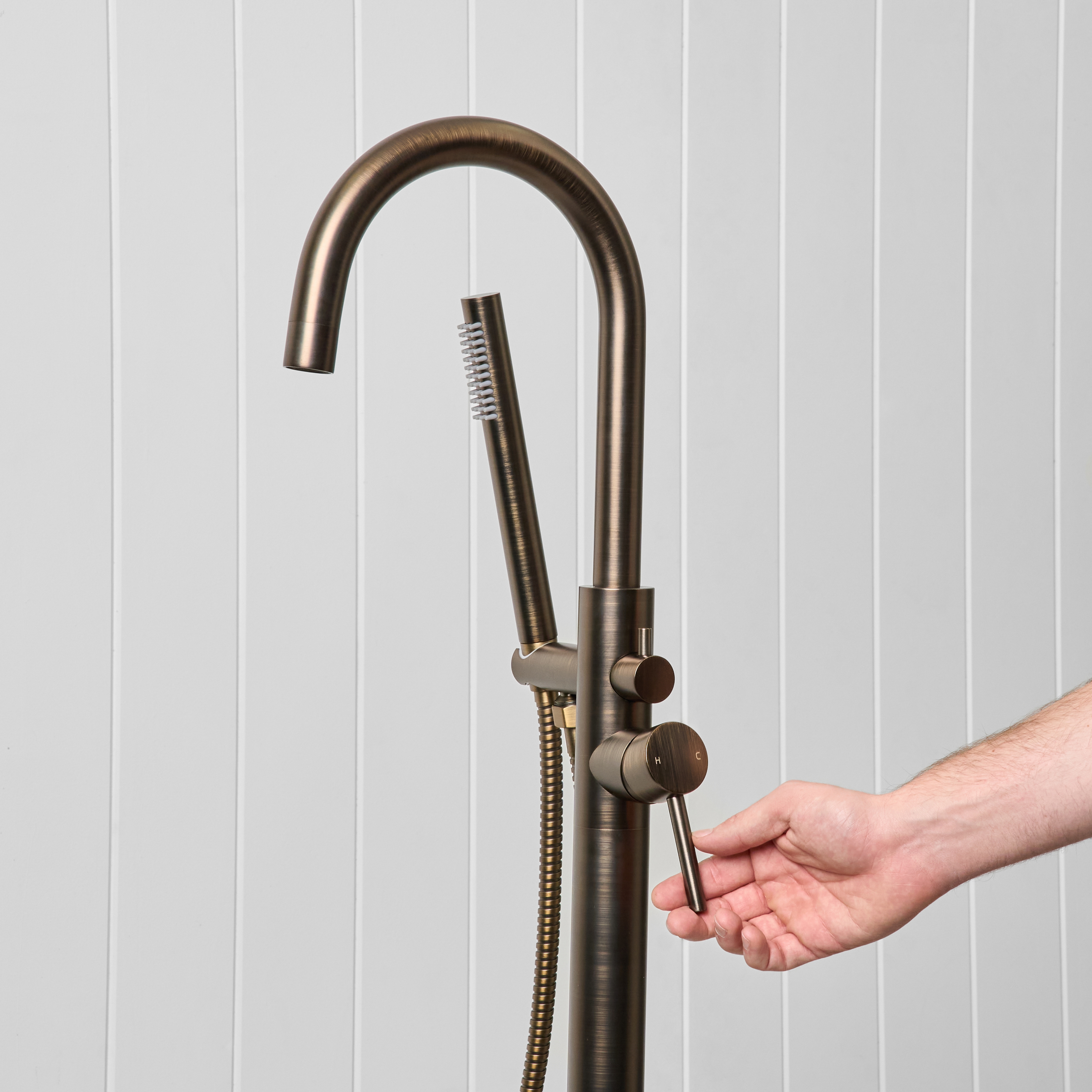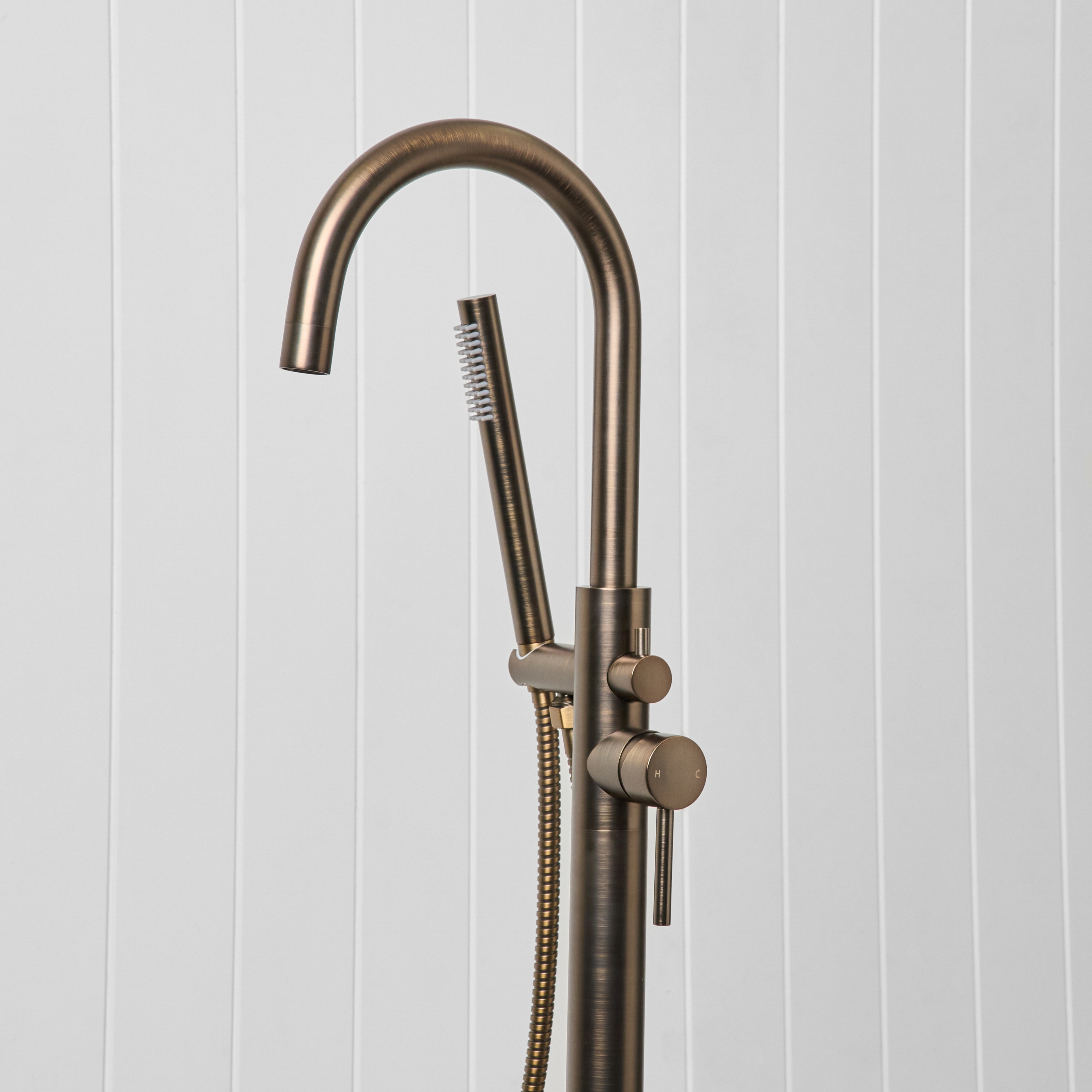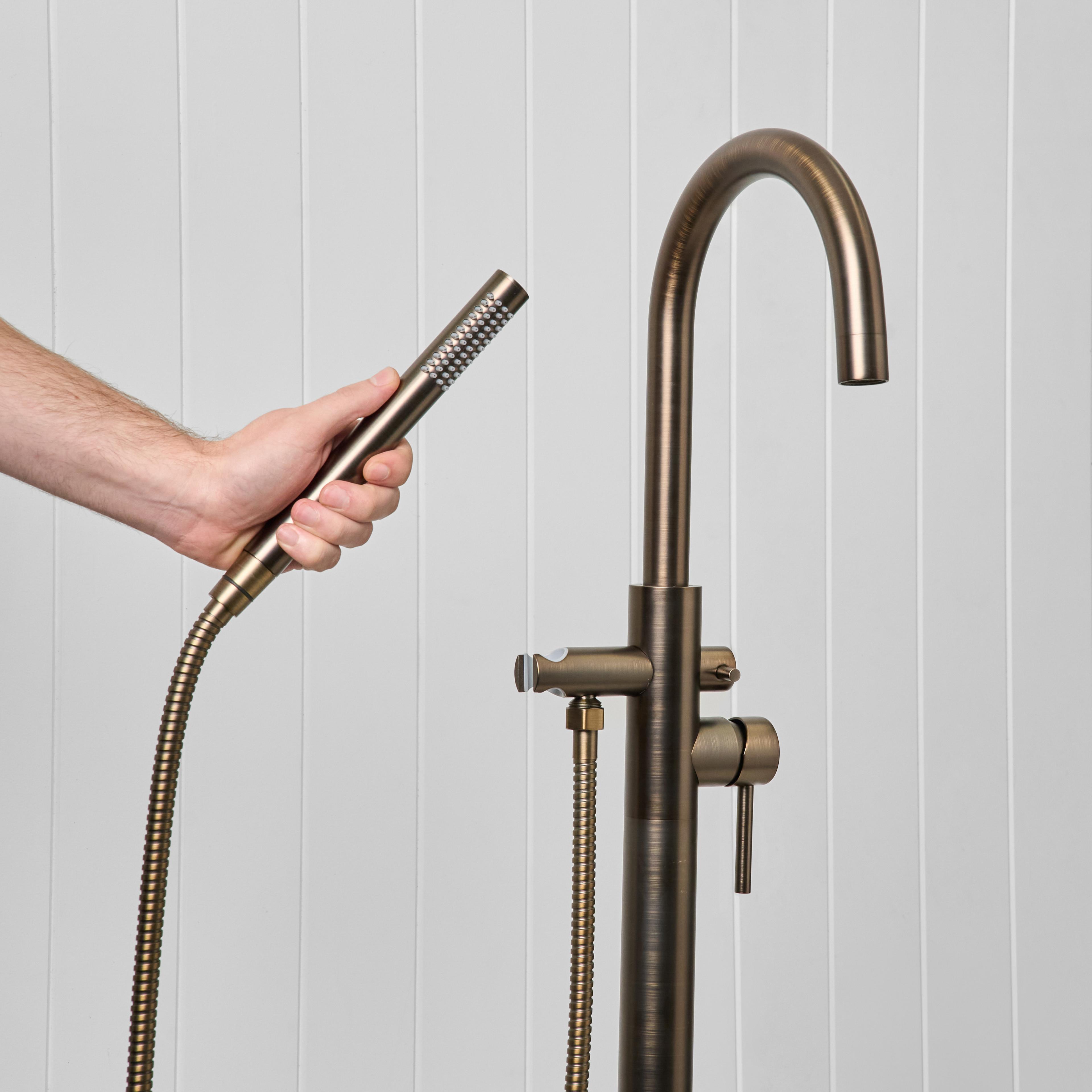 The Freestanding Bath Spout + Straight Hand Shower in Antique Brass combines a freestanding bath filler with the added flexibility of a handheld shower. Designed for both comfort and everyday use, it gives you everything you need in one simple setup.