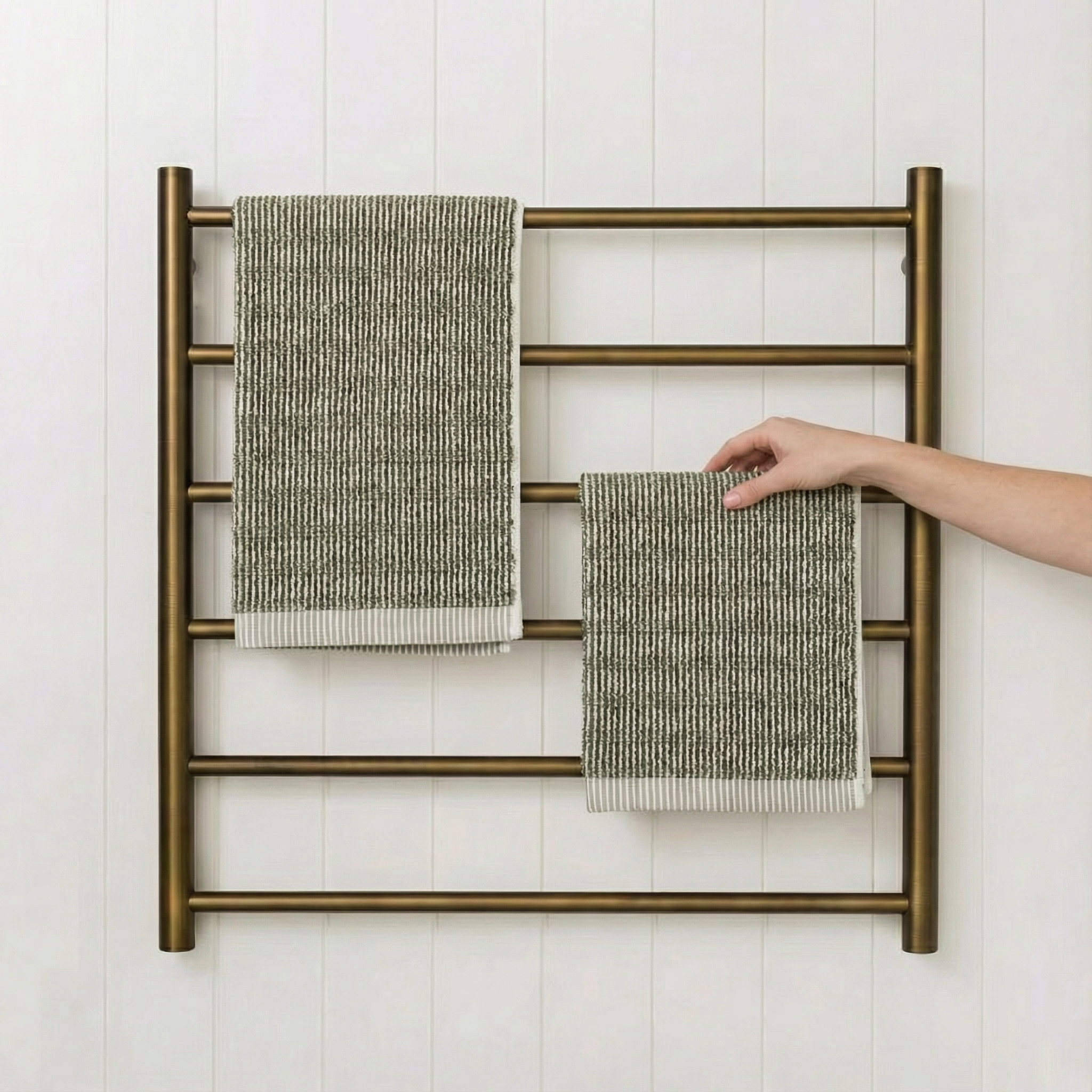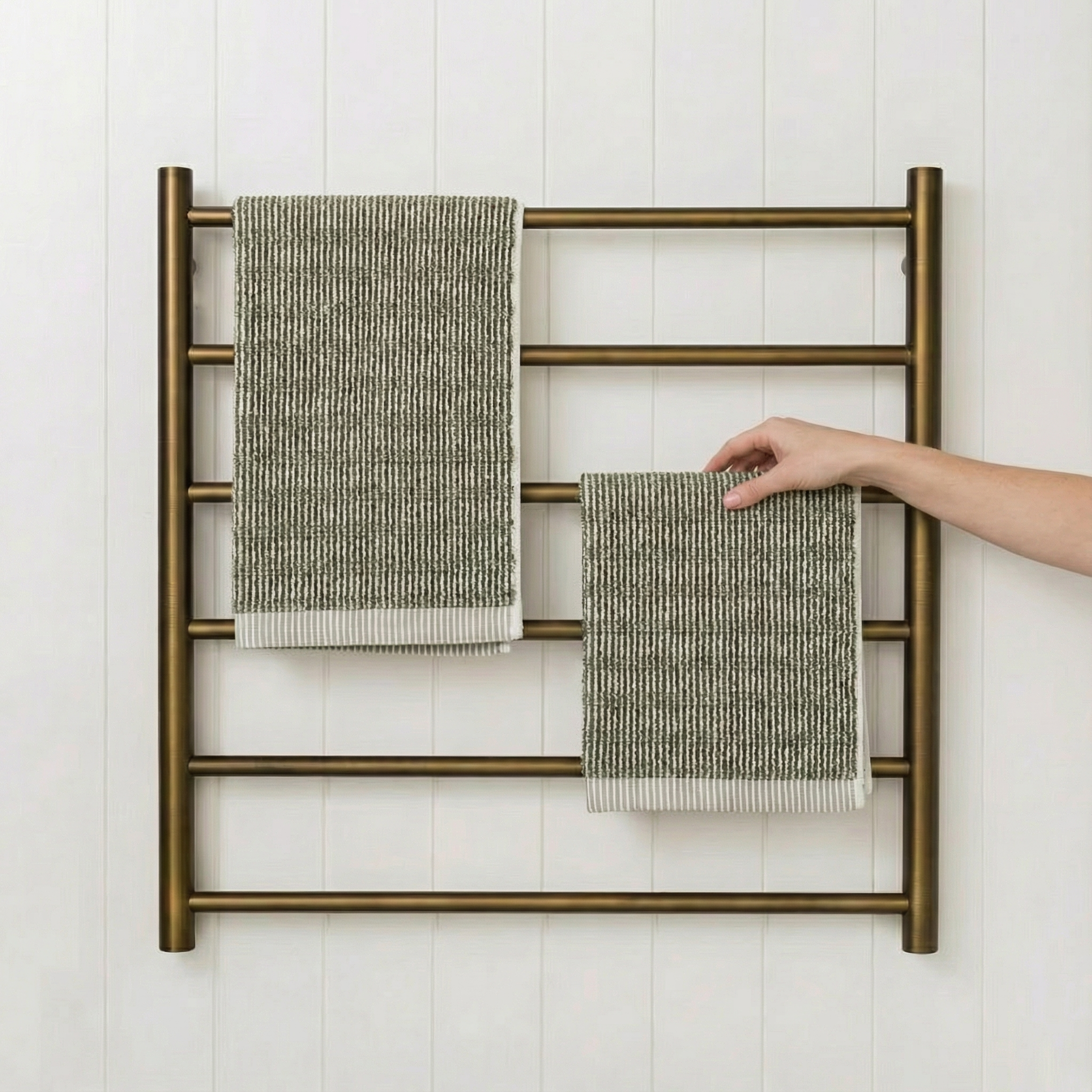 Made from strong 304 stainless steel with concealed wiring and a durable Antique Brass finish. A simple, functional upgrade for households that want warmer, fresher towels and a more organised space.