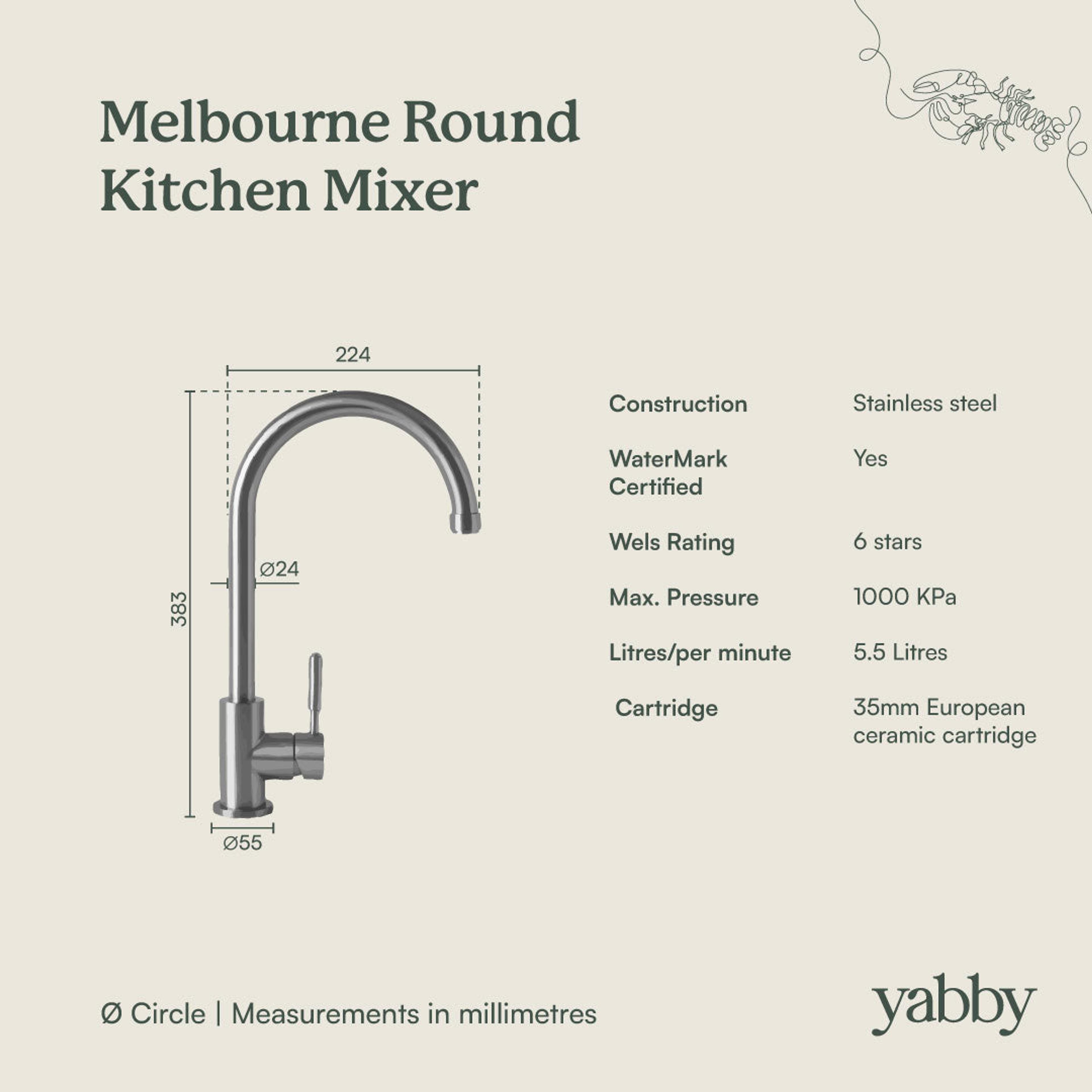 The Melbourne Round Kitchen Mixer in Warm Brushed Nickel pairs everyday functionality with a soft, brushed finish that’s easy to maintain. With a 6-star WELS rating, stainless steel body, and 35mm ceramic cartridge, it’s efficient, durable, and simple to install.