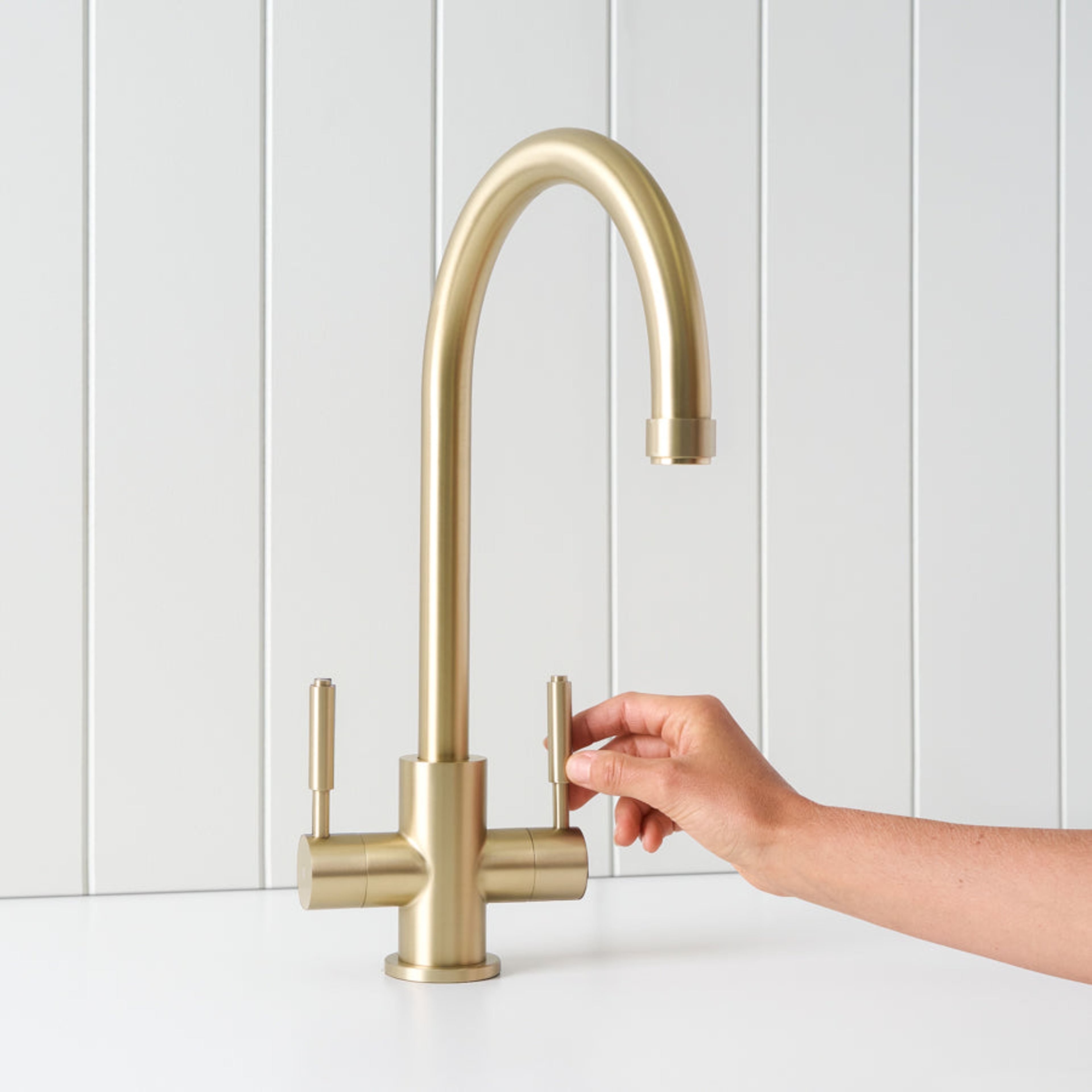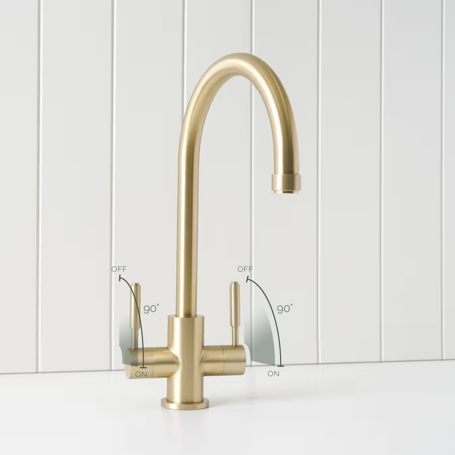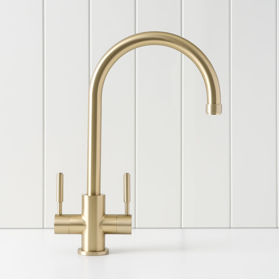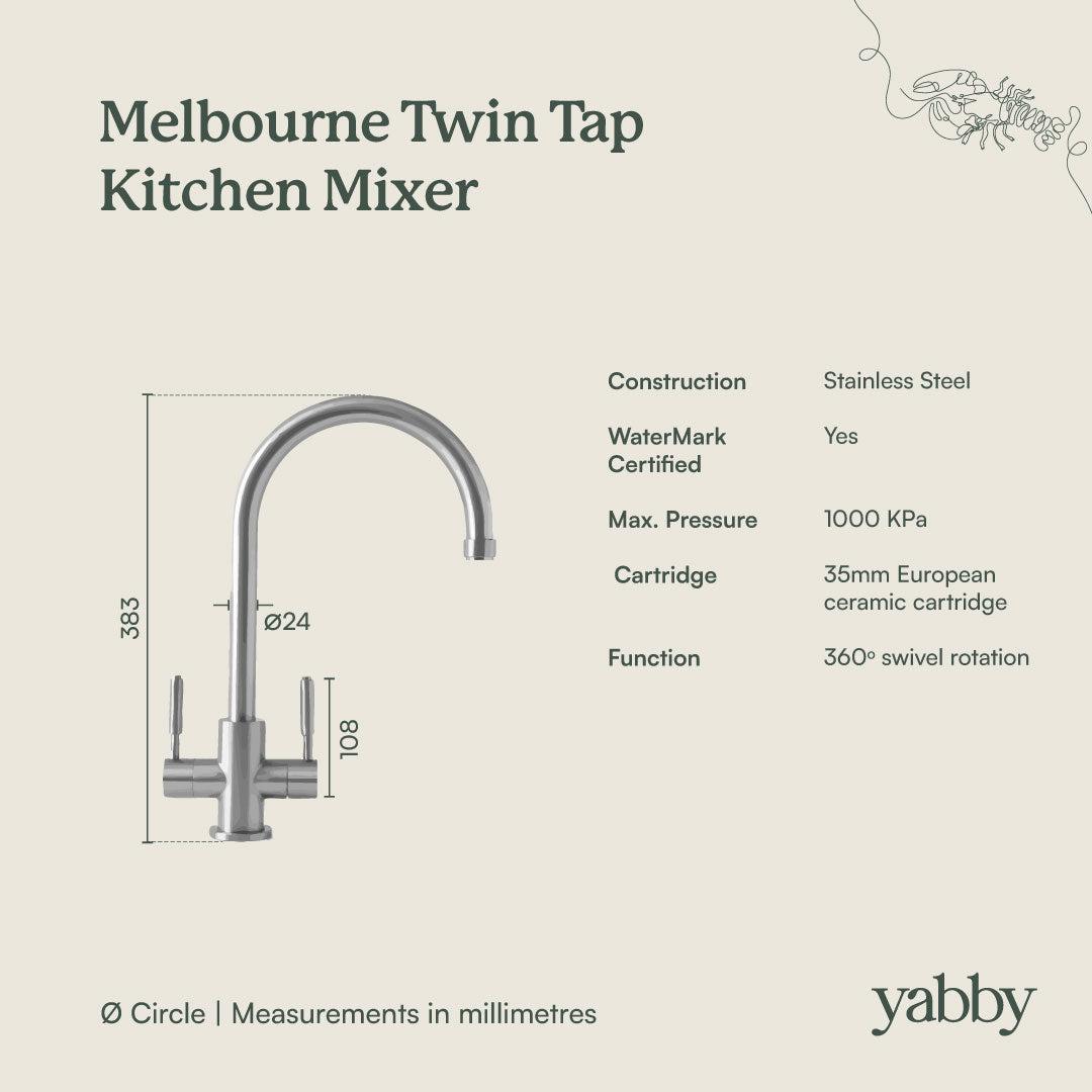 The Melbourne Twin Tap Kitchen Mixer in Warm Brushed Nickel is practical, durable, and easy to use. With two mixers for hot and cold water, a 360° swivel spout, and a 35mm ceramic cartridge, it delivers smooth flow and long-lasting reliability. Simple design, solid function.