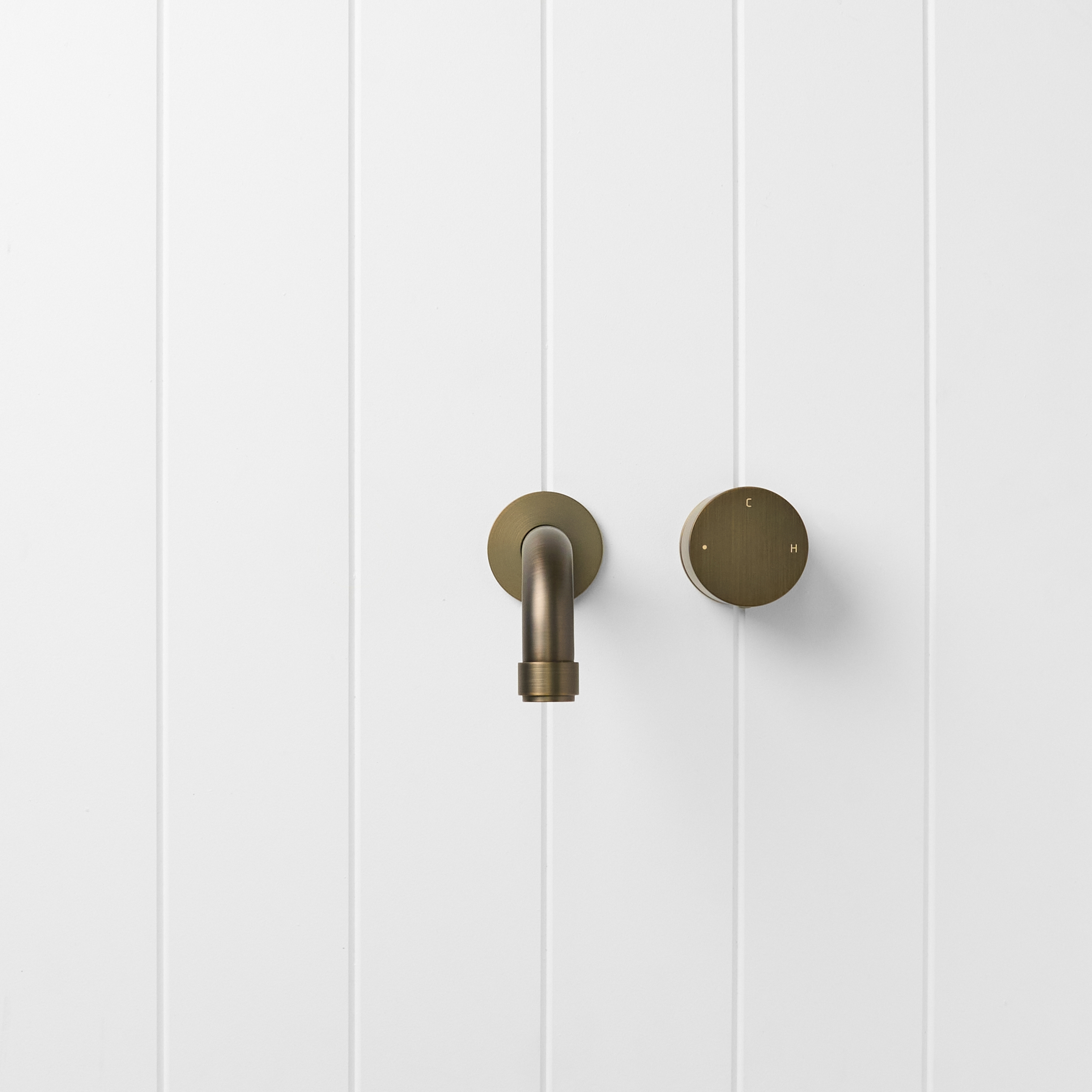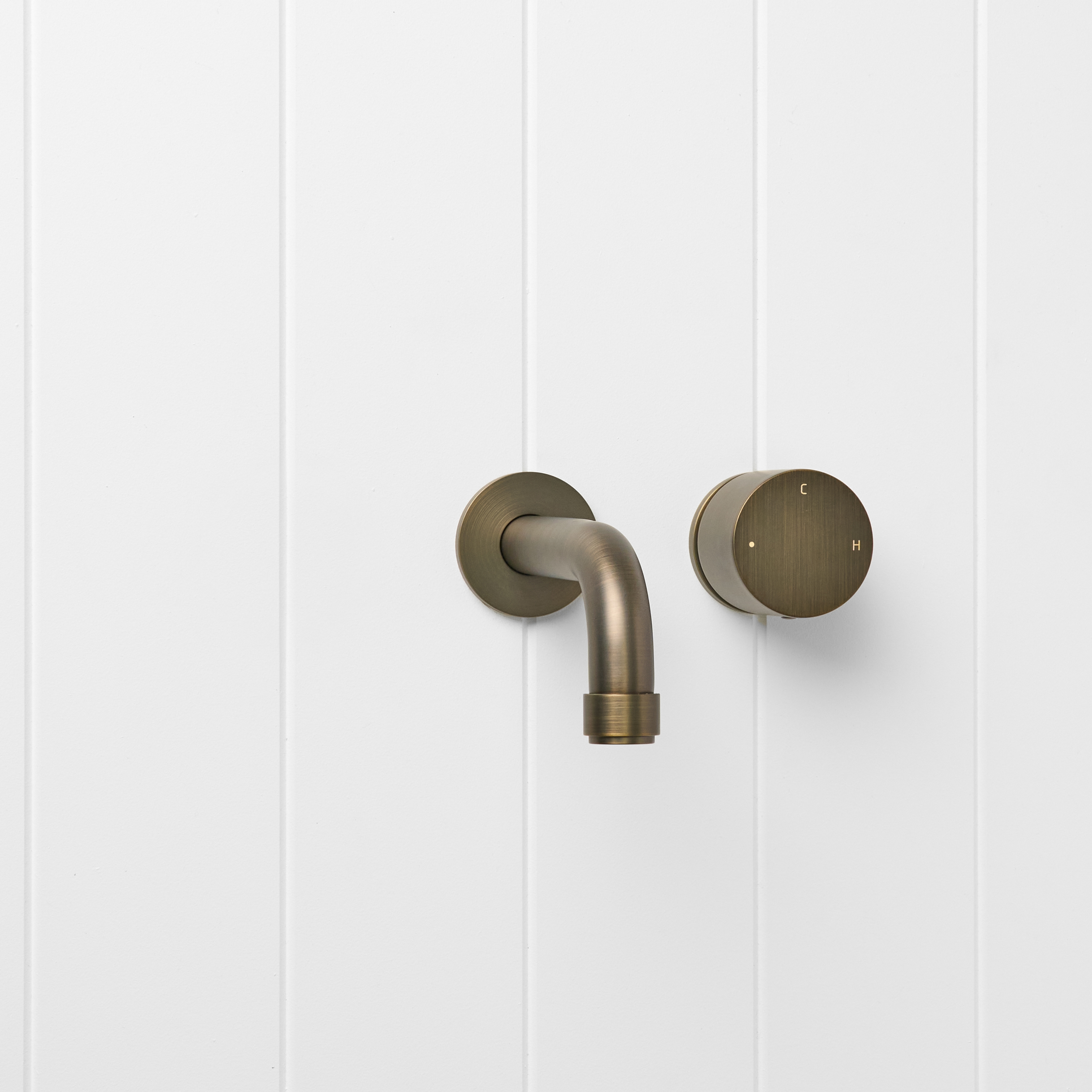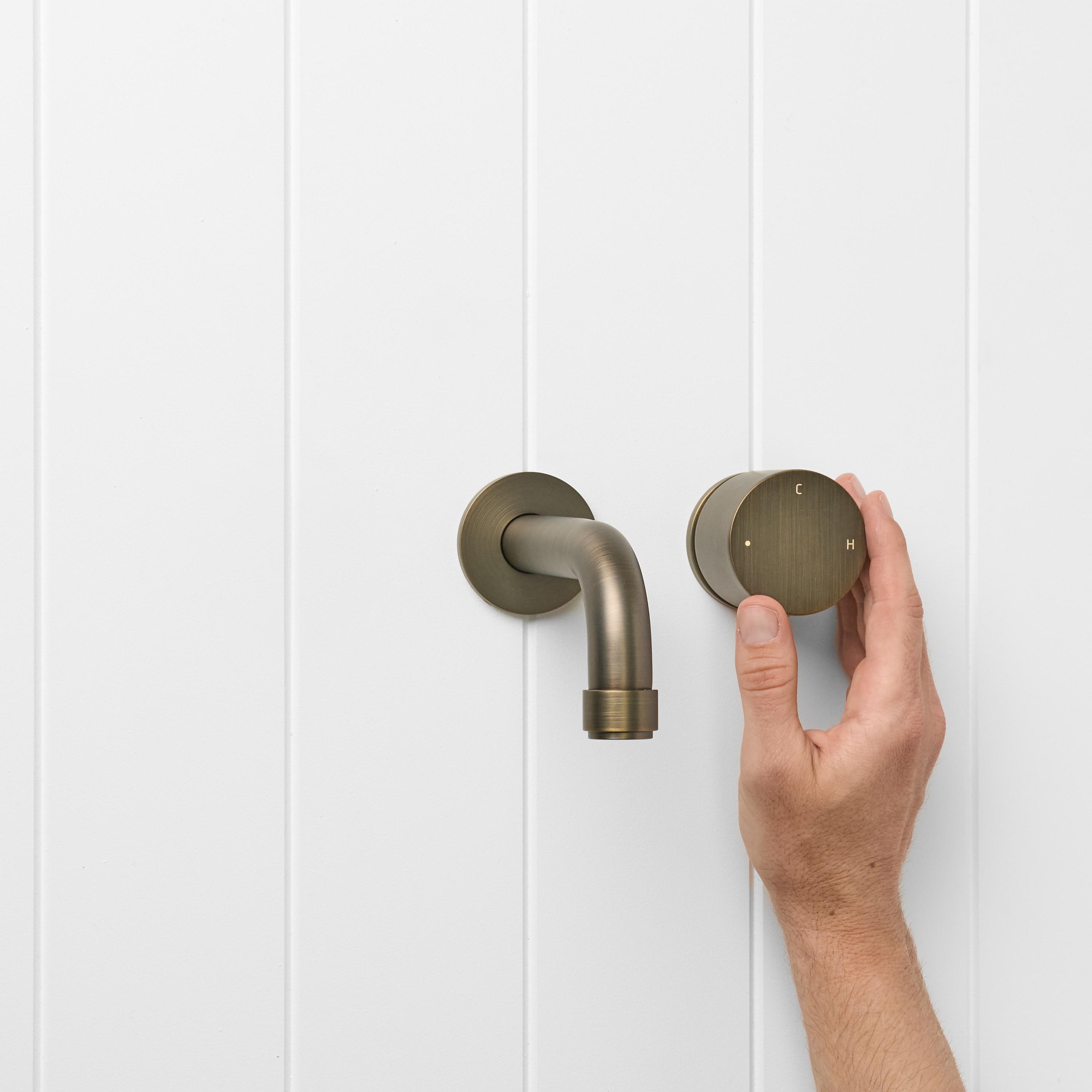 The Melbourne Wall Spout and Progressive Mixer in Antique Brass brings a warm, sculptural touch to the basin or bath. The curved wall spout and single progressive mixer in Antique Brass over stainless steel keep the wall calm while you dial from cold to warm in one smooth turn. It is a design forward bathroom tapware set that feels considered every day.