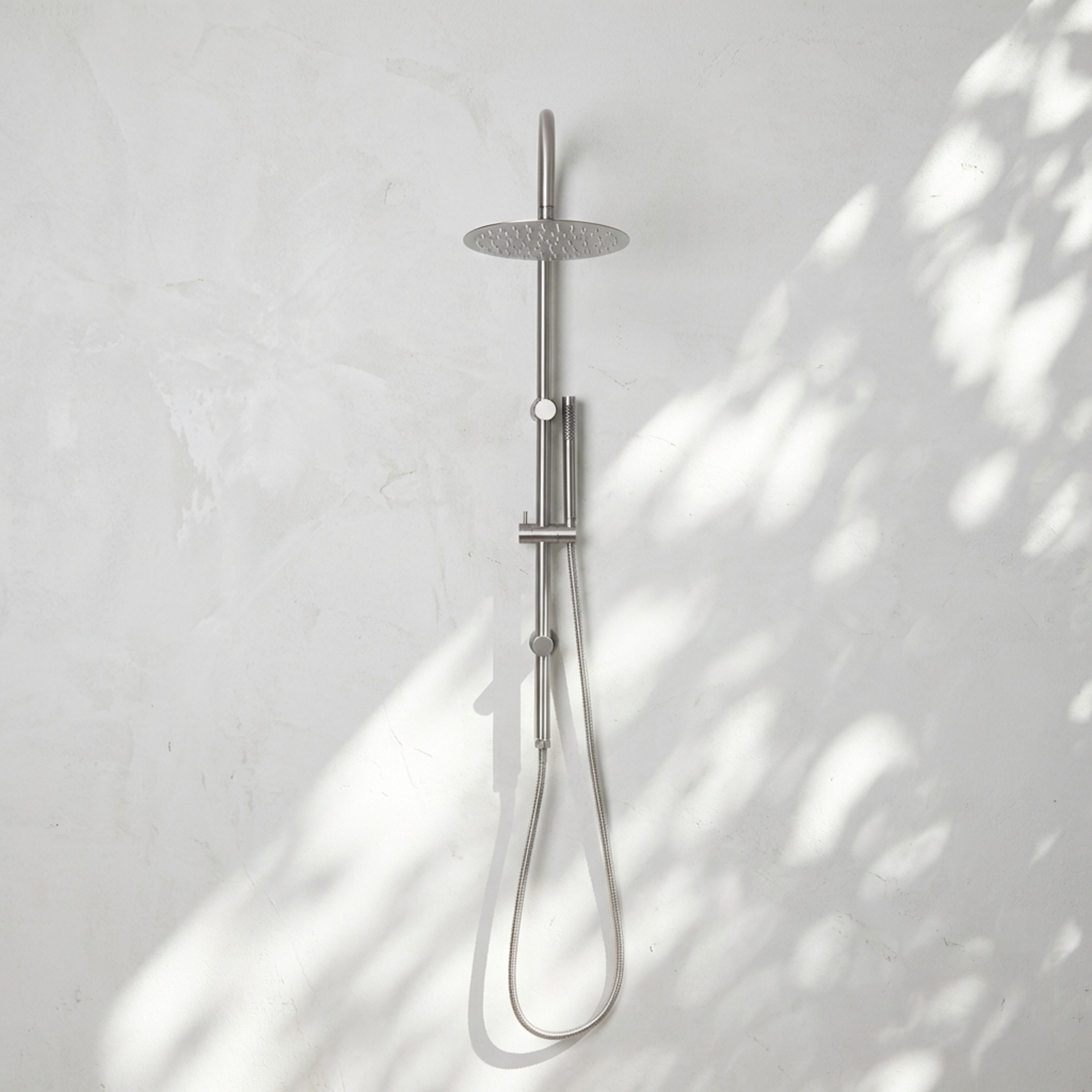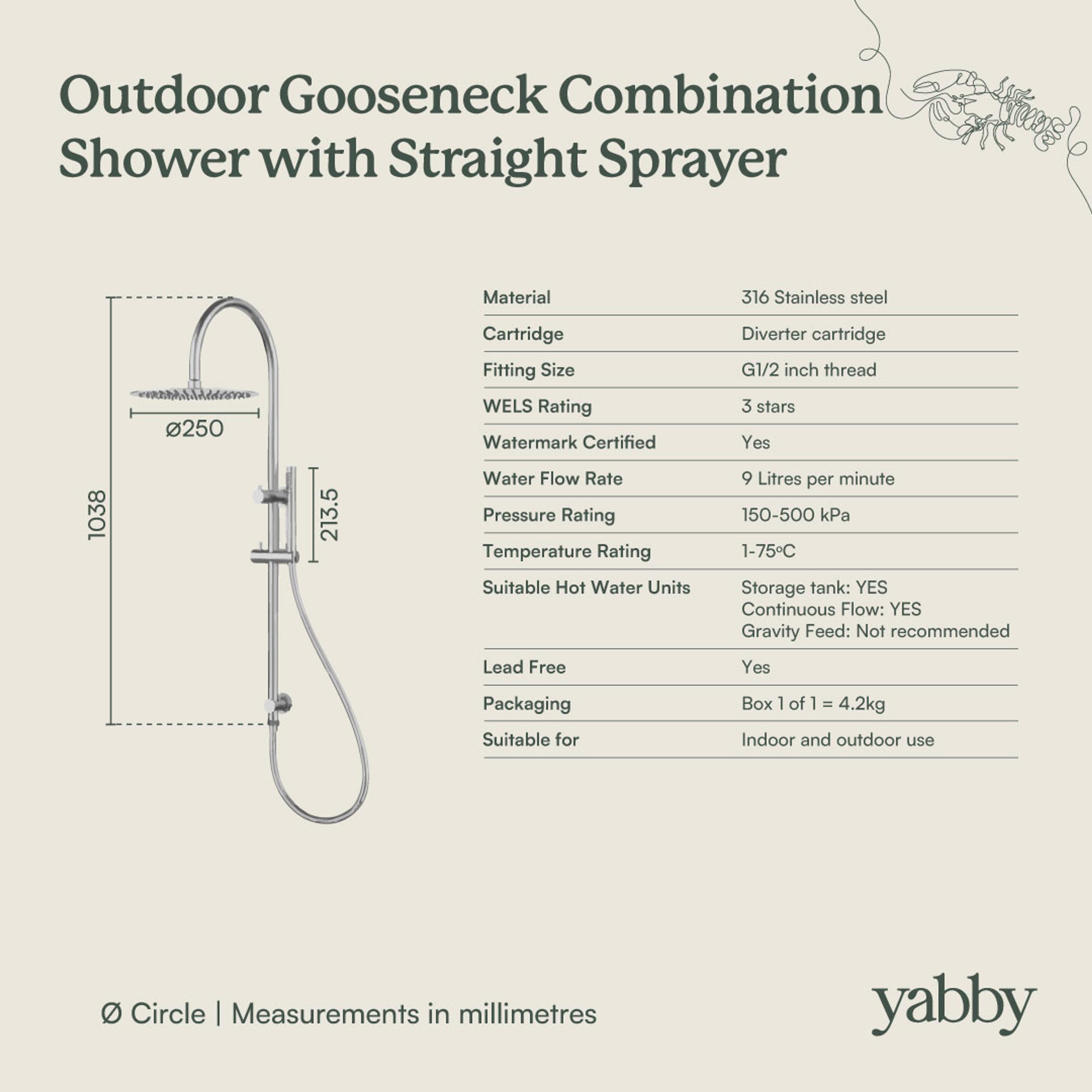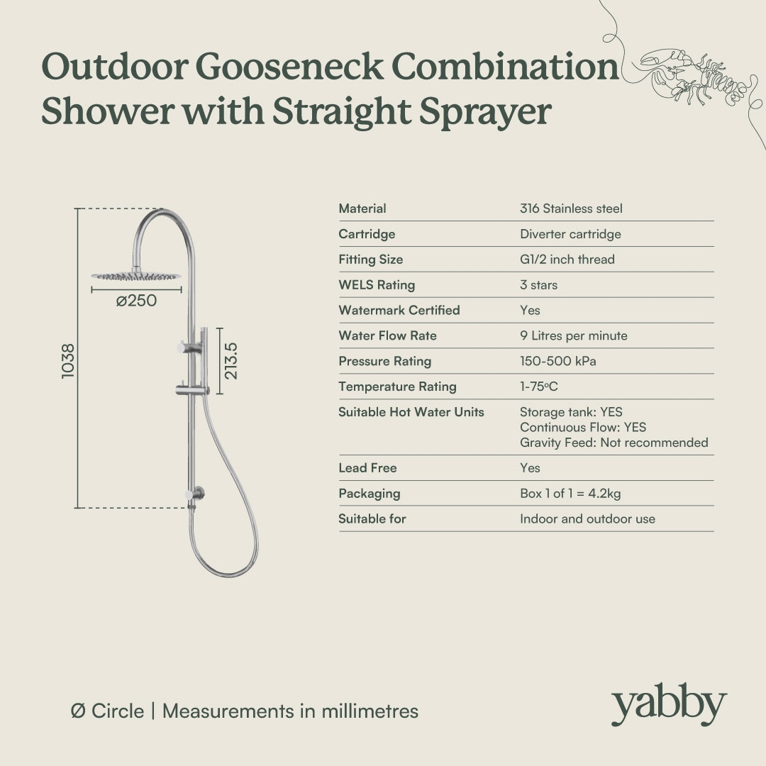 The Outdoor Gooseneck Combination Shower combines an overhead rain shower with our Straight Shower Hose + Sprayer, offering a practical solution for outdoor use. Made from durable 316 stainless steel, it’s designed to handle outdoor conditions with ease.