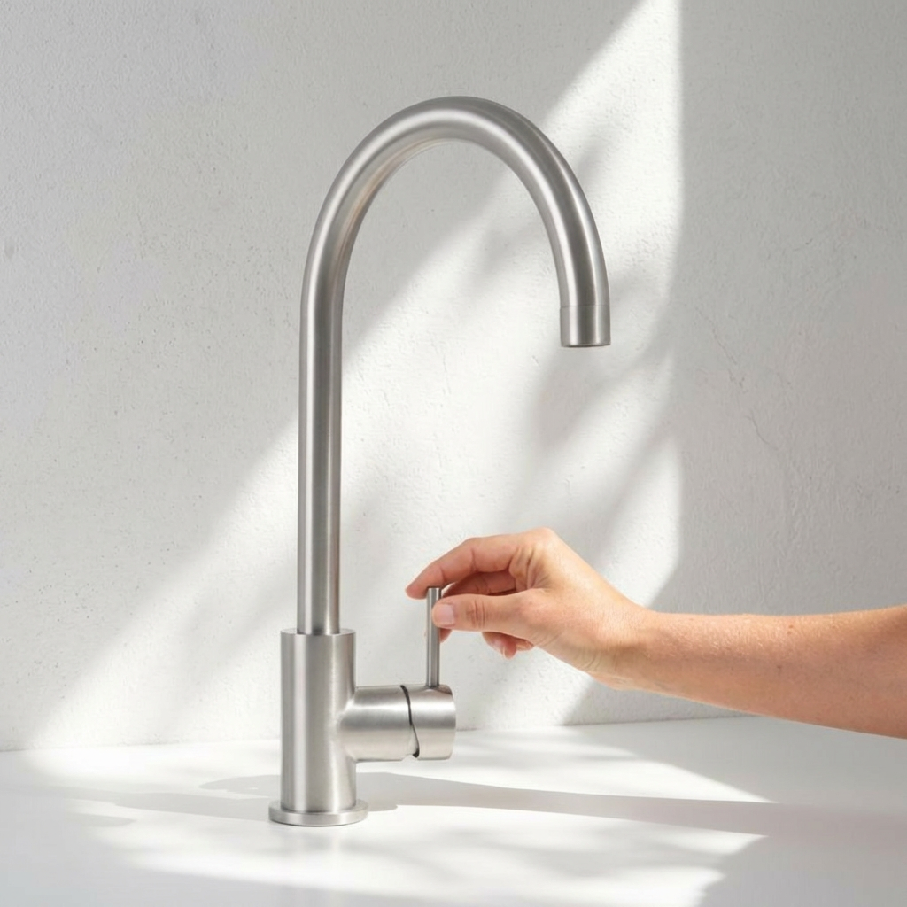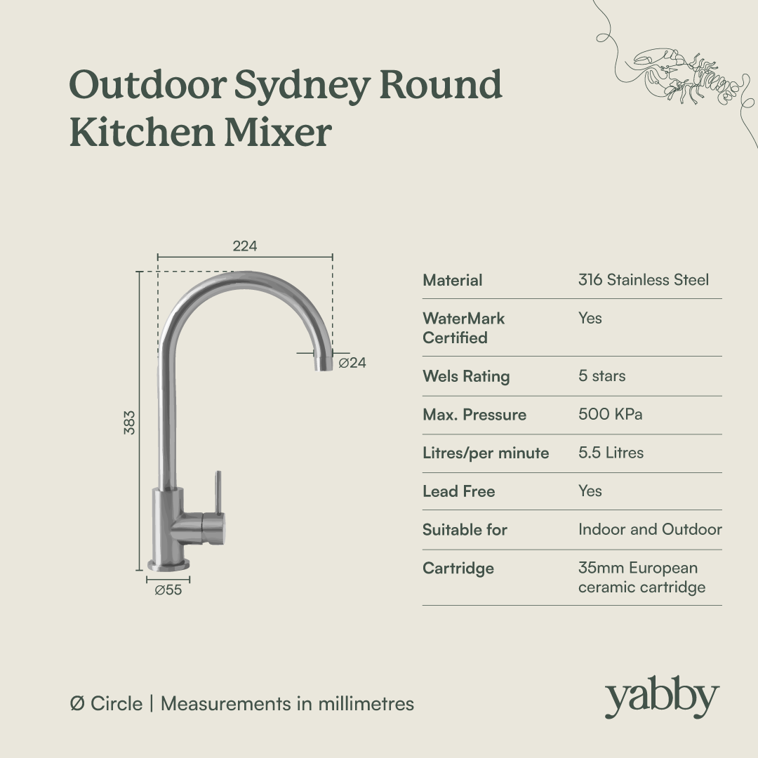 The Outdoor Sydney Round Kitchen Mixer in Stainless Steel is designed for outdoor kitchens that need reliable performance with a clean, modern look. Made from durable 316 stainless steel, it’s built to handle outdoor conditions while keeping a simple, timeless appearance.
