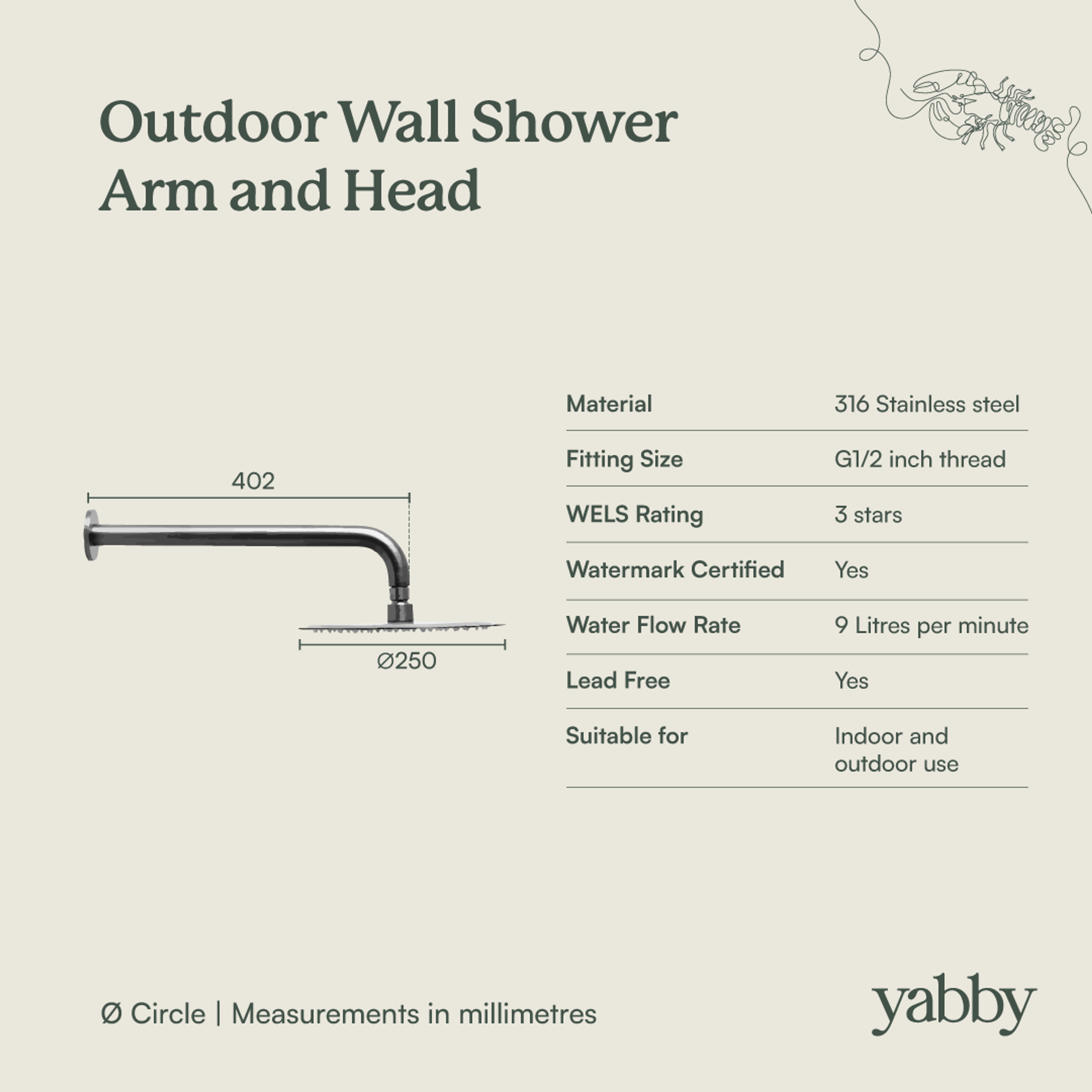 The Outdoor Wall Shower Arm and Head in Stainless Steel offers a simple and reliable outdoor showering solution. Made from durable 316 stainless steel, it’s designed to handle outdoor conditions while maintaining a clean, modern look.