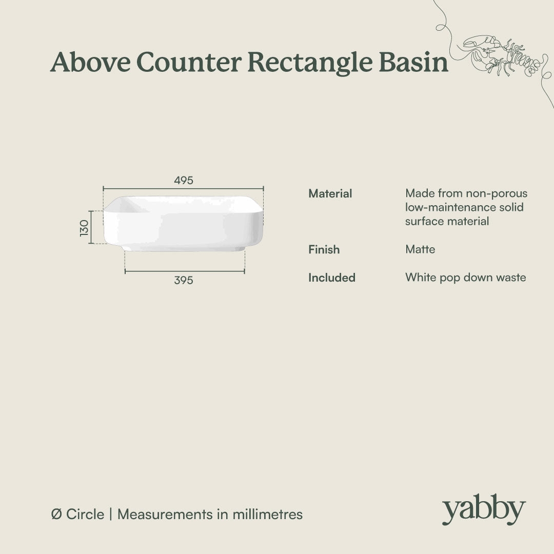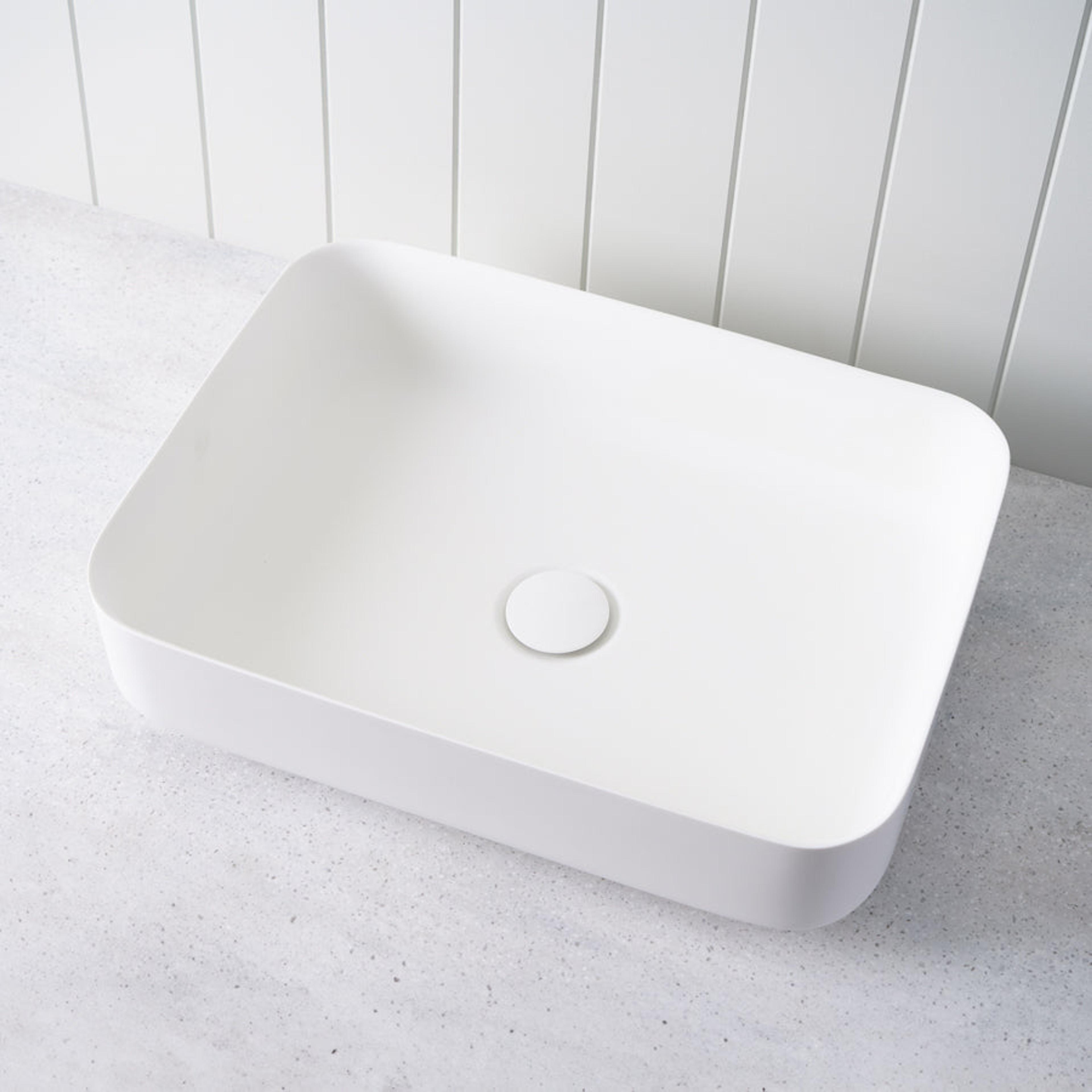 The Above Counter Rectangle Basin in Matte White is made for everyday family bathrooms and ensuites. The generous rectangle bowl, raised sides and centred waste help keep water in the basin, not across the bench, while the non porous solid surface is easy to wipe clean. By using a smaller cut out than an inset basin, it preserves valuable storage space inside the vanity.