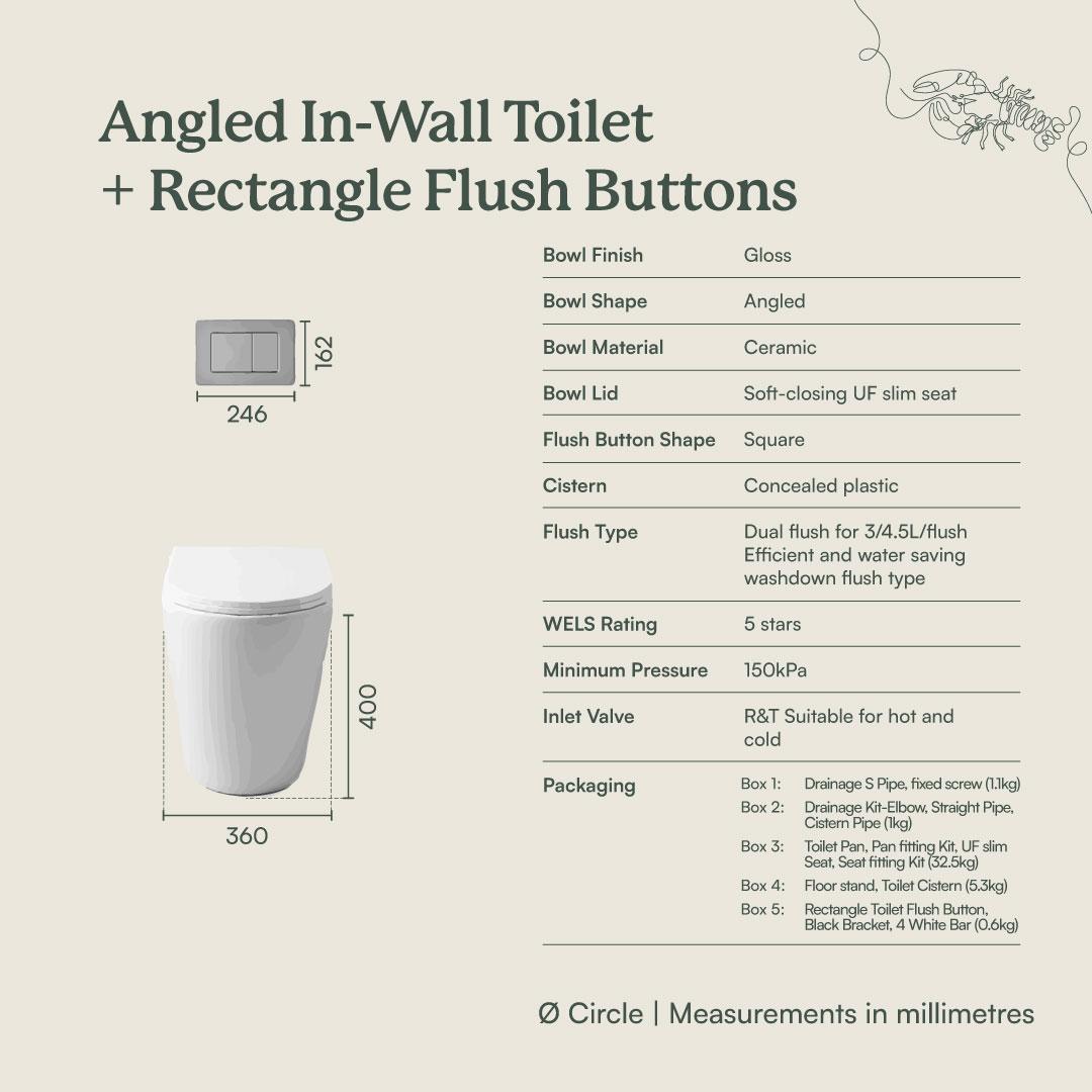 The Angled In-Wall Toilet With Rectangle Matte White Buttons offers a seamless blend of practicality and style, perfect for modern Australian homes. Its in-wall design ensures smooth operation and easy installation, making it a reliable choice for any bathroom. Built with premium materials, this toilet bundle promises long-lasting performance and everyday ease.