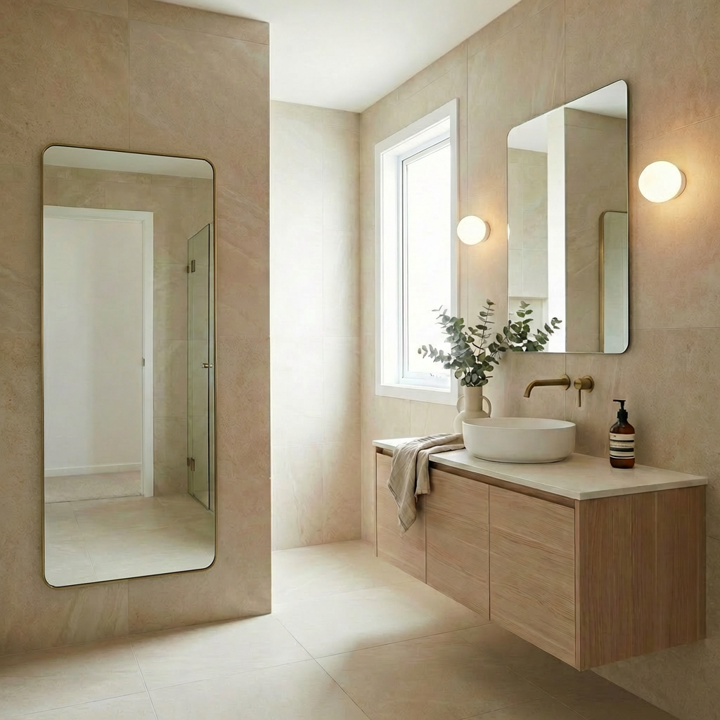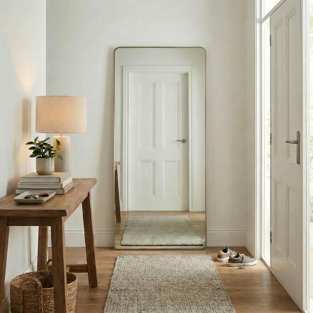 The Rectangular Full Length Mirror in Antique Brass is a handy bathroom mirror that can sit on your vanity or be fixed to the wall with the included brackets. The sturdy metal frame stands up to daily use and humidity, while the warm brass tone hides small marks. Ideal for renters or renovators who like flexible styling.