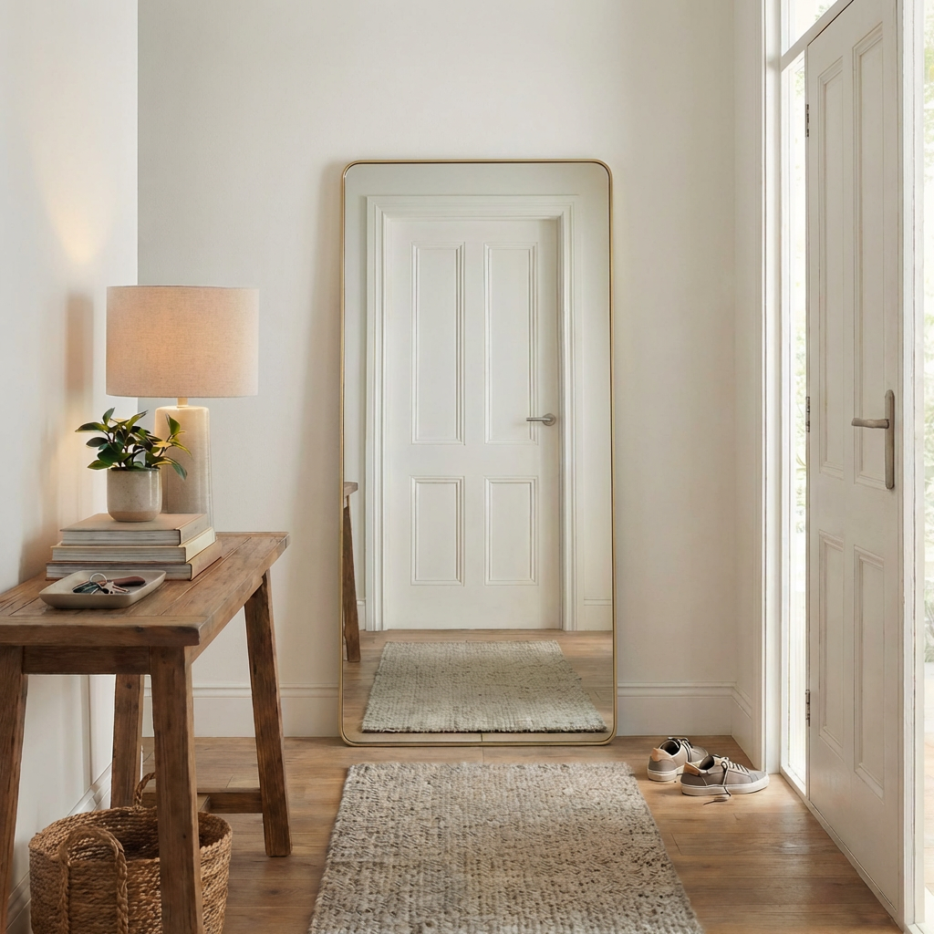 The Rectangular Full Length Mirror in Warm Brushed Nickel is a practical choice if you want a neutral, low fuss bathroom mirror. The soft brushed finish helps disguise fingerprints, and the frame is designed to handle steamy spaces. Use it free standing or install it with the included wall brackets for a more permanent setup.