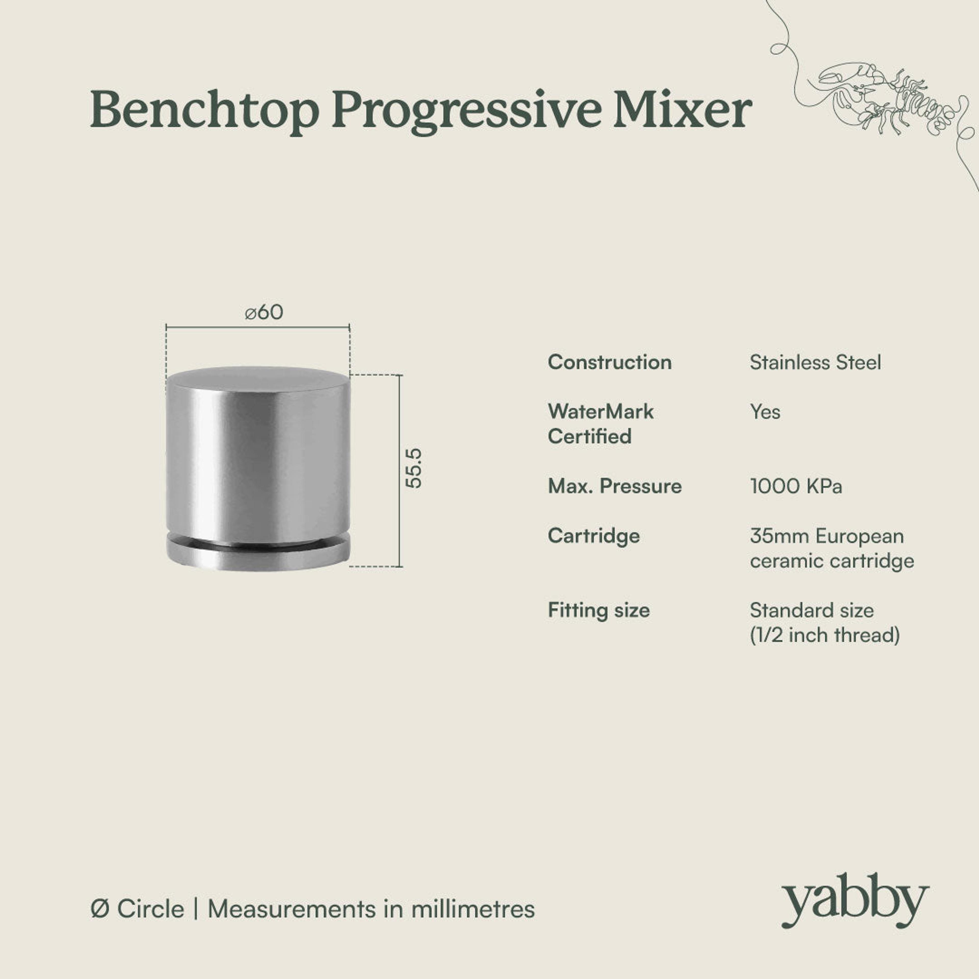 The Round Benchtop Progressive Mixer in Antique Brass is easy to use for every member of the family. Turn the dial to start a soft, cool stream, then keep turning for stronger, warmer water. The clear, gradual control over temperature and pressure helps avoid splashes and gets handwashing and toothbrushing done quickly.