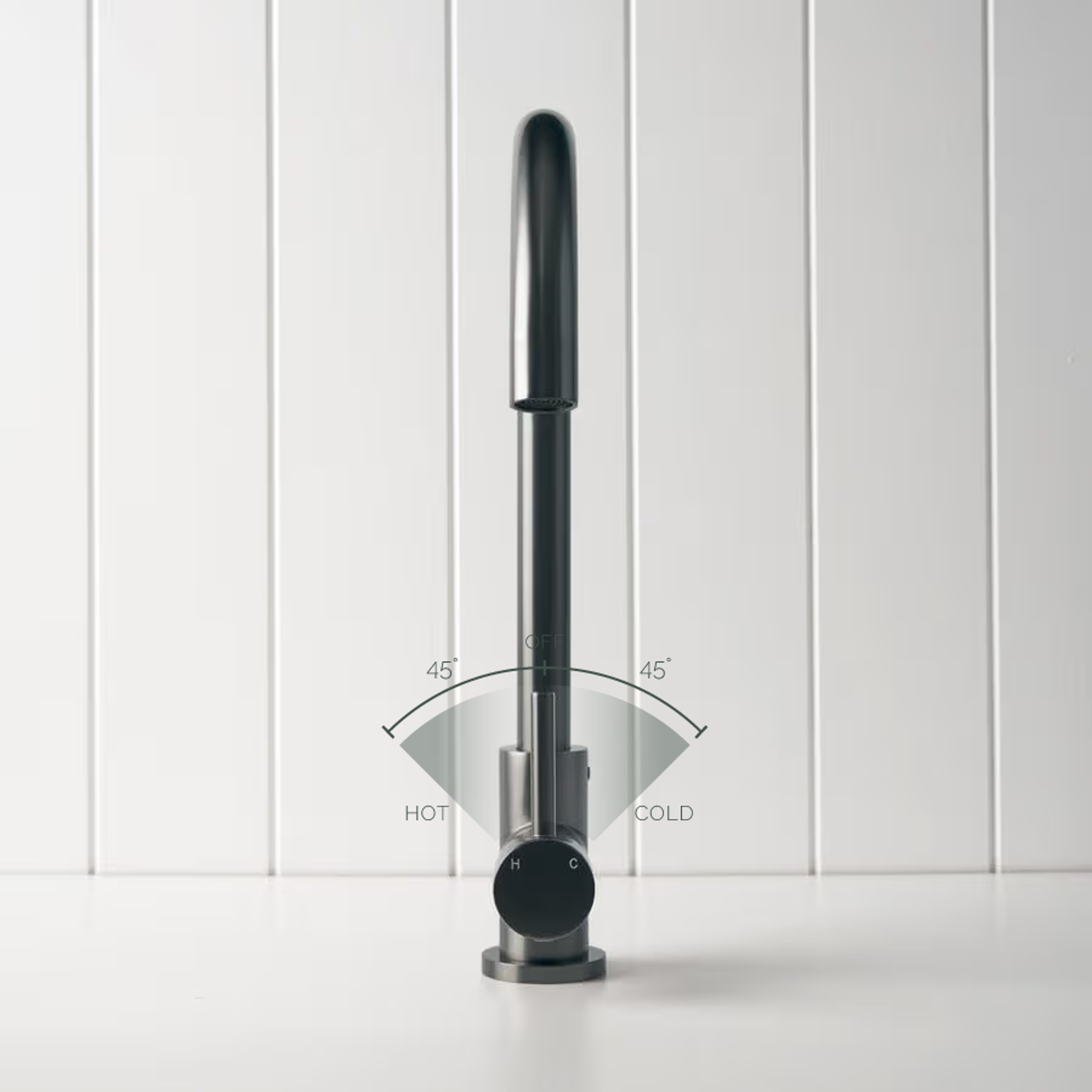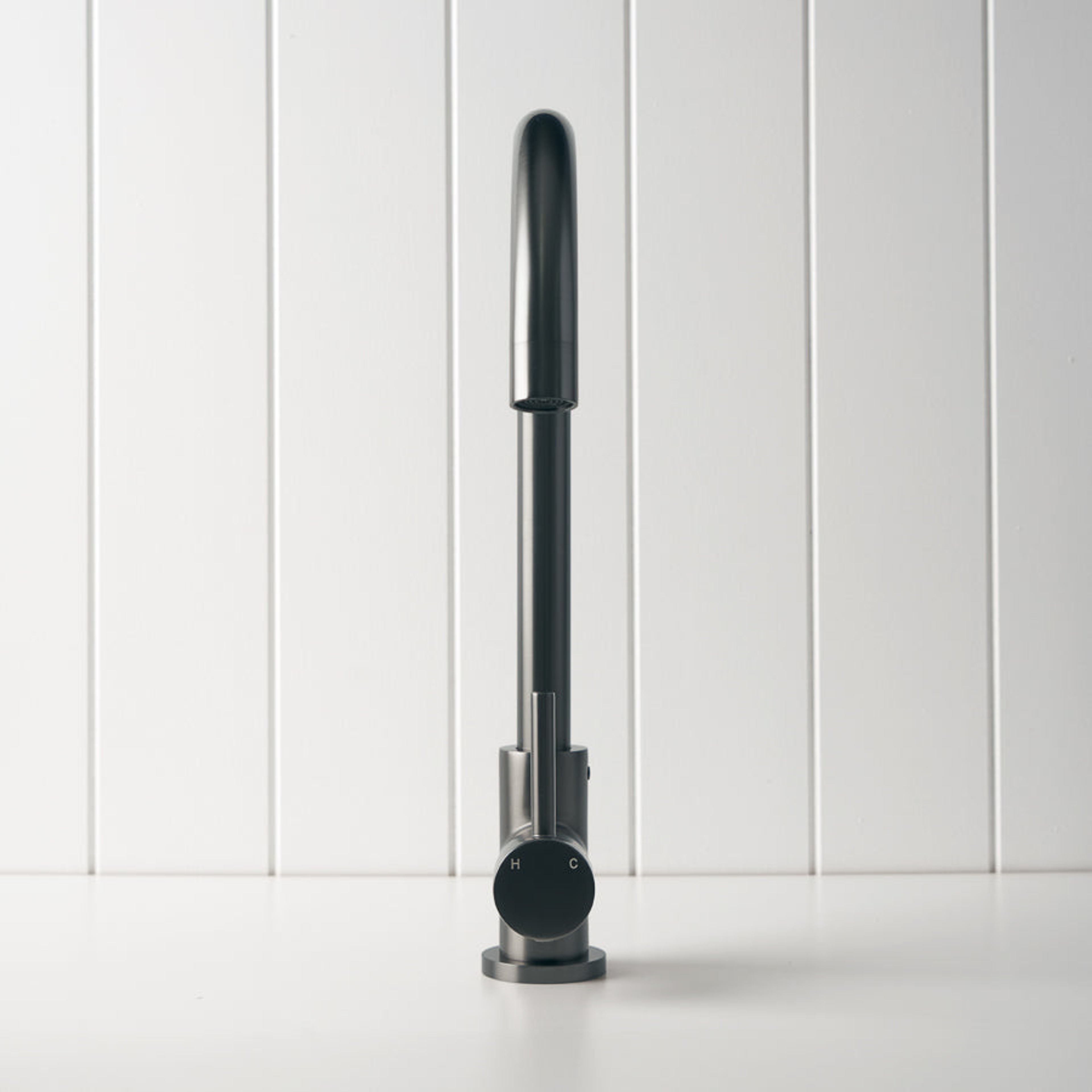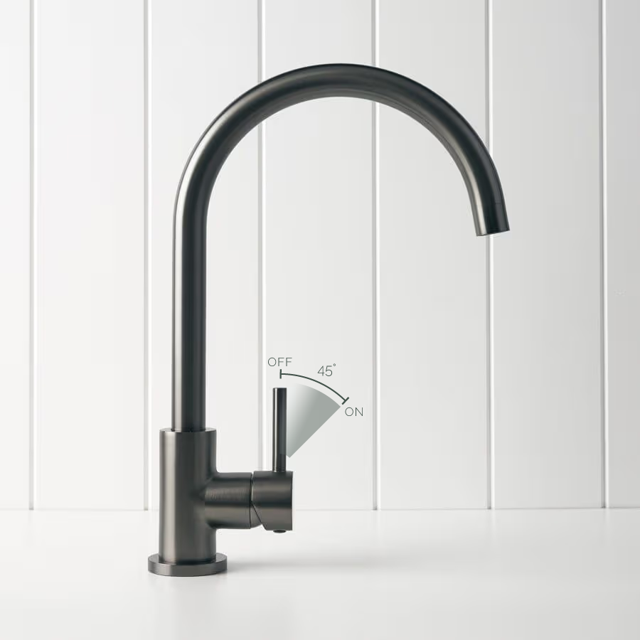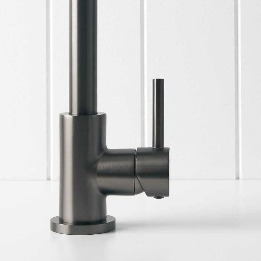 The Round Kitchen Mixer in Gunmetal suits households that want darker fittings without sacrificing practicality. The spout rotates a full 360 degrees, handy for corner and double sinks, while the lever offers simple temperature and flow control. A durable gunmetal kitchen mixer that hides fingerprints well.