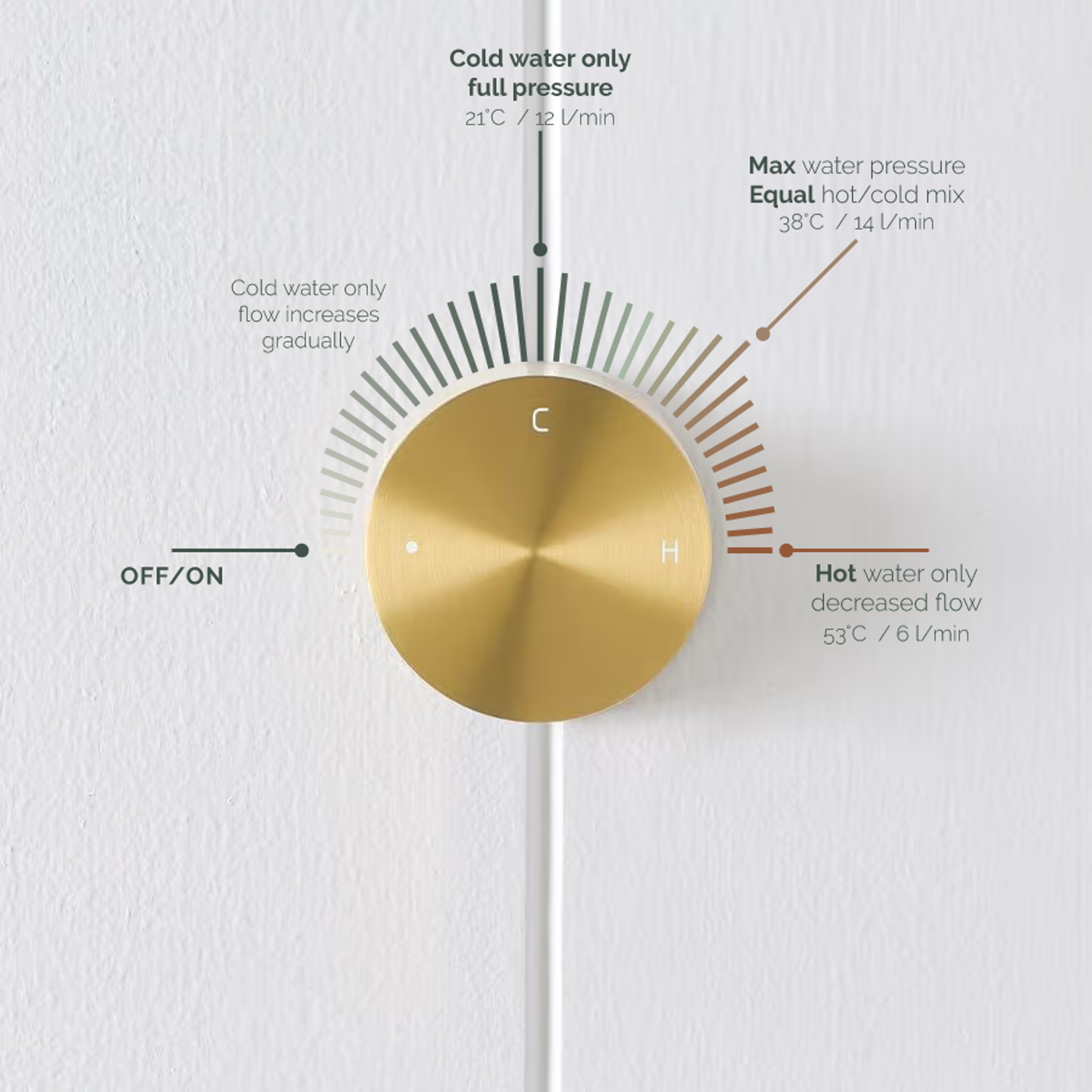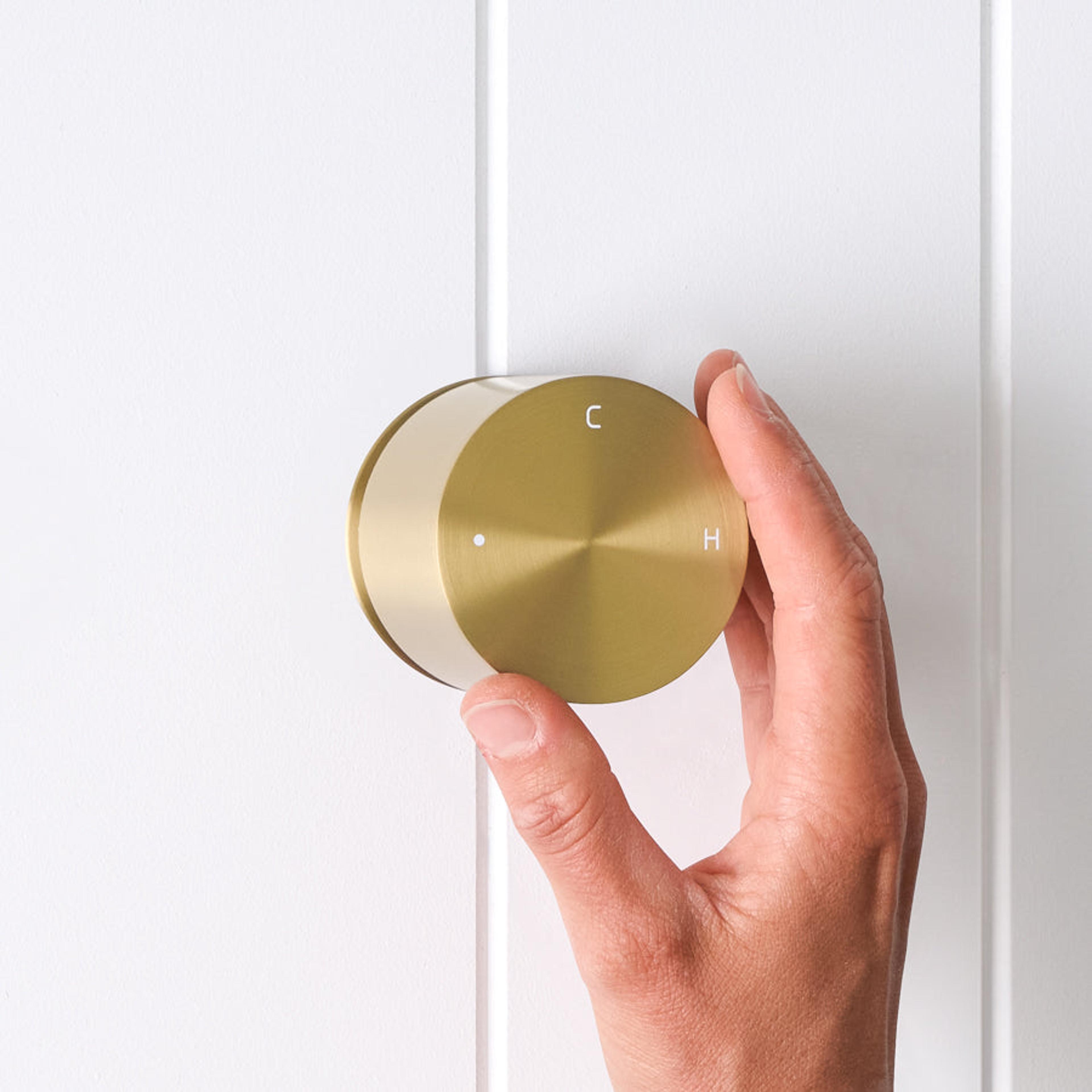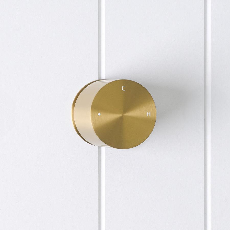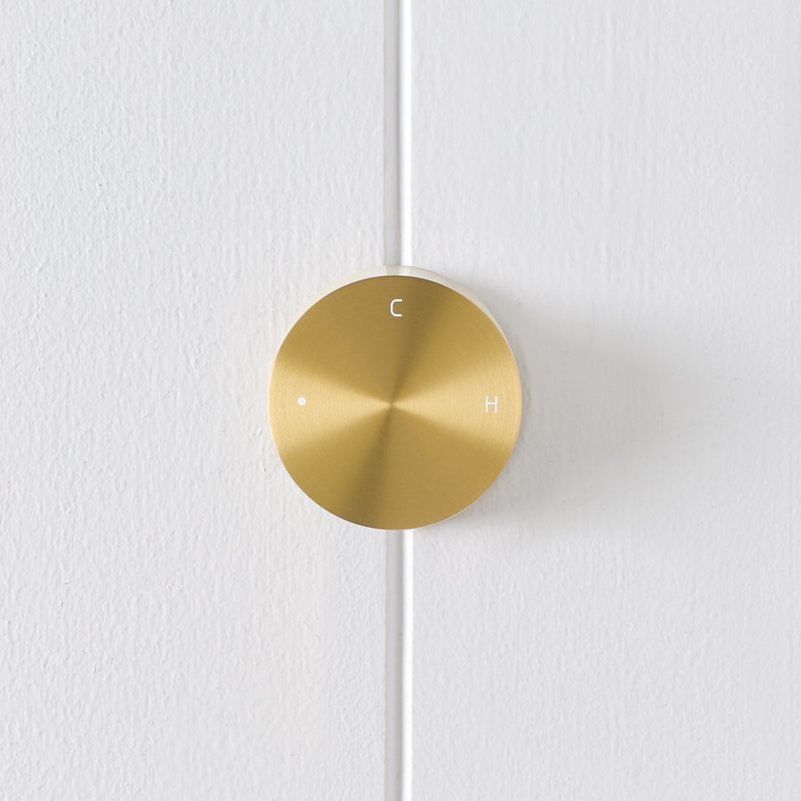 The Round Wall Progressive Mixer in Brushed Brass keeps the wall looking neat while giving you clear control. Turn the dial to start a light, cool stream, then keep turning until the pressure and warmth feel comfortable. A great match with brushed brass spouts and rails.